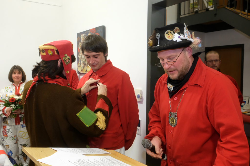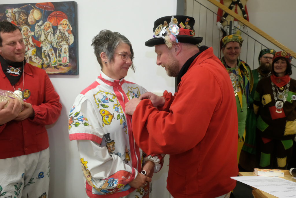 Andi Heine-Strahl, kam 1997 zur Haidgauer Narrenzunft und habe durch seine lockere Art schnell alle begeistert. 2002 kam er in den Ausschuss erst als Beisitzer und später wegen seines Sinns fürs Brauchtum und seiner künstlerischen Ader – er konnte auch Häser bemalen – wurde 2004 zum Maskenwart. Am Umzugstag leitete er immer die Bar, bei Auf- und Abbau bei Veranstaltungen sei er inach wie vor noch immer dabei. „Mit seiner lebenslustigen Art, aber doch au manchmol sehr bestimmt, schaute dr Kerle, dass des Brauchtum in Hoiga passt und ma sich in der Zunft benimmt.“ Auch beim Fasnetslader-Team mischt er immer mit. Seit einigen Jahren ist er auch Brauchtumspfleger auf höchster Ebene beim ANR, wo er auch mit Doris Bendel zusammenarbeitet. Diese war es dann auch, die das ANR-Präsidium darum bat, Andi Heine mit dem Verdienstorden des Alemannischen Narrenrings auszuzeichnen.