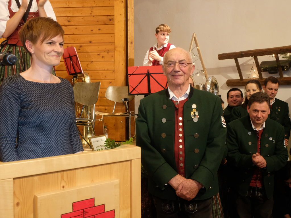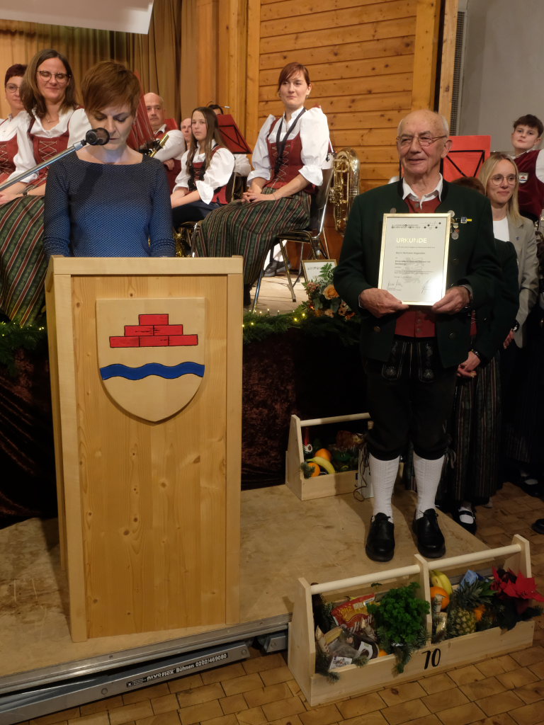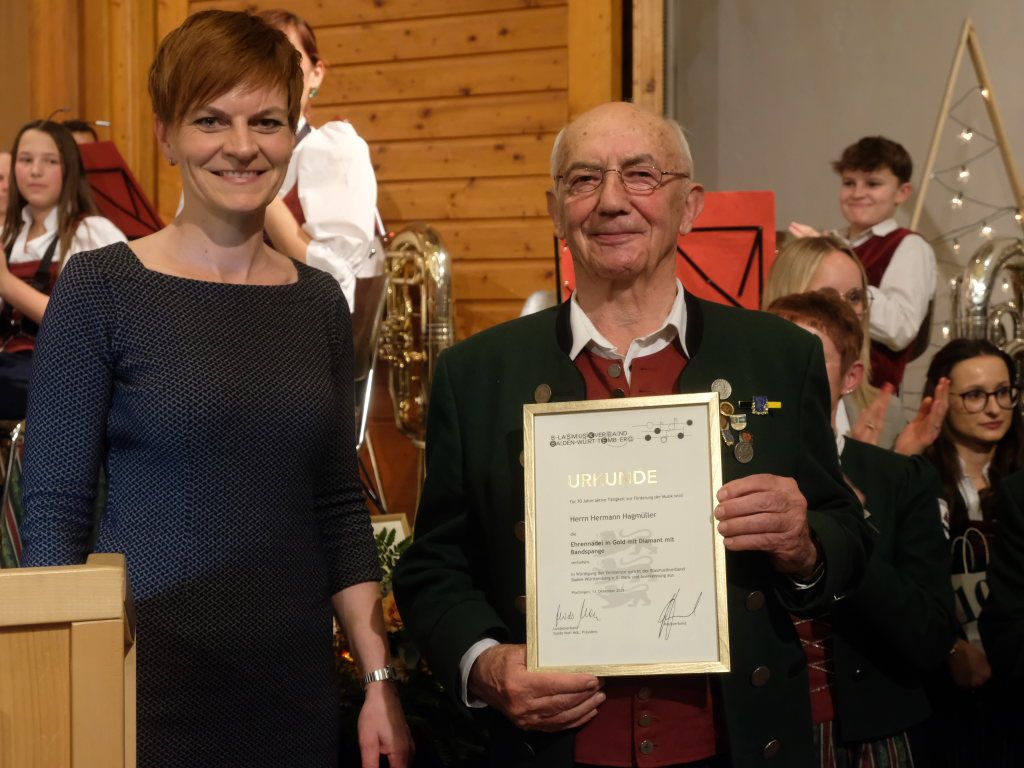 Eine ganz besondere Ehrung wurde Hermann Hagmüller zuteil: Für 70 Jahre als aktiver Musiker bei der Musikkapelle Ziegelbach durfte Dagmar Drumm ihn, dessen Instrument das Tenorhorn ist, mit der Ehrennadel in Platin mit Diamant auf Bandspange und Urkunde auszeichnen. Sie nannte dessen Engagement für die Musikkapelle, die er in dieser Zeit mitgeprägt hatte, schlichtweg sein Lebenswerk. Noch heute sei er eine Stütze des Orchesters, war viele Jahre Vizedirigent und noch vor Gründung der Jugendmusikschule in der Jugendausbildung aktiv. Er ließ sich auch von gesundheitlichen Rückschlägen nicht entmutigen und griff immer wieder zu seinem Tenorhorn. Er besteche durch seine ruhige, gelassene und besonnene Art, er sei ein engagierter und vorbildlicher Musikant. Trotz seiner Ernennung zum Ehrenmitglied im Jahre 2022 ist er noch gerne aktiv auch als Solist, früher auch im Kreisverbandsseniorenorchester, heute noch bei den Stadtkapellen-Oldies in Bad Waldsee.