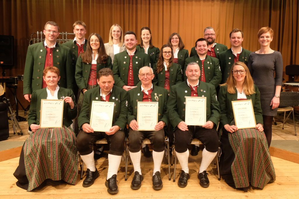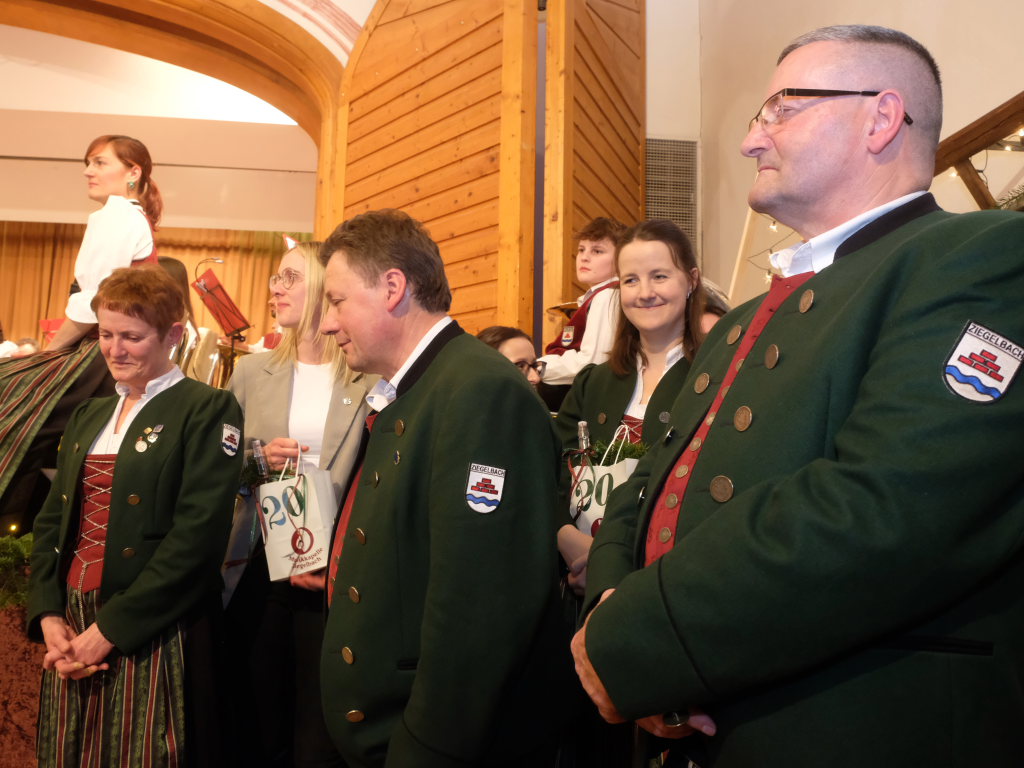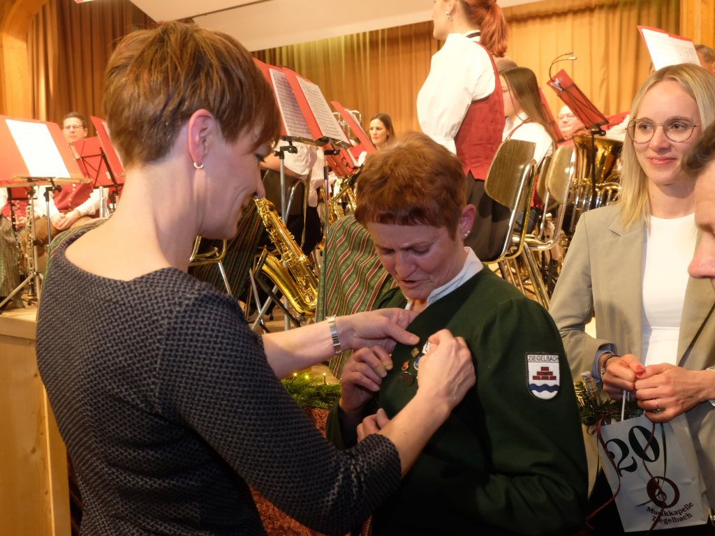 Ziegelbach – Im Namen des Blasmusikkreisverbandes Ravensburg durfte Dagmar Drumm, die seit dem vergangenen Jahr stellvertretende Kreisverbandsvorsitzende its, zuständig für den Bezirk Allgäu, im Rahmen des Jahreskonzertes der Musikkapelle Ziegelbach die Ehrungen von langjährigen Musikanten vornehmen, die zusammengenommen insgesamt 410 Jahre im Dienste der Blasmusik unterwegs waren.