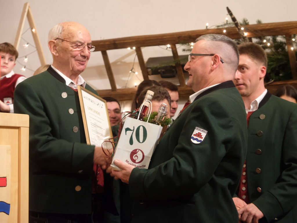 Was allerdings nur die Ehrungen des Blasmusikverbandes anging, denn mit Ernst Gut, der just an diesem Tag Geburtstag feierte, ehrte die Musikkapelle Ziegelbach noch einen ehemaligen Musiker aus ihren Reihen für annähernd 70 Jahre Musikantentätigkeit, der auch vielen jüngeren Mitmusikern als Vorbild diente.