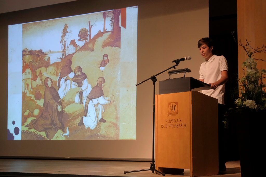 Nach einer kurzen Begrüßung durch die Bürgermeisterin eröffnete Alexander Sauter mit einem Referat zum Status der Religion jener Zeit die Vorträge des Geschichtskurses. Anton Patzner sprach über die Landwirtschaft jener Zeit, die zum größten Teil aus Getreideanbau bestand, zu dem ab dem 11. Jahrhundert der Anbau von Gemüse kam. Aylin Peker zeigte in ihrem Vortrag auf, wie die Menschen in dieser Zeit lebten: So gab es in dieser Zeit kaum Häuser mit verglasten Fenstern, weil Glas damals noch so teuer war. Else Bolsinger und Ronja Forderer hielten ein Zwiegespräch über die medizinischen Verhältnisse in Zeiten der Pest und der durch die Kreuzzüge eingeschleppte Lepra. Sie verwiesen auf die damals nicht nur in Wurzach entstandenen Siechenhäuser.