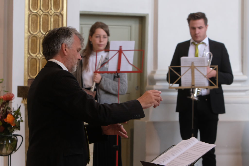 Mit einem solchen setzten die jungen Musiker auch ihr Konzert fort: Auf den „Choral St. Antoni“ des berühmteren Joseph Haydn ließen die aktuellen Schlossbläser das „Timete Dominum“ des weniger bekannten, fünf Jahre jüngeren Michael Haydn erklingen. Mit „Cibel“ des Barock-Komponisten und -Flötisten Jean Baptiste Loeillet setzten sie ihre Konzertreise fort. Mit ihrem letzten Stück, „Schlossfanfare Nr. 2“ setzten sie ein musikalisches Ausrufezeichen: Es ist eine Komposition von Peter Schad, der viele Jahre am Salvatorkolleg als Lehrer tätig war und die „Schlossbläser“ einstens ins Leben rief.