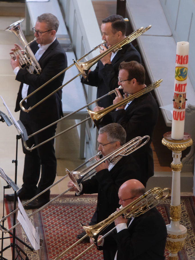 Nach Gustaf Holst´ Hymne in einer sehr melodischen Umsetzung gab es einen besonderen Höhepunkt des Konzertes: Die vier Posaunen spielten mit dem jazzig angehauchten Traditional The battle of Jericho die musikalische Umsetzung der biblischen „Posaunen von Jericho“. Mit der Canzoni seconda von Giovanni Gabrieli, eines der bekanntesten Vertreter der Venezianischen Schule, hatten Peter Schad und seine Musiker einen weiteren Komponisten aus der Zeit des Übergangs von Renaissance zum Barock im Programm.