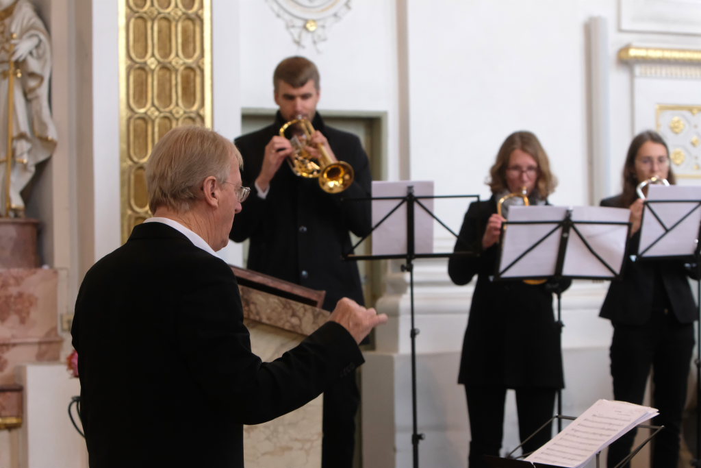Peter Schad eröffnete mit seinen ehemaligen Schlossbläsern seinen Konzertteil mit der „Canzona 9“ des Spät-Renaissance-Komponisten Constanzo Antegnati. Nach der sehr getragen gespielten Motette „Locus Iste“ des vor allem für seine Improvisationen bewunderten österreichischen Komponisten und Organisten Anton Bruckner, dessen elf Sinfonien bis weit ins 20. Jahrhundert musikalisch nachhallten, spielten die 13 Musiker das „Canzone für zwei Chöre“ des Antegnati-Zeitgenossen C. Gussago. Dabei standen sich die „Trompeten-Chöre“ gegenüber und vollführten ein reizvolles Wechselspiel. Feierlich ging es danach weiter mit „Denn er hat seinen Engeln befohlen“ von Felix Mendelssohn Bartholdy.