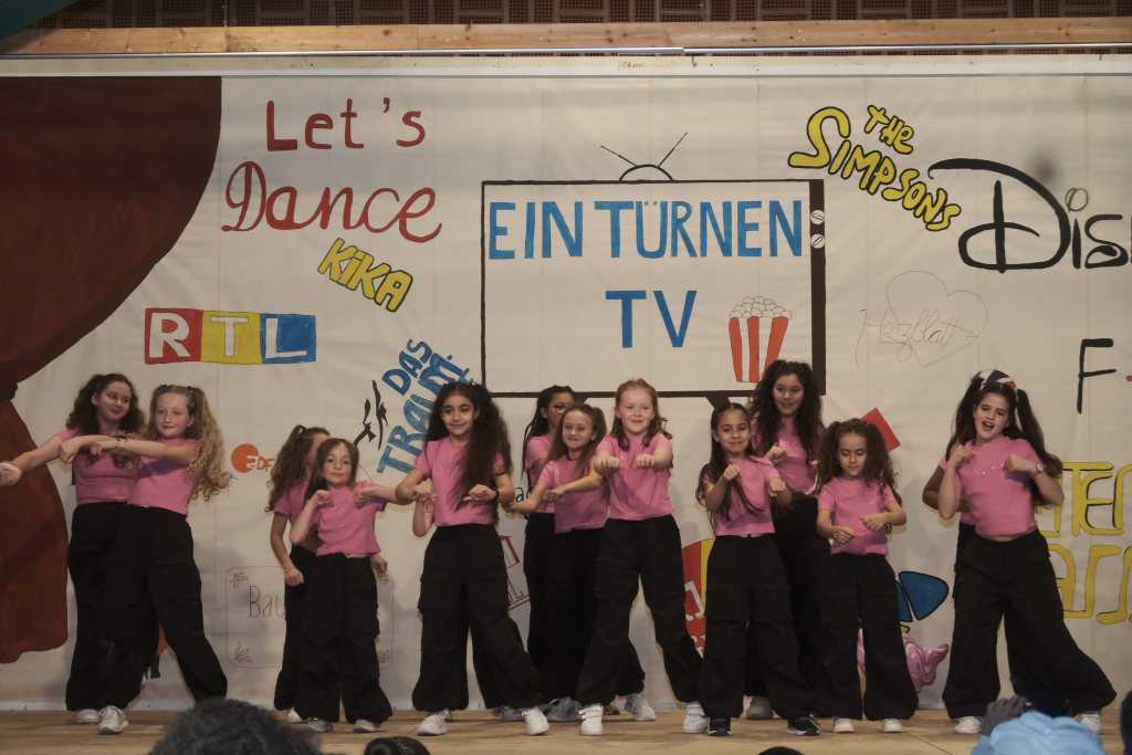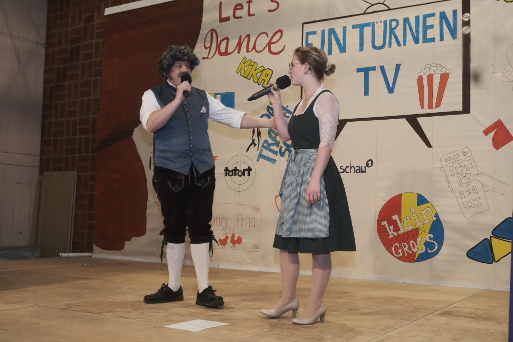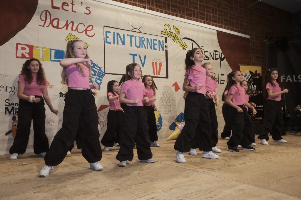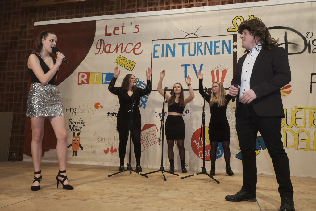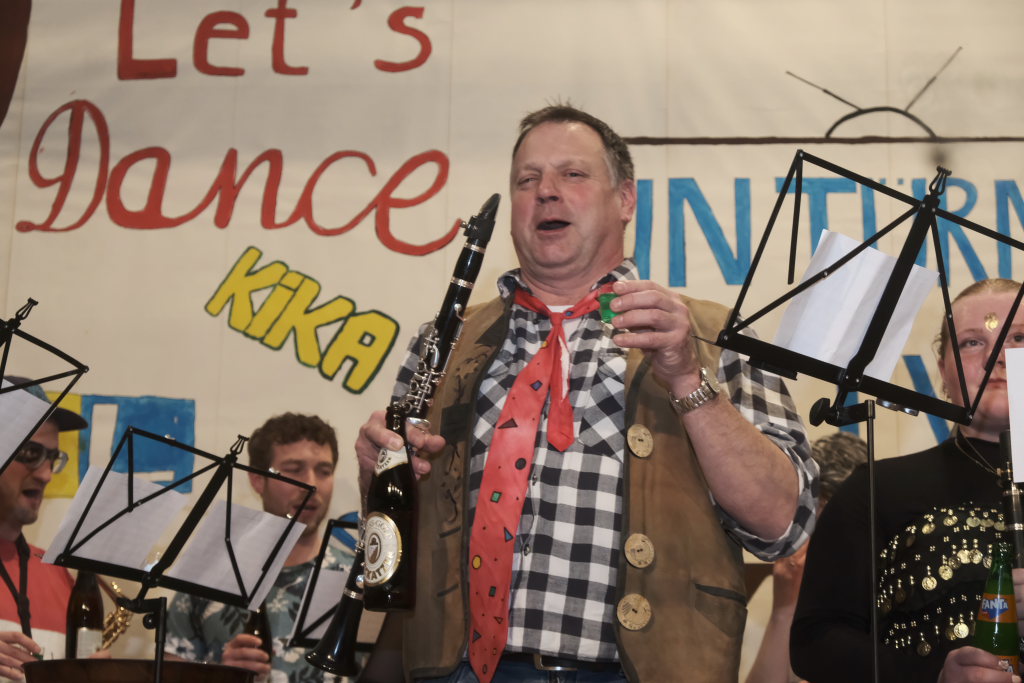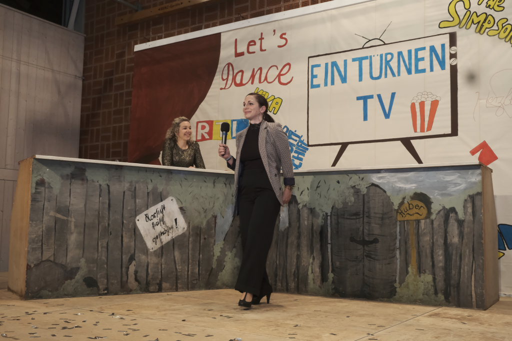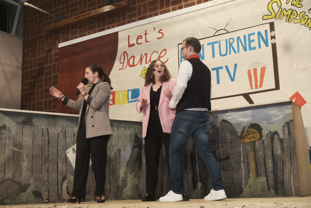 Traditionell eröffnete die Musikkapelle musikalisch den Ball. In diesem Jahr, weil sich beim Ball alles um das Thema Fernsehen drehte, natürlich mit der Eurovisionsmelodie, die in früheren Zeiten bei gemeinsamen Liveübertragungen von Deutschland, Österreich und der Schweiz wie bei „Wetten dass?“ üblich war. Gefolgt von einem Medley, in dem die Erkennungsmelodien von Derrick, Der Alte, Wetten dass und das Intro der Tagesschau zusammengefasst wurden. Vom Typ her hätte man eher auf „Schwere Jungs“ getippt, was da als Cordula Grün vor der Bühne hin und her sauste – schwer war allerdings vor allem sein Instrument. Weiter ging es mit den kleinsten Nachwuchstänzerinnen von Bliems Bunte Bühne, die eine fetzige Tanzperformance auf die Bühnenbretter legten, ehe Frank Binzer und Amelie Stephan als Vater und Tochter auf dem „heimischen“ Sofa im hinteren Teil der Halle ruhend aus dem Off das Fernsehprogramm bzw. Ballprogramm bestimmten, während Heinz Schele auf der Bühne den Programmansager gab, den es genauso wie die Sendepause in den Frühzeiten des Fernsehens noch gab.