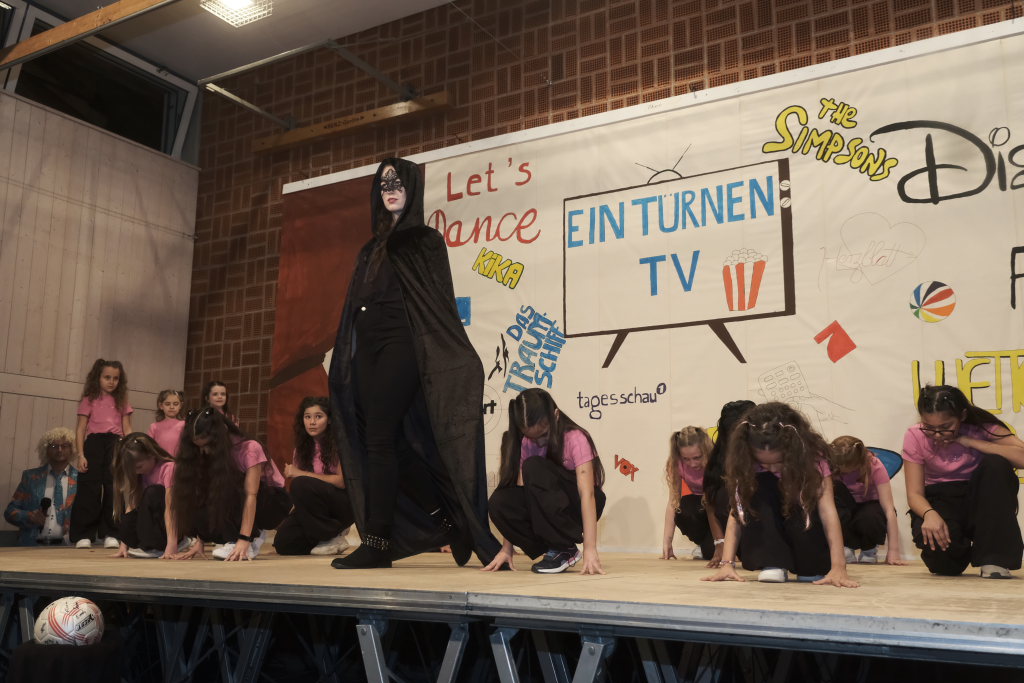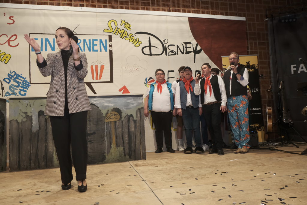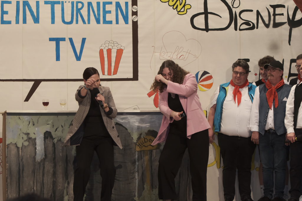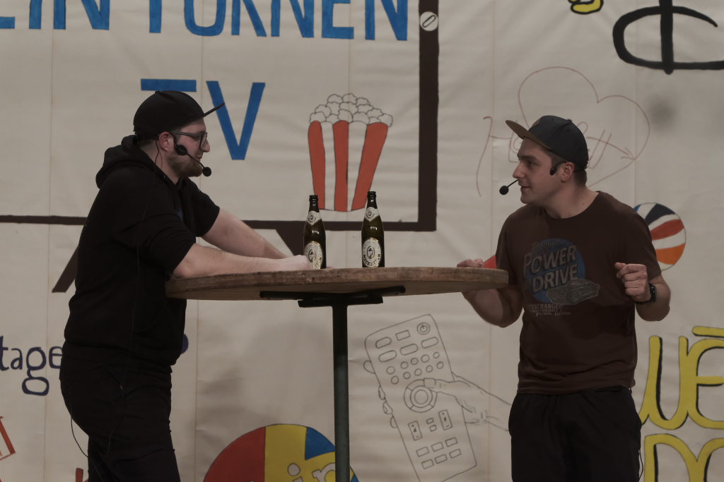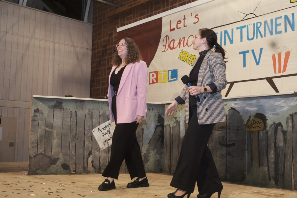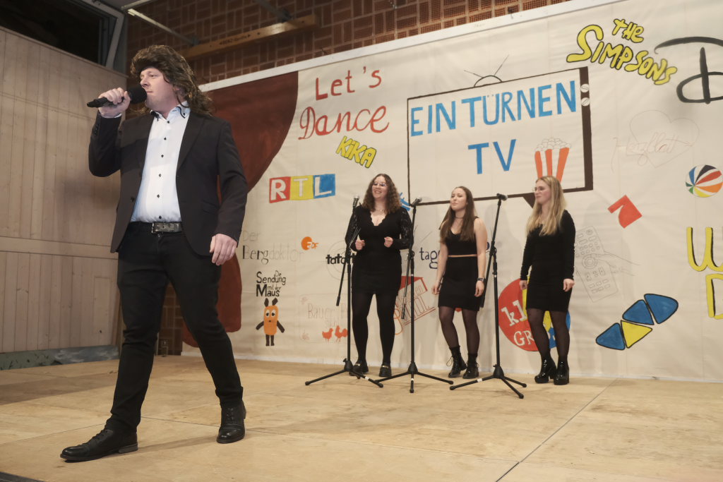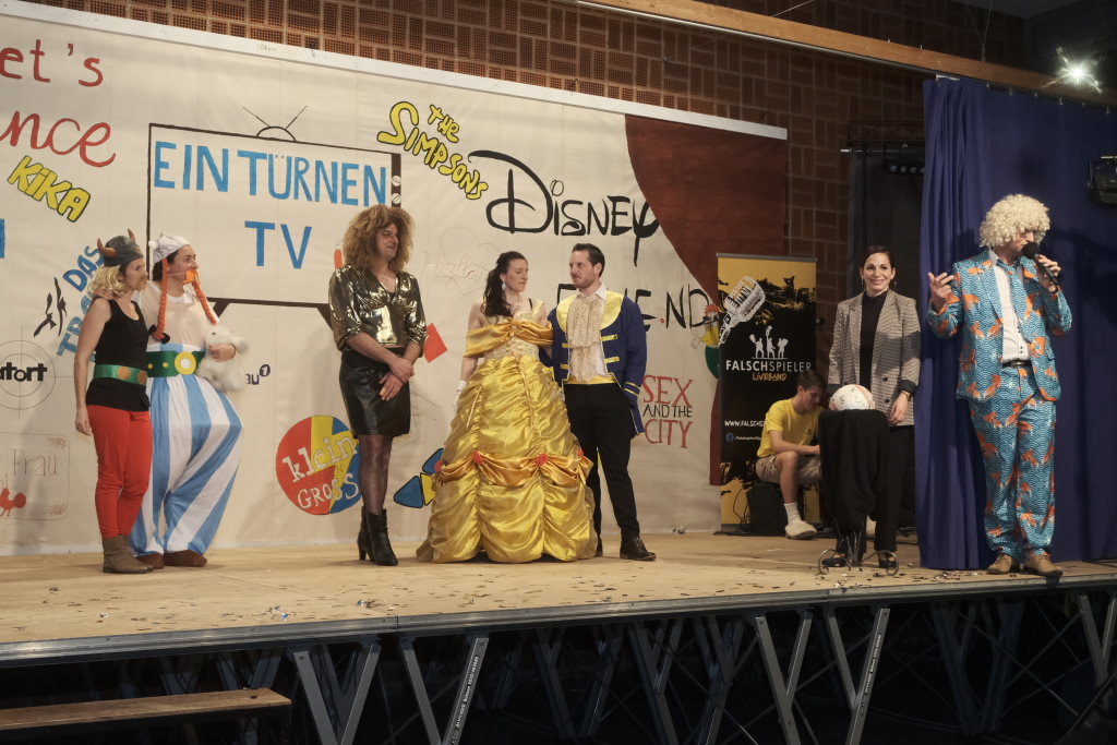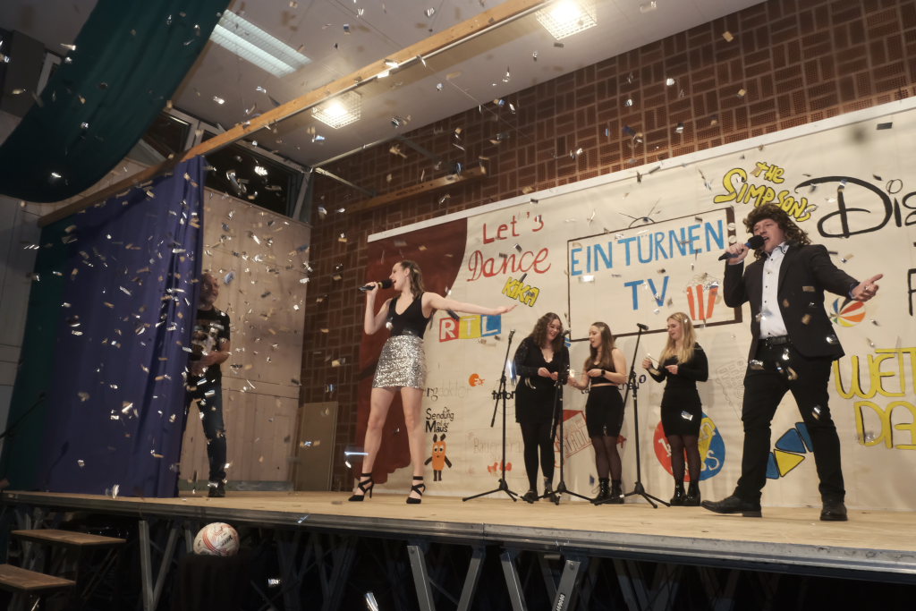 Traditionell eröffnete die Musikkapelle musikalisch den Ball. In diesem Jahr, weil sich beim Ball alles um das Thema Fernsehen drehte, natürlich mit der Eurovisionsmelodie, die in früheren Zeiten bei gemeinsamen Liveübertragungen von Deutschland, Österreich und der Schweiz wie bei „Wetten dass?“ üblich war. Gefolgt von einem Medley, in dem die Erkennungsmelodien von Derrick, Der Alte, Wetten dass und das Intro der Tagesschau zusammengefasst wurden. Vom Typ her hätte man eher auf „Schwere Jungs“ getippt, was da als Cordula Grün vor der Bühne hin und her sauste – schwer war allerdings vor allem sein Instrument. Weiter ging es mit den kleinsten Nachwuchstänzerinnen von Bliems Bunte Bühne, die eine fetzige Tanzperformance auf die Bühnenbretter legten, ehe Frank Binzer und Amelie Stephan als Vater und Tochter auf dem „heimischen“ Sofa im hinteren Teil der Halle ruhend aus dem Off das Fernsehprogramm bzw. Ballprogramm bestimmten, während Heinz Schele auf der Bühne den Programmansager gab, den es genauso wie die Sendepause in den Frühzeiten des Fernsehens noch gab.