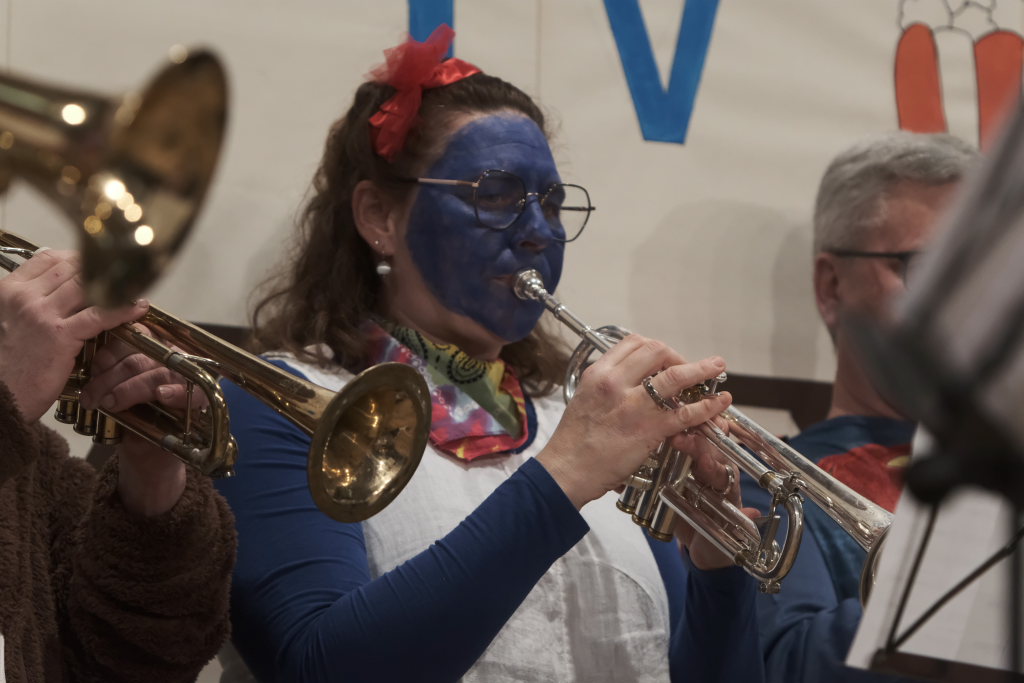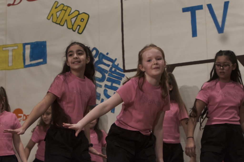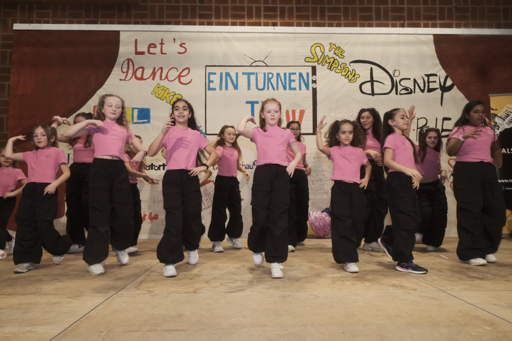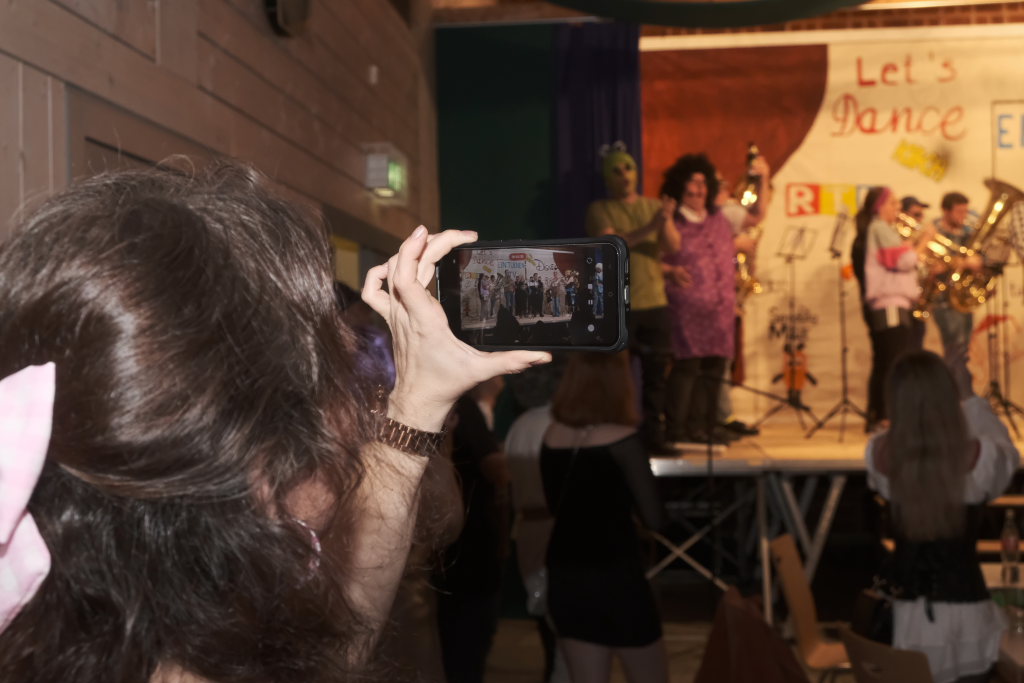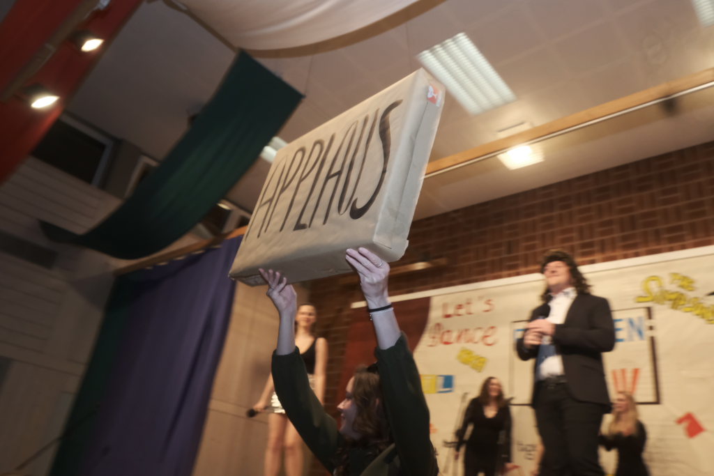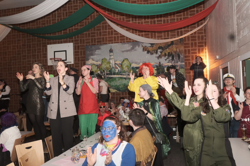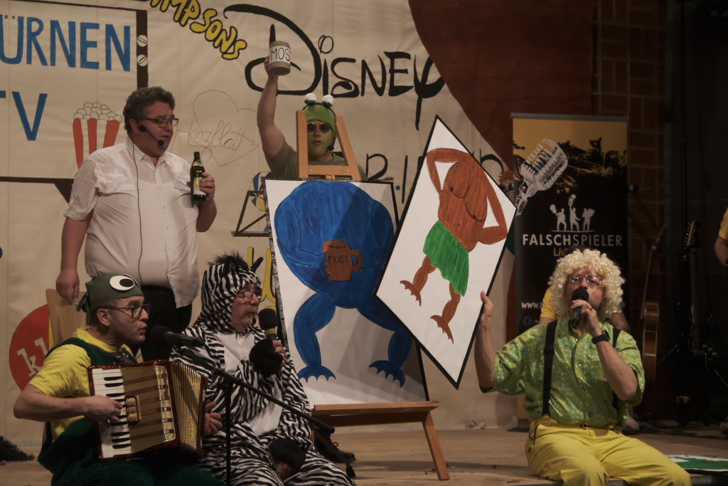 Traditionell eröffnete die Musikkapelle musikalisch den Ball. In diesem Jahr, weil sich beim Ball alles um das Thema Fernsehen drehte, natürlich mit der Eurovisionsmelodie, die in früheren Zeiten bei gemeinsamen Liveübertragungen von Deutschland, Österreich und der Schweiz wie bei „Wetten dass?“ üblich war. Gefolgt von einem Medley, in dem die Erkennungsmelodien von Derrick, Der Alte, Wetten dass und das Intro der Tagesschau zusammengefasst wurden. Vom Typ her hätte man eher auf „Schwere Jungs“ getippt, was da als Cordula Grün vor der Bühne hin und her sauste – schwer war allerdings vor allem sein Instrument. Weiter ging es mit den kleinsten Nachwuchstänzerinnen von Bliems Bunte Bühne, die eine fetzige Tanzperformance auf die Bühnenbretter legten, ehe Frank Binzer und Amelie Stephan als Vater und Tochter auf dem „heimischen“ Sofa im hinteren Teil der Halle ruhend aus dem Off das Fernsehprogramm bzw. Ballprogramm bestimmten, während Heinz Schele auf der Bühne den Programmansager gab, den es genauso wie die Sendepause in den Frühzeiten des Fernsehens noch gab.