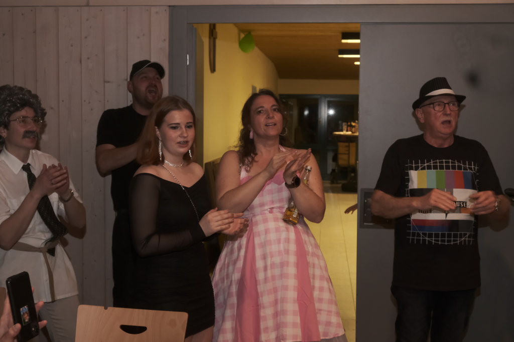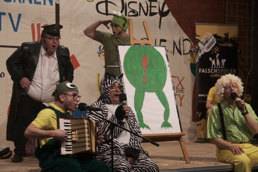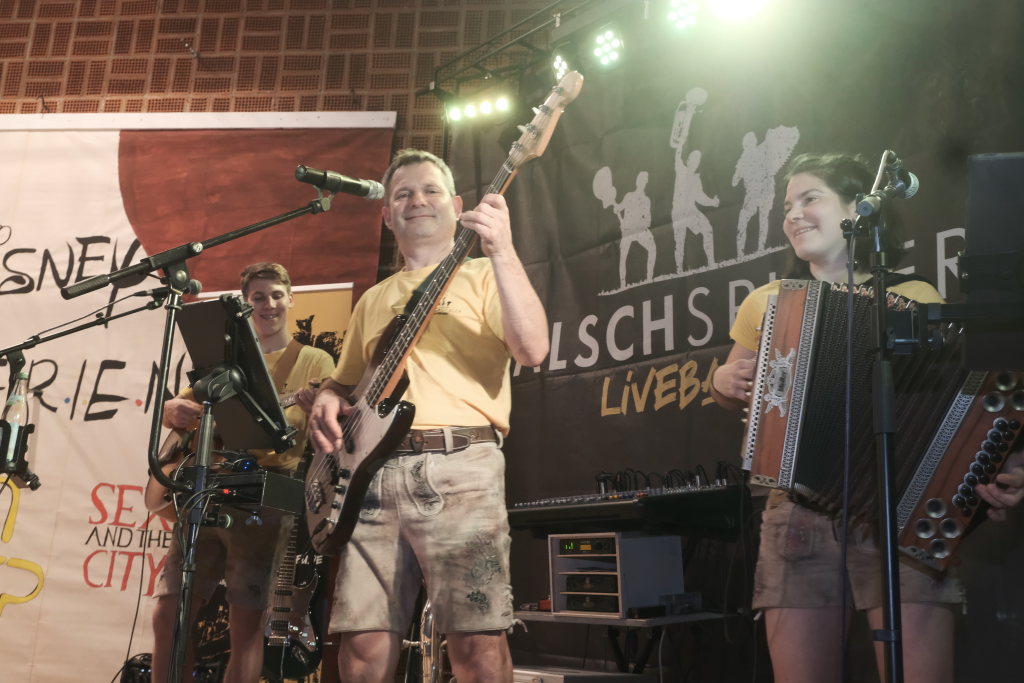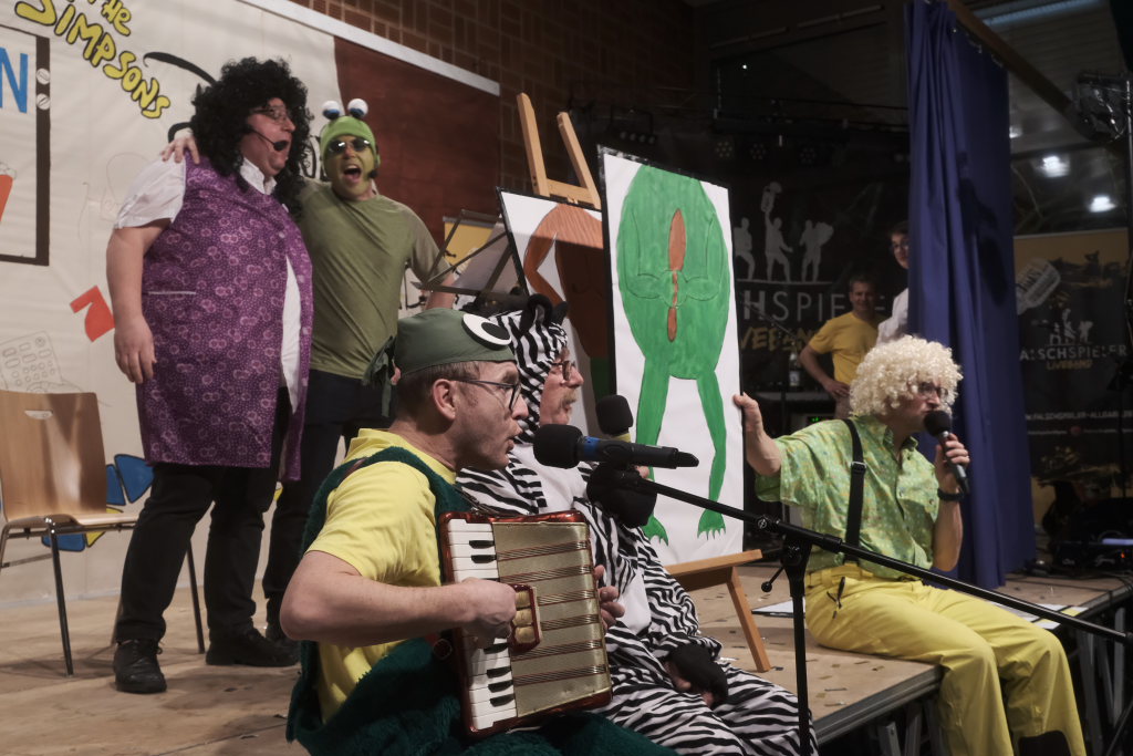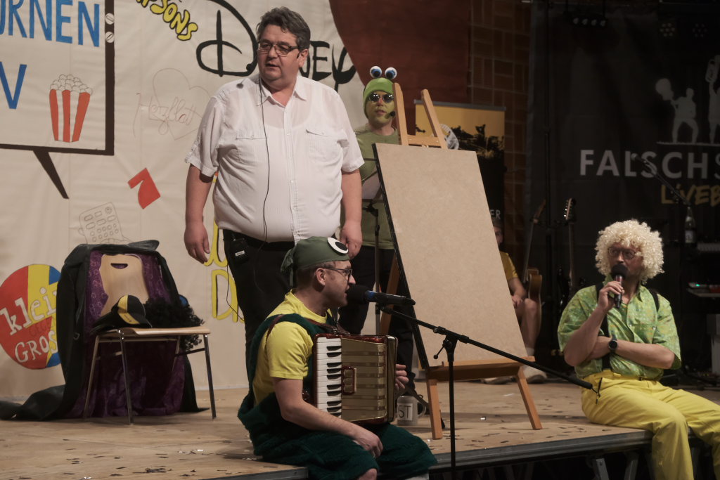 Da staunte Heinz Schele nicht schlecht: Rund 25 Musiker standen am Programm-Ende auf der Bühne – samt Noten, Notenständer und Leihinstrumenten, bereit, den Stimmungsklassiker anzustimmen. Und der ganze Saal sang mit. Natürlich gab es noch eine Zugabe, nein sogar zwei: Neben der Vogelwiese stimmte die „Band“ noch „Ein Prosit der Gemütlichkeit“ an. Danach übernahm die Band „Die Falschspieler“ das musikalische Zepter, die schon während der Umbaupausen für Partystimmung gesorgt hatte. Ein großes Schild verwies auf die Aftershow-Party, die es nach jeder Unterhaltungssendung gibt und zum Fernsehen dazugehört wie die Fernbedienung…