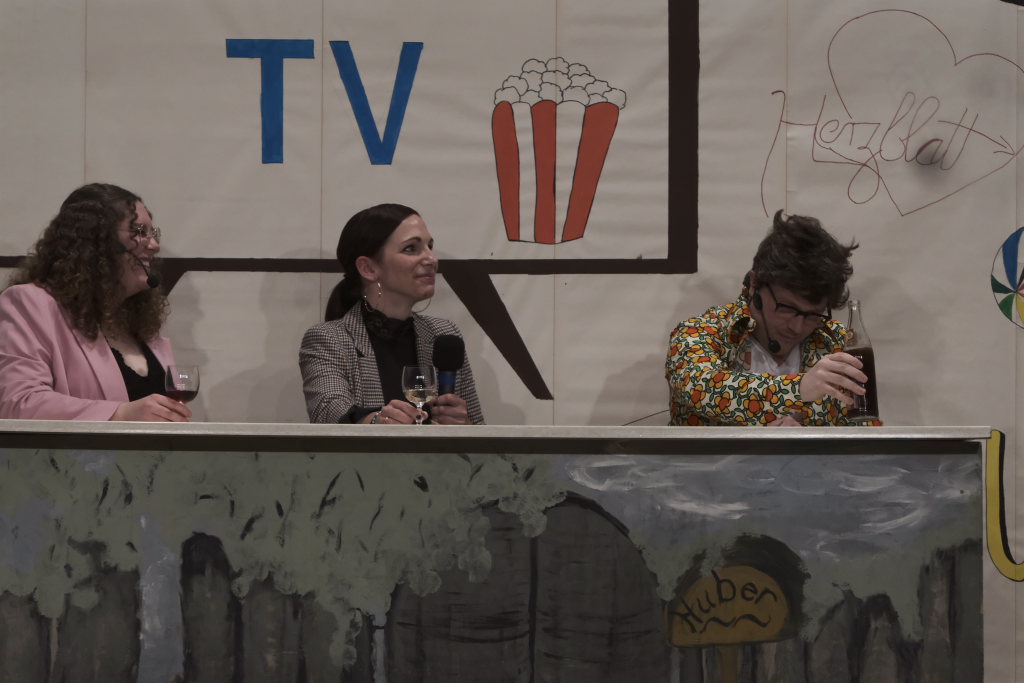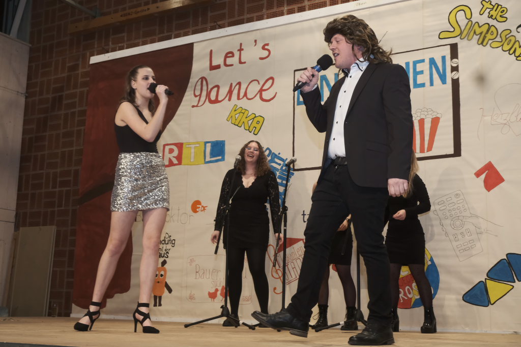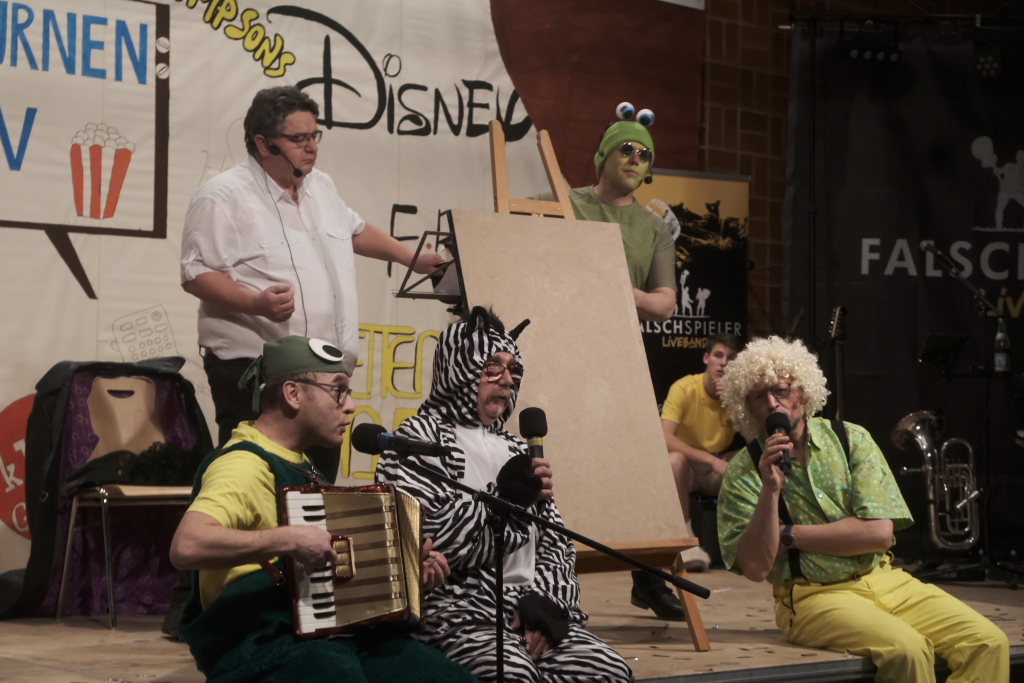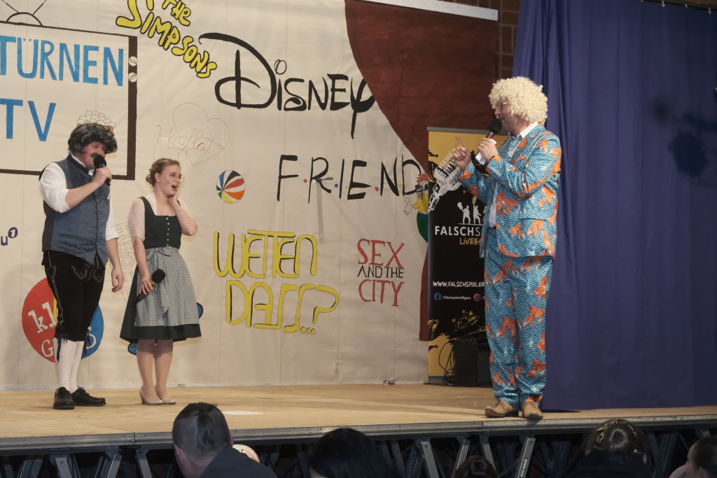 Zapp: Auf zur klassischen Samstagabendunterhaltung mit „Wetten dass?“ und (Heinz-)Thomas Gottschalk(-Schele). Dieser wettete, dass die „Gastmusiker“ im Saal es nicht schaffen werden, am Ende des Programms auf geliehenen Instrumenten den Stimmungsmusik-Klassiker „Die Vogelwiese“ spielen zu können. Das war Fernseh-Tochter Amelie dann doch zu bieder, und so zappte sie weiter zur Helene-Fischer- Show, gerade rechtzeitig, um das große Duett mit Peter Maffay (Florian Weber) und der Sängerin selbst (Rosa Schöllhorn) samt Background-Chor zu erleben.