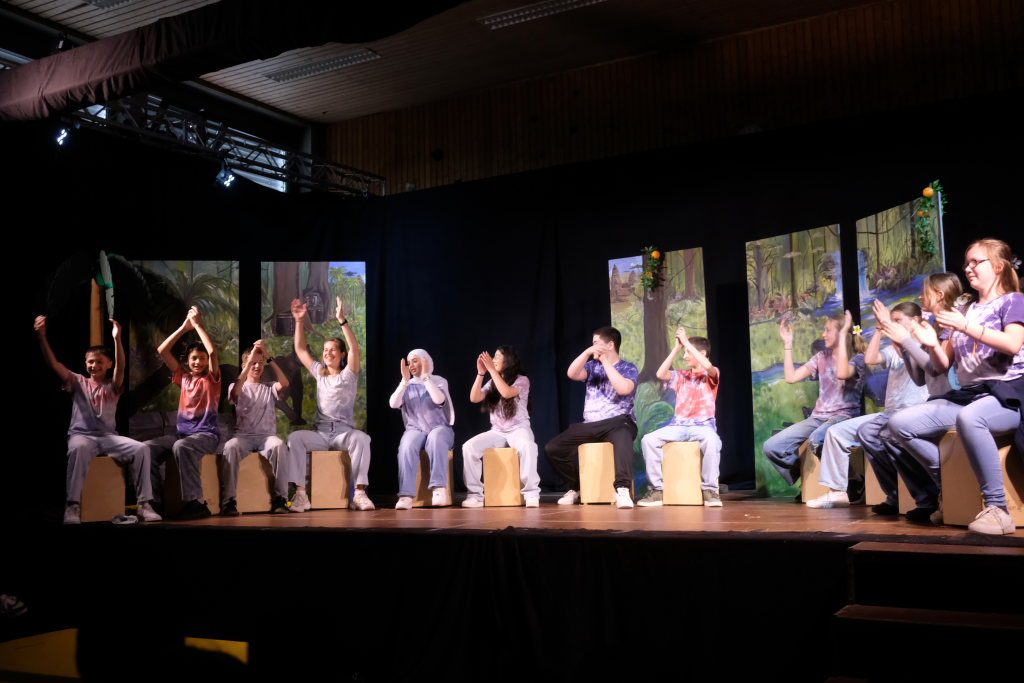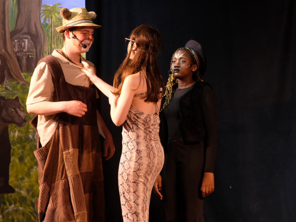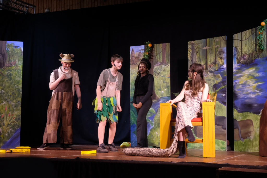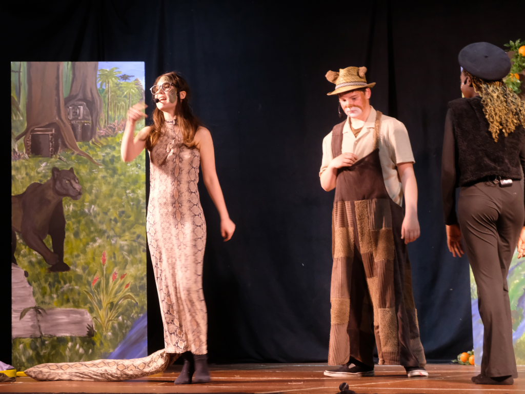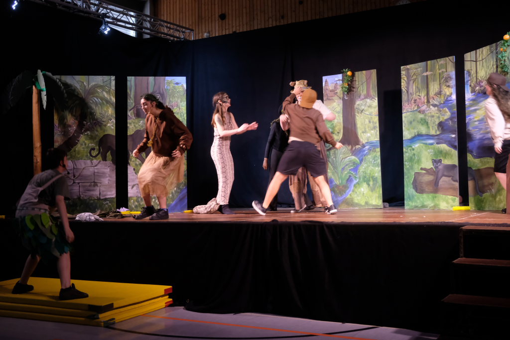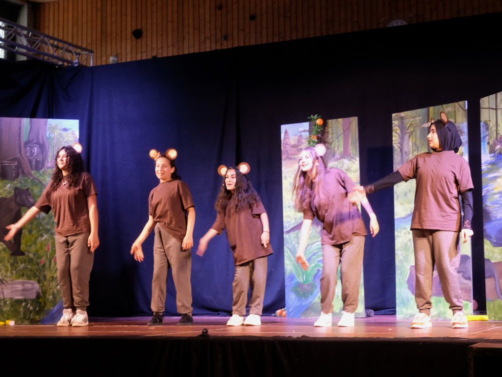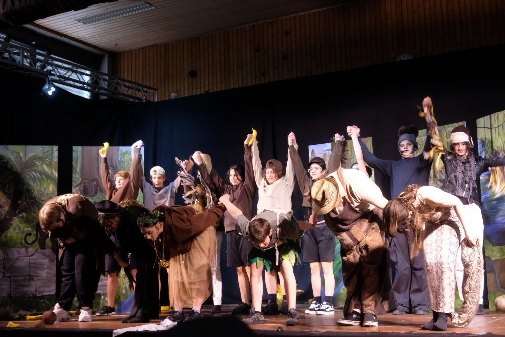 Jedes Kind kennt die Geschichte von Mogli, Balu, Baghira, Kaa und Shir Khan und Co. Aber das, was Luan Blini als quirliger und kluger Mogli, Nic Binder als der gemütliche Bär Balu, Rayana Ouro-Gouni als der faszinierende Panther Bhagira, Maren Distel als die ohne Brille fast blinde Python Kaa und Matthias Swoboda als der im ganzen Dschungel gefürchtete Tiger Shir Khan boten, war schon ein besonderes (Schul-Theater)-Erlebnis. Nicht zu vergessen die Wölfischen Zieheltern von Mogli, Akela (Adam Wesolowski) und Rashka (Lina Madlener), Queen Lui (Melissa Stefanovici) mit ihrem Affenvolk (Luca Friedl, Mike Pol, Alya Uludag, Beline Qaso und Celin Fida). Und die beiden Geier Buglem Dursun und Benjamin Braun, die auf ihrem „Hochsitz“ hockend alles im Blick hatten.