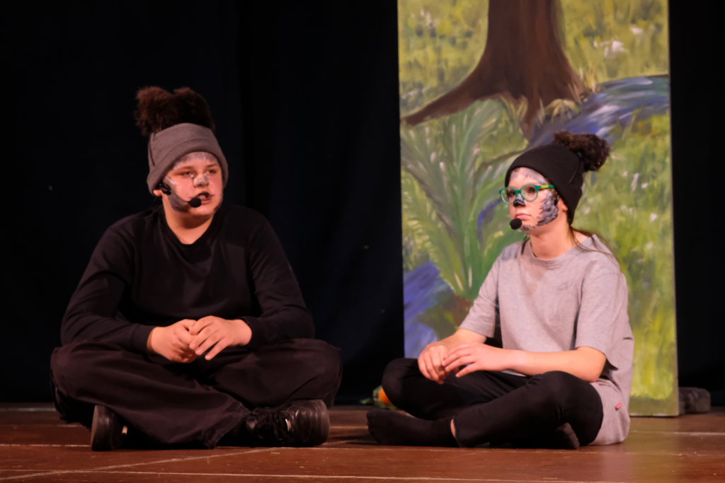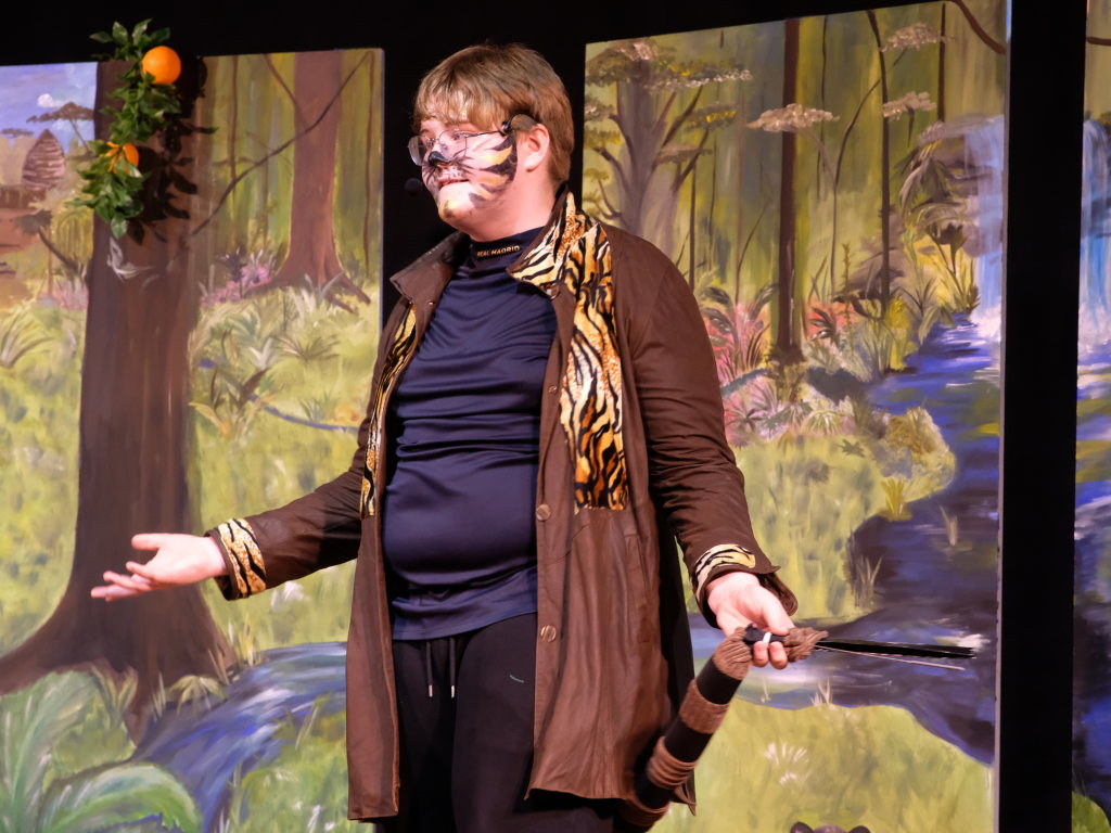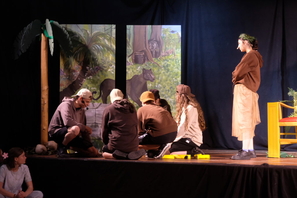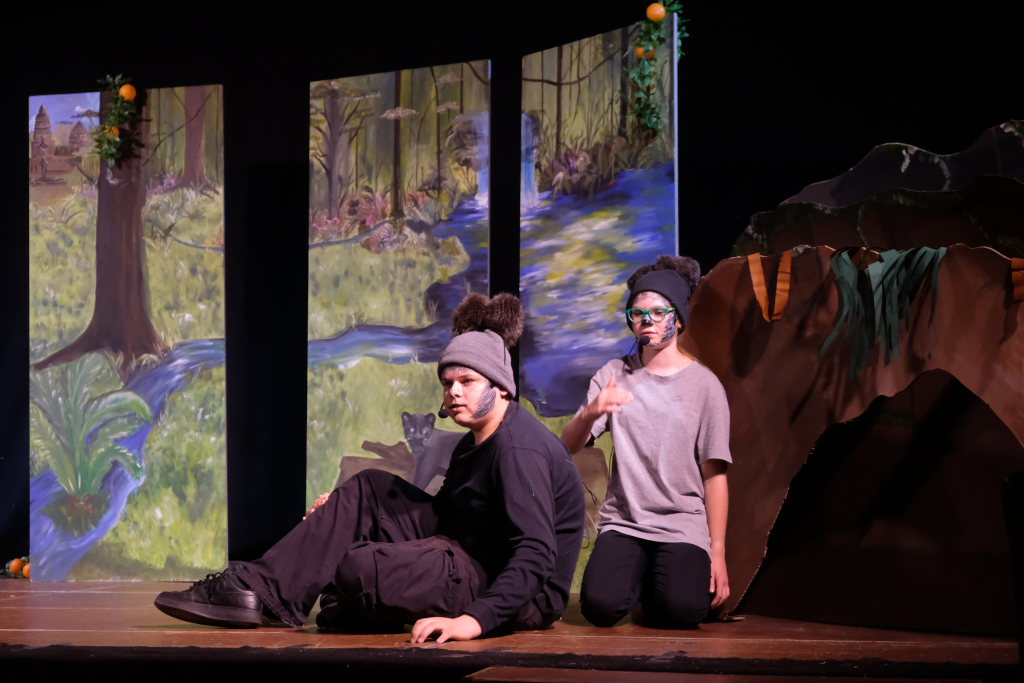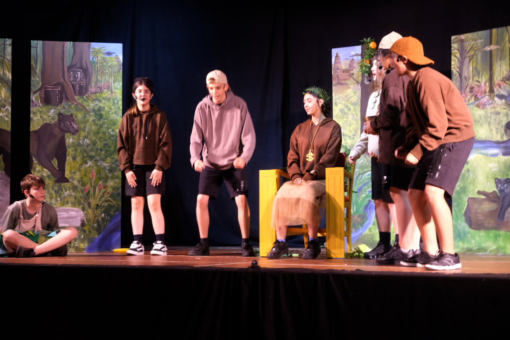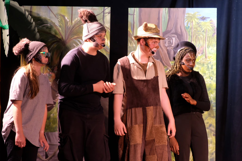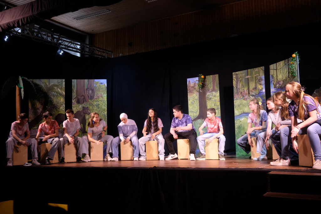 Jedes Kind kennt die Geschichte von Mogli, Balu, Baghira, Kaa und Shir Khan und Co. Aber das, was Luan Blini als quirliger und kluger Mogli, Nic Binder als der gemütliche Bär Balu, Rayana Ouro-Gouni als der faszinierende Panther Bhagira, Maren Distel als die ohne Brille fast blinde Python Kaa und Matthias Swoboda als der im ganzen Dschungel gefürchtete Tiger Shir Khan boten, war schon ein besonderes (Schul-Theater)-Erlebnis. Nicht zu vergessen die Wölfischen Zieheltern von Mogli, Akela (Adam Wesolowski) und Rashka (Lina Madlener), Queen Lui (Melissa Stefanovici) mit ihrem Affenvolk (Luca Friedl, Mike Pol, Alya Uludag, Beline Qaso und Celin Fida). Und die beiden Geier Buglem Dursun und Benjamin Braun, die auf ihrem „Hochsitz“ hockend alles im Blick hatten.