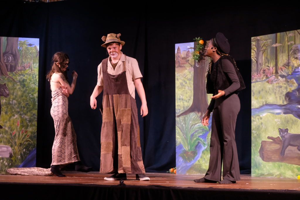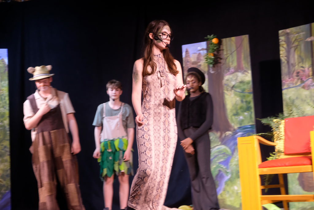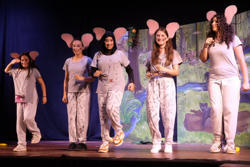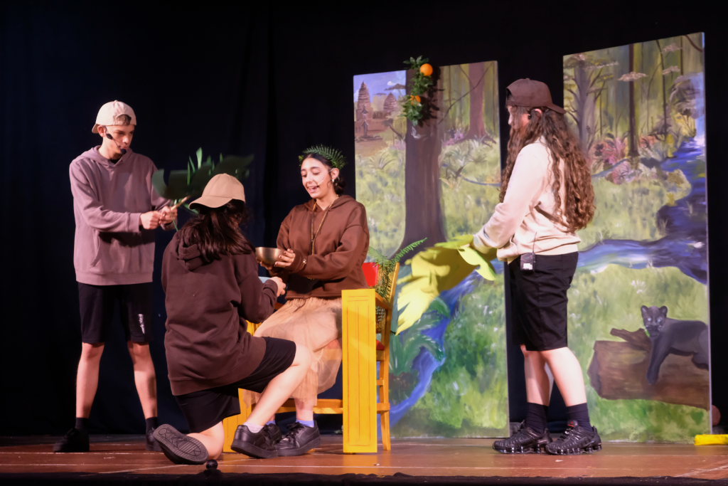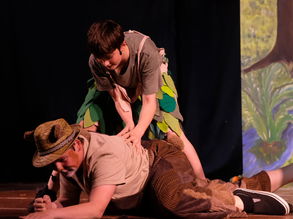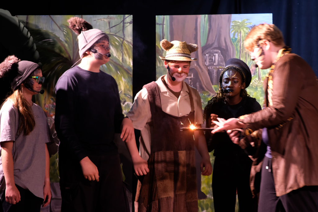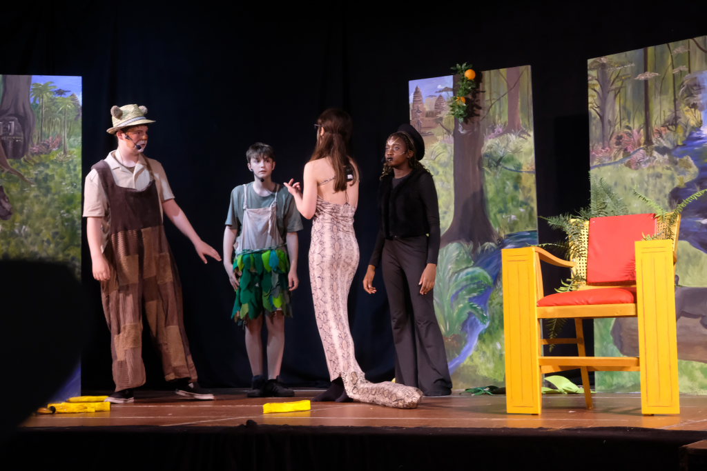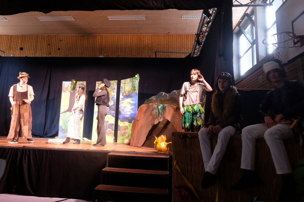 Jedes Kind kennt die Geschichte von Mogli, Balu, Baghira, Kaa und Shir Khan und Co. Aber das, was Luan Blini als quirliger und kluger Mogli, Nic Binder als der gemütliche Bär Balu, Rayana Ouro-Gouni als der faszinierende Panther Bhagira, Maren Distel als die ohne Brille fast blinde Python Kaa und Matthias Swoboda als der im ganzen Dschungel gefürchtete Tiger Shir Khan boten, war schon ein besonderes (Schul-Theater)-Erlebnis. Nicht zu vergessen die Wölfischen Zieheltern von Mogli, Akela (Adam Wesolowski) und Rashka (Lina Madlener), Queen Lui (Melissa Stefanovici) mit ihrem Affenvolk (Luca Friedl, Mike Pol, Alya Uludag, Beline Qaso und Celin Fida). Und die beiden Geier Buglem Dursun und Benjamin Braun, die auf ihrem „Hochsitz“ hockend alles im Blick hatten.