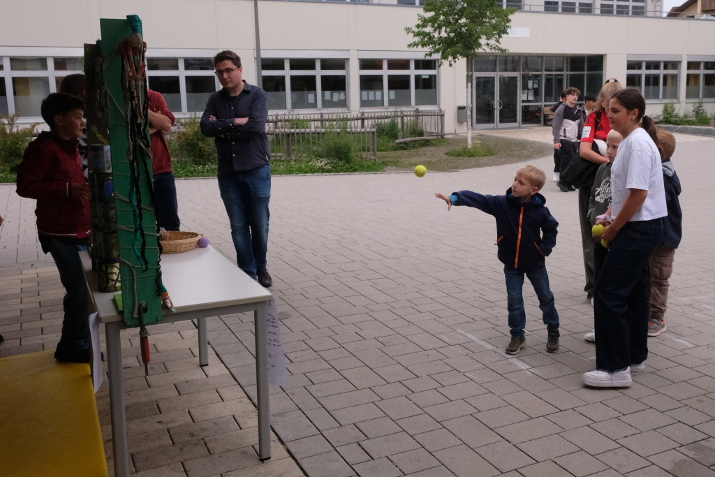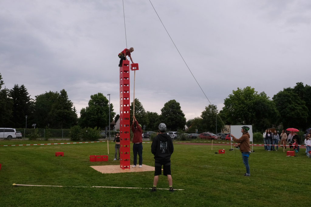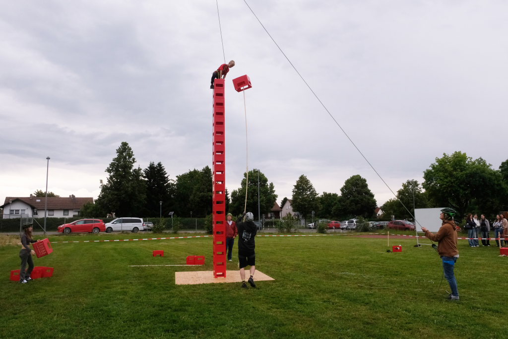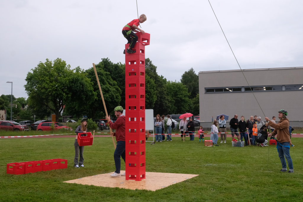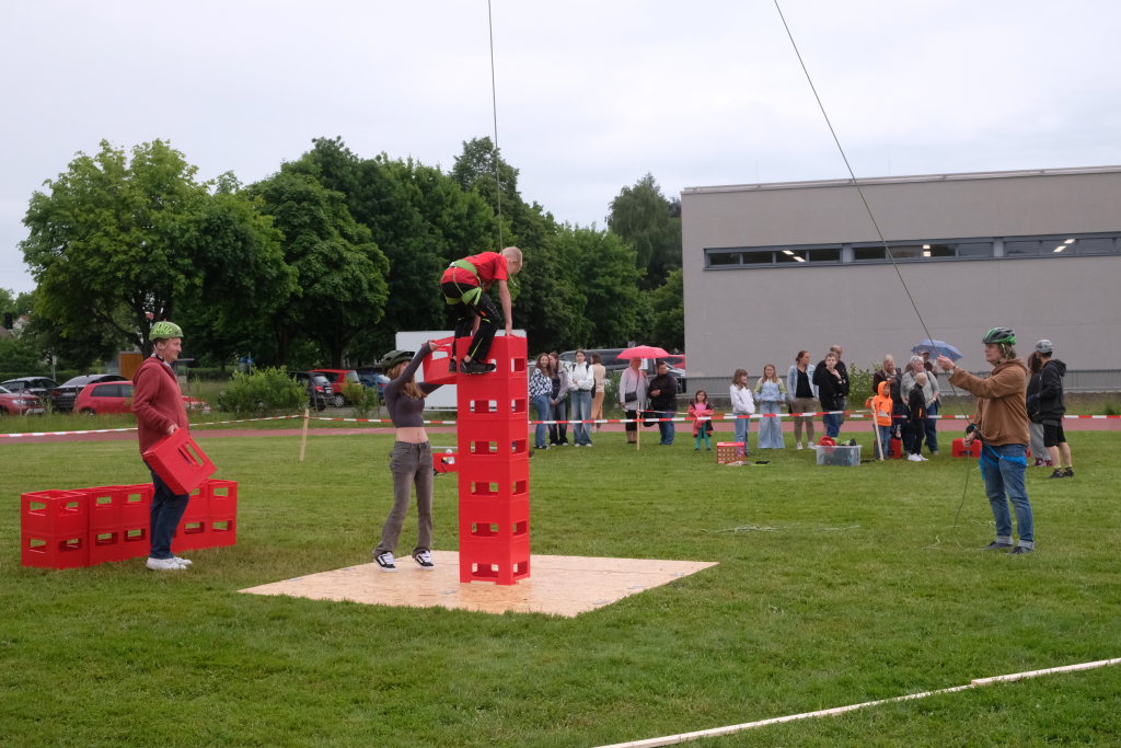 Zwischen den Aufführungen gab es im Rahmen des Schulfestes aber noch weitere Aktionen und Attraktionen. Auch die Schule baute ihren Turm: Diverse Schüler oder auch Familienangehörige versuchten sich am Turmbau aus Bierkisten. Teilweise erreichten die „Baumeister“ schwindelerregende Höhen, für welche sich die Helfer sich trotz Hilfestangen mächtig strecken mussten, während Türmlesbauer nach dem Kippen desselben am Seil eines Manitou hängend und gesichert sanft zu Boden schwebten. Im Popcorn-Club gab es dank des Urgesteins Edmund Butscher – natürlich Popcorn – via Katapultschleuder zu erwerfen. Nicht fehlen durfte am Schulhofeingang natürlich das beliebte Dosenwerfen.