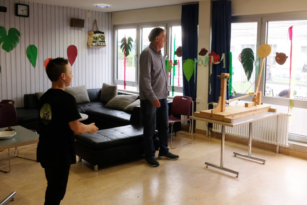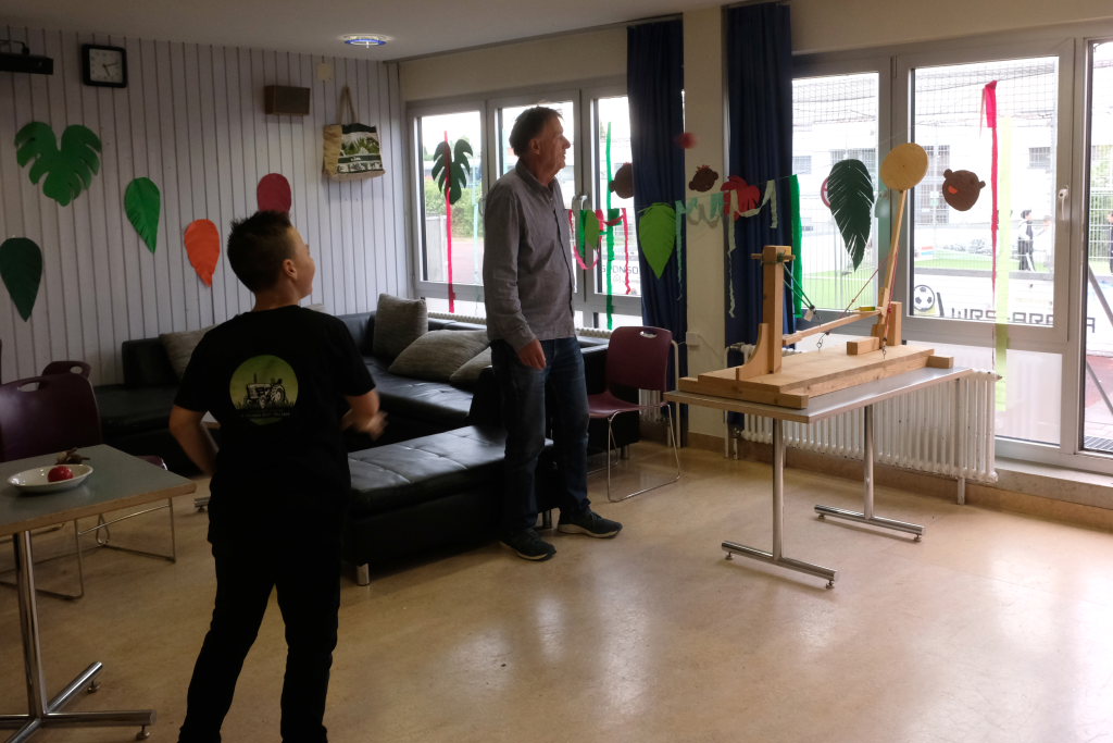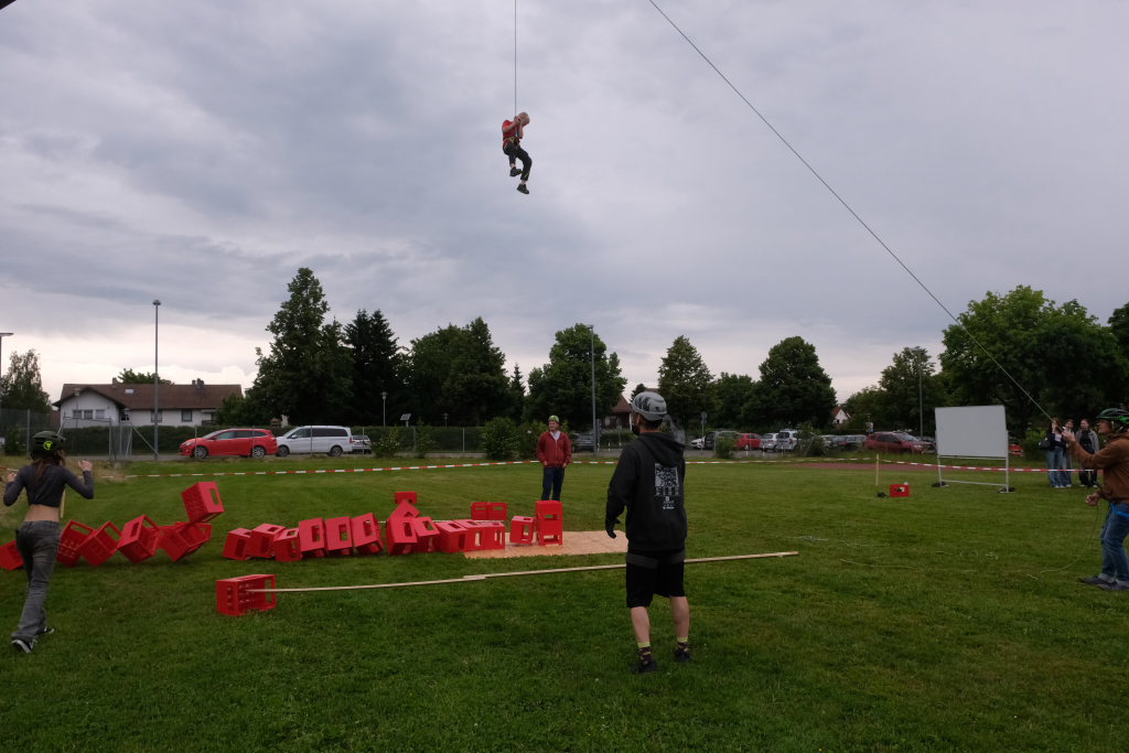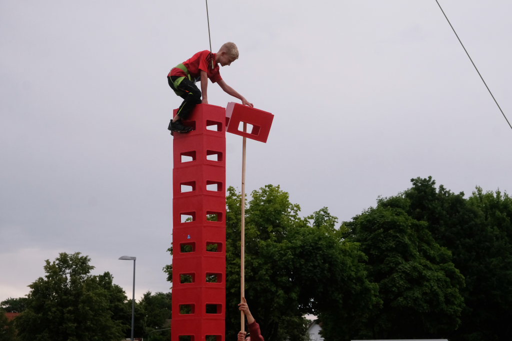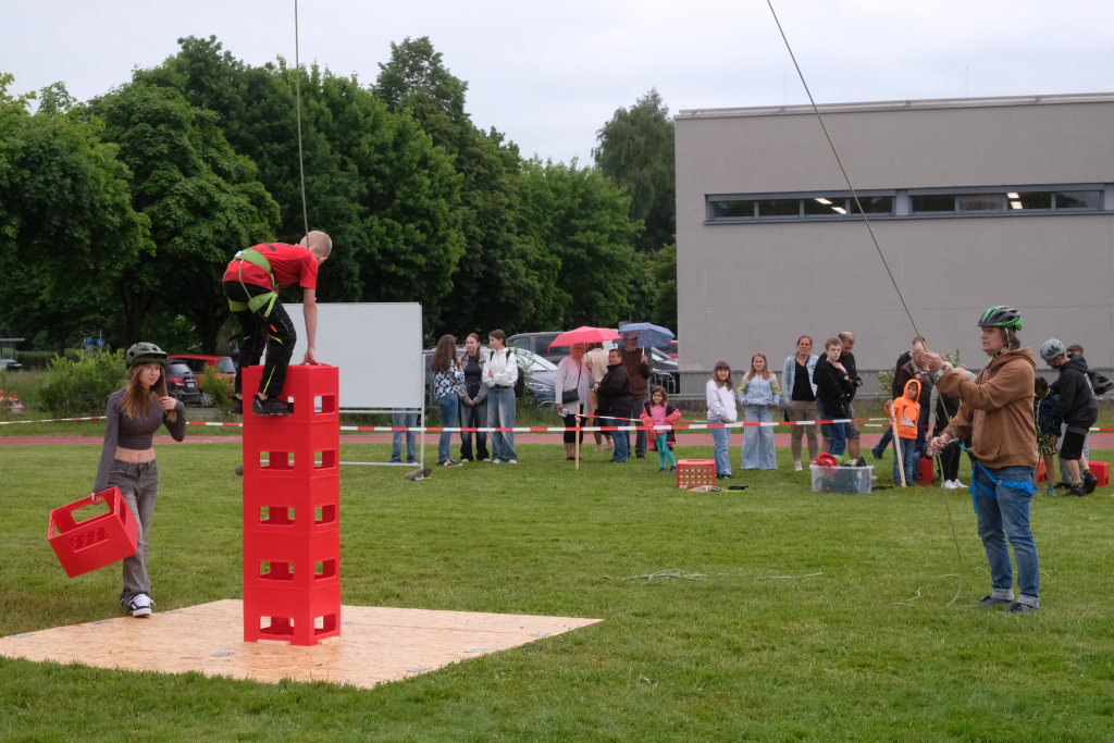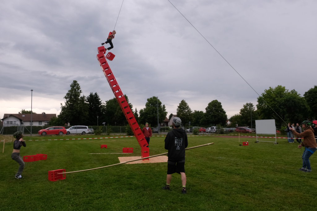 Zwischen den Aufführungen gab es im Rahmen des Schulfestes aber noch weitere Aktionen und Attraktionen. Auch die Schule baute ihren Turm: Diverse Schüler oder auch Familienangehörige versuchten sich am Turmbau aus Bierkisten. Teilweise erreichten die „Baumeister“ schwindelerregende Höhen, für welche sich die Helfer sich trotz Hilfestangen mächtig strecken mussten, während Türmlesbauer nach dem Kippen desselben am Seil eines Manitou hängend und gesichert sanft zu Boden schwebten. Im Popcorn-Club gab es dank des Urgesteins Edmund Butscher – natürlich Popcorn – via Katapultschleuder zu erwerfen. Nicht fehlen durfte am Schulhofeingang natürlich das beliebte Dosenwerfen.