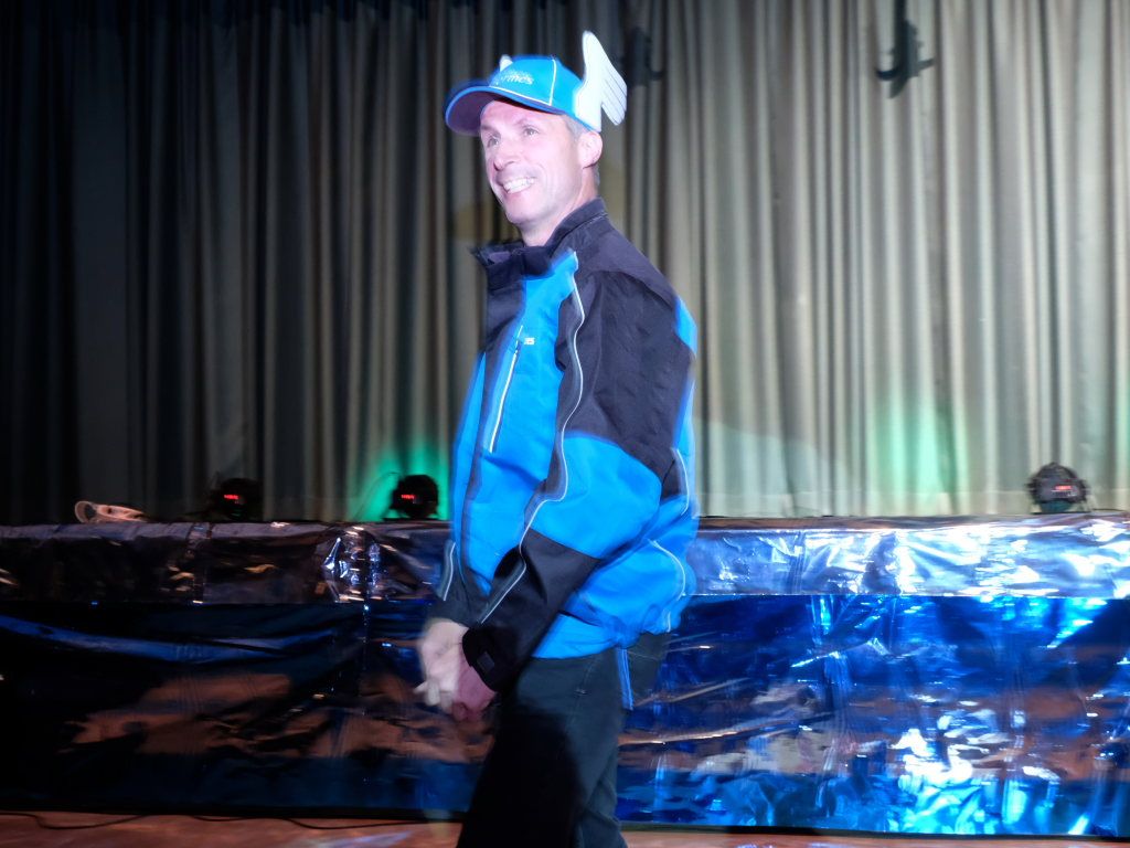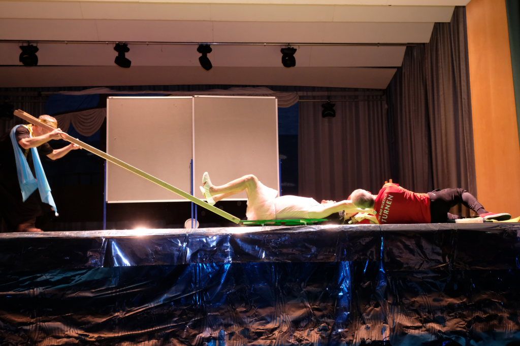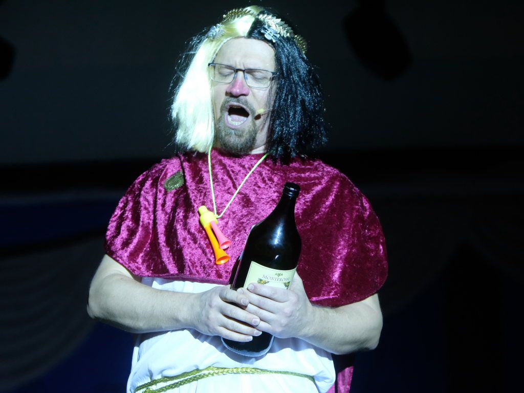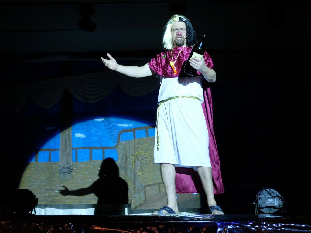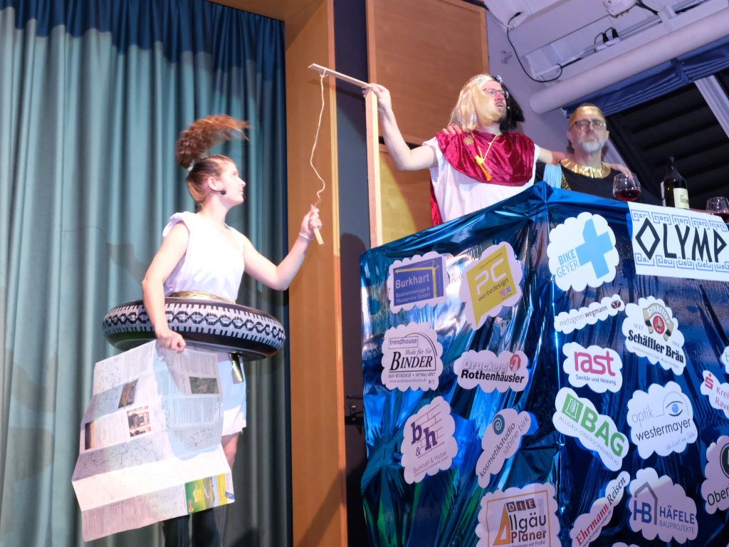 Die beiden Ober-Götter Florian Tobisch als der den menschlichen Gelüsten zugetane Dionysos und Hardy Vincon als Hades, Herrscher über die (Un-)Tiefen des Wurzacher Beckens, spielten in ihrer Rahmengeschichte – als solche darf man die Anmoderationen der beiden bezeichnen – auch dieses Jahr eine bedeutende Rolle. Weitere handelnde Personen waren die durch die Handlung irrlichternde, immer ein wenig desorientiert wirkende Odyssa, die dank des komödiantischen Talentes von Felicitas Vincon und ihrer Ellwanger Steigeisen nie ins Peinliche abdriftete. Ein großes Maß an Selbstironie brachte auch Hubert Forderer mit ins Spiel, im wirklichen Leben DHL-Angestellter, der als Götterbote Hermes im blauen Hermes-Dress blitzschnell die per GI (= Griechische Intelligenz) bestellten Getränkewünsche der beiden Obergötter erfüllte. Nicht fehlen durfte natürlich Finne Vincon, der als Zerberus, als Hüter der Unterwelt, dem guten Hades so manches Schnippchen schlug. Soviel zur Rahmenhandlung.