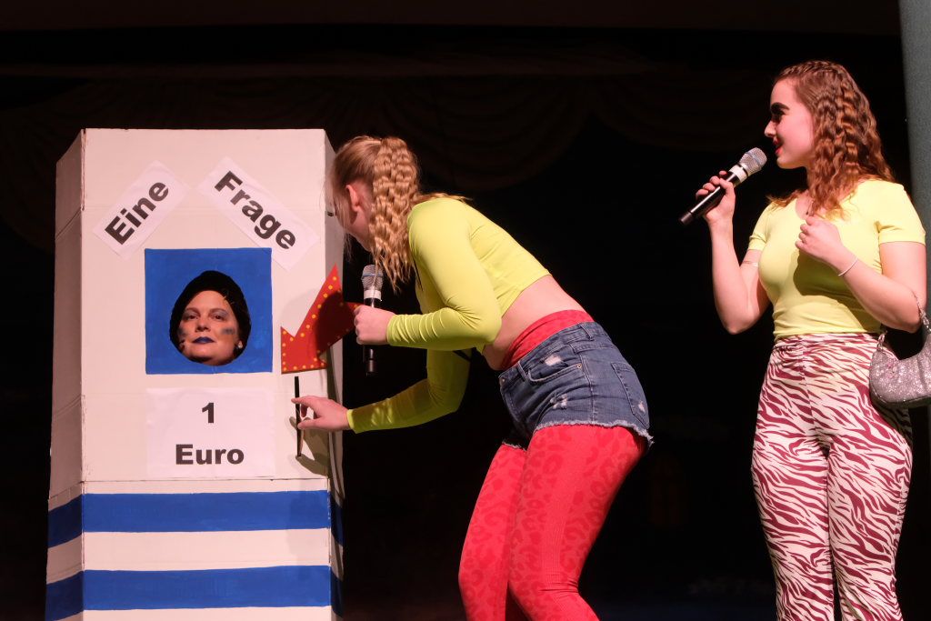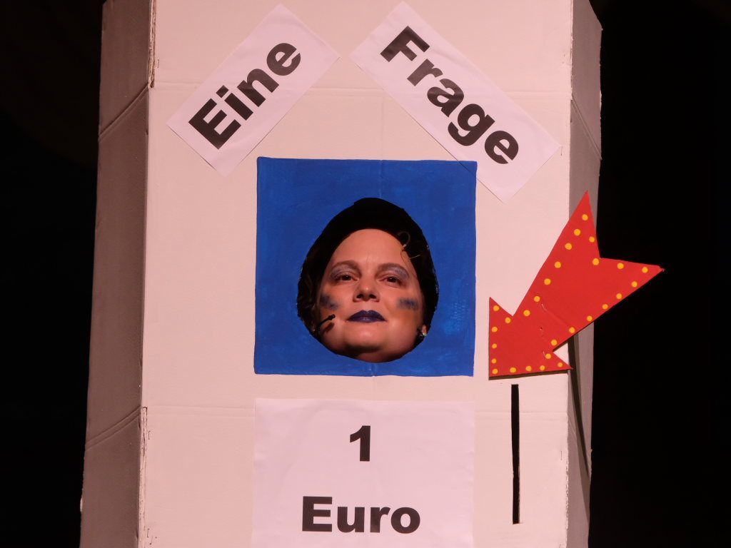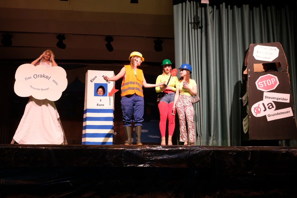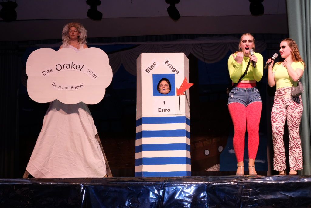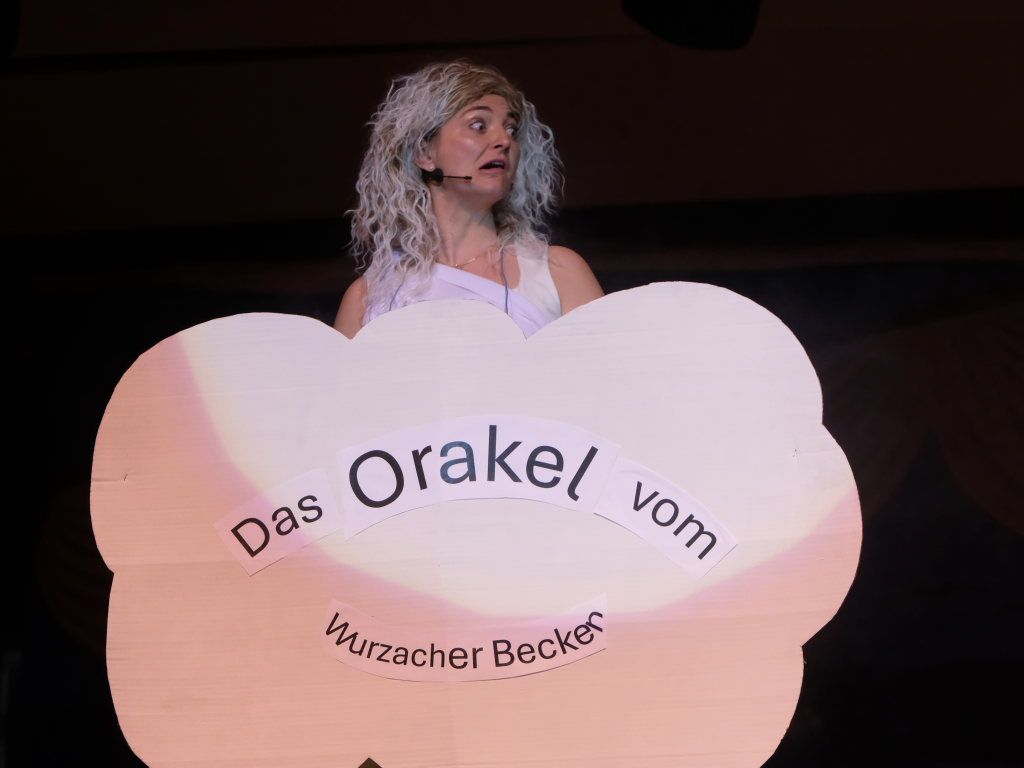 Das Orakel zeigte sich dann auf der Bühne des Sportlerballs ganz zeitgemäß: Voll kommerzialisiert gab es nach einem Münzeinwurf Auskunft über die Zukunft. Als Wissensdurstige traten auf Bürgermeisterin „Alexandra“, junge social-media-affine Damen, zwei Lehrerinnen beim Wandern, ach ja, und auch der Turm in der Form der protestierenden Turmgegner. All jenen gab das Orakel in Person von Caro Stangl mehr oder weniger sybillinische Antworten über die Zukunft – und das Stadtgeschehen.