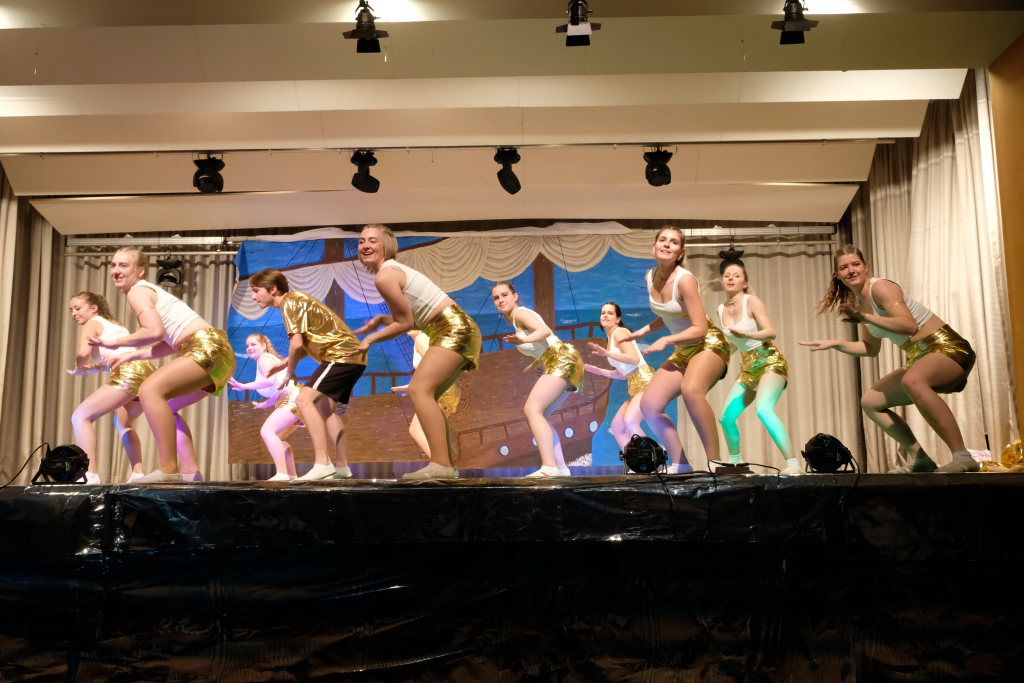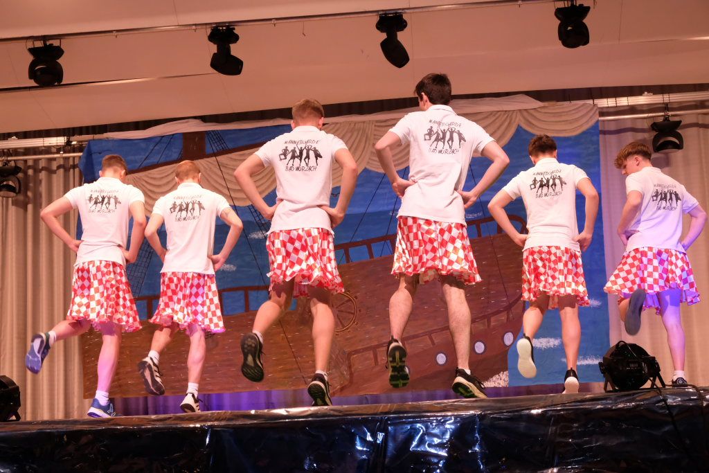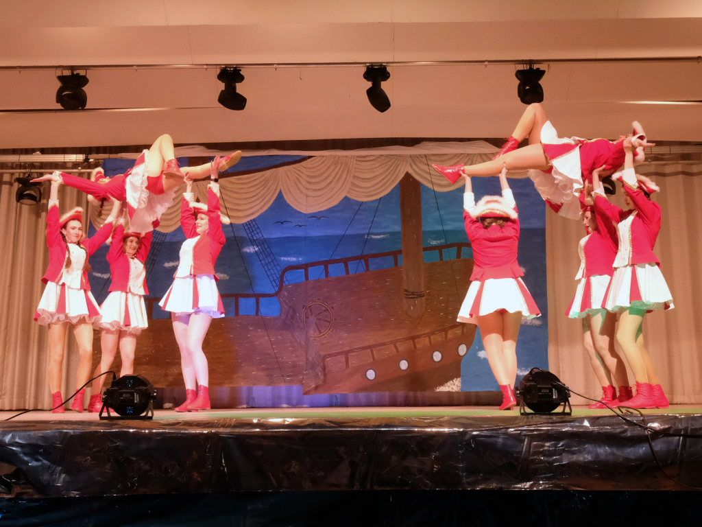 Den eigentlichen Programmauftakt machten die „Bacchantinnen“ in Rot-Weiß, die Gardemädchen der Landjugend Unterschwarzach, die die Stimmung im Saal sofort entfachten. Kommentar von Hardy-Hades, der zuvor bekannte, dass es bei ihm tanzmäßig maximal zum Stehblues reichte: „I frei mi scho, wenn ihr alle bei mir in d‘r Unterwelt auftauchat, dann schickat mir d‘r Stehblues in Rente!“