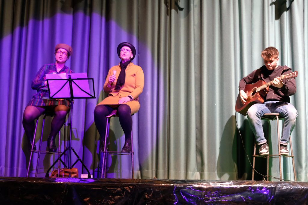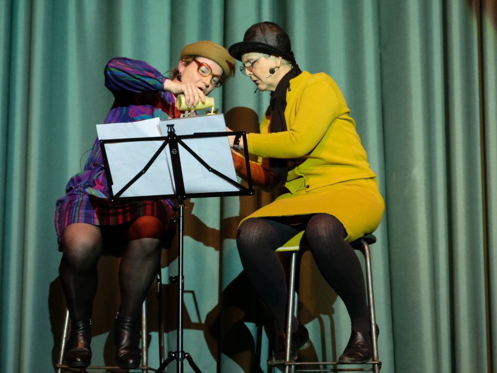 Gerade als Odyssa, die weder den Höllenhund noch Dionysos gefunden hatte, den Olymp, sprich den verwaisten Kommandostand der griechischen Götter, enterte, pfiff sie Hades zurück, gab einen neuen Auftrag: „Aus der Unterwelt sind zwei Hetären (weibliche, sozial anerkannte Prostituierte im Altertum) entkommen.“ Diese tauchten dann auch prompt beim Sportlerball als Claudi und Hilli (Claudia Forderer und Anja Vincon) auf. Die zwei „älteren“ Damen entpuppten sich beim Erklimmen ihrer Barhocker als wahre Verrenkungskünstler. Dabei warem Sprüche zu hören wie „Rollatoren sind etwas für alte Weiber“ oder „Vor 21 Jahren war ich schon einmal a Hocker-Schönheit“. Die beiden hatten eine Neuheit im Programm: Erstmals erhoben sie nicht nur ihre Stimme zum Ratschen, sondern sie sangen tatsächlich ein Lied: „Father and Son“ mit schwäbischem Text, an der Gitarre begleitet von Lukas Rast.