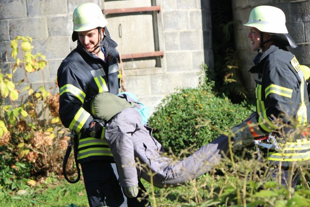 Die erste Gruppe bekam die Aufgabe, in einem „verrauchten“ Ziegenstall eine Person zu retten. Nach dem Aufbau der Wasserversorgung ging der Angriffstrupp unter Atemschutz in den Stall, suchte das Gebäude ab und konnte den Dummy retten. Parallel musste die zweite Gruppe einen unter einem landwirtschaftlichen Gerät verunfallten Dummy retten. Das gelang den Kameraden mit Hilfe des technischen Geräts des TSF-W.