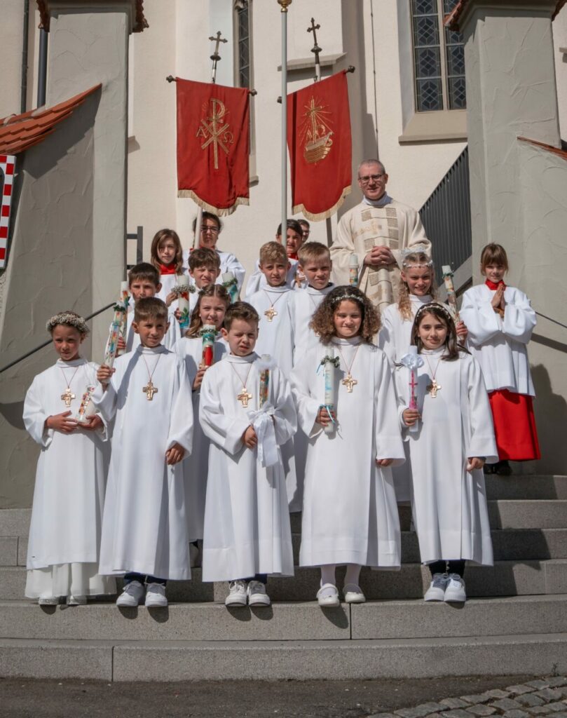 Unterschwarzach – Am 14. April konnten elf Kinder der Kirchengemeinden St. Gallus, Unterschwarzach und St. Jakobus, Eggmannsried in Unterschwarzach mit Herrn Pfarrer Patrick Meschenmoser ihre Erste Heilige Kommunion feiern.