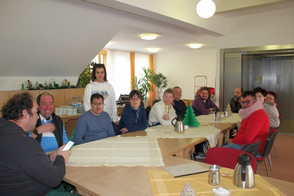 Kübra Duman (stehend) im Kreis ihrer ehemaligen Kolleginnen und Kollegen der WfbM, Foto: Stiftung Liebenau