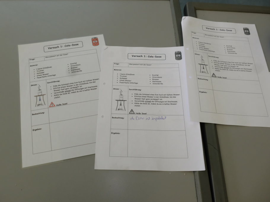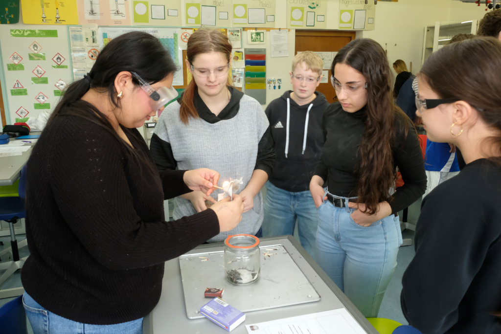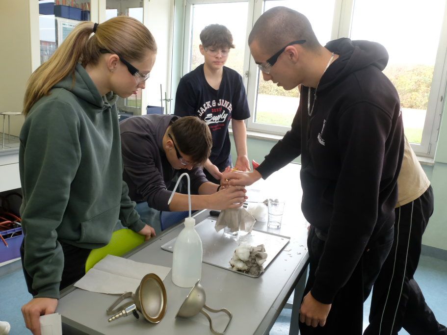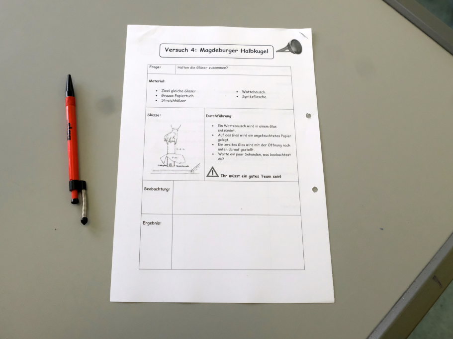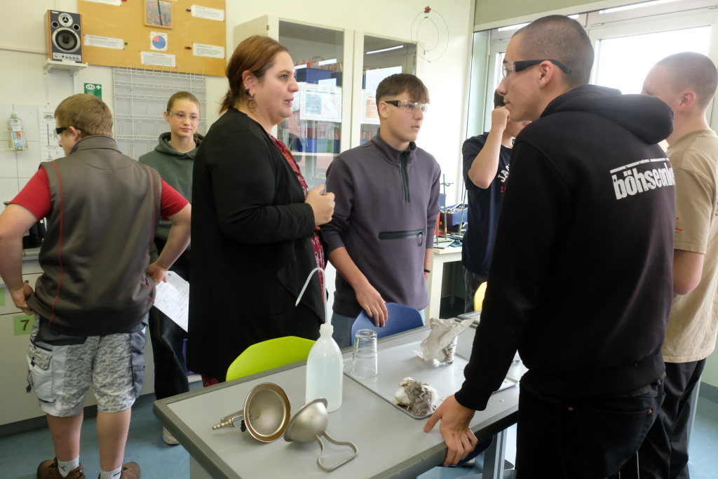 Um zu zeigen, wie die MINT-Fächer an der Schule gehandhabt werden, bekamen Pressevertreter die Möglichkeit,an einer Chemiestunde, die Manuela Broichmann gemeinsam mit der Klasse 9g gestaltete, teilzunehmen. Thema der Stunde waren die Veränderungen bei Unterdruck bzw. Überdruck. In kleinen Gruppen durften sich die Schüler an vier Stationen erproben: Sei es etwa, um die Frage zu klären: Wie funktioniert es, dass ein Einweck-Glas „dicht“ hält. Oder wie die Magdeburger Halbkugeln funktionieren, mit denen der Magdeburger Bürgermeister Otto Guericke etwa Mitte des 17. Jahrhunderts experimentierte, um die Wirkung des Luftdruckes zu demonstrieren. In einem weiteren Experiment konnten die Schüler die Auswirkung von Temperaturunterschieden auf Stoffe erforschen. In einem weiteren Experiment wurde ein Ei allein durch das Abkühlen der Luft in einer Flasche und der daraus folgenden Komprimierung und dem damit entstehenden Unterdruck durch die Öffnung der Flasche gezogen.