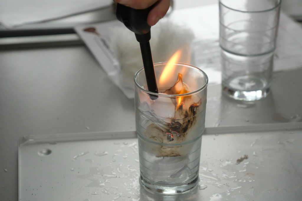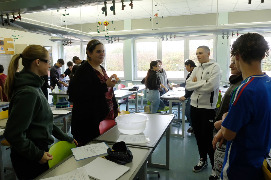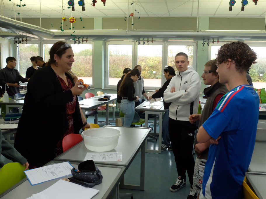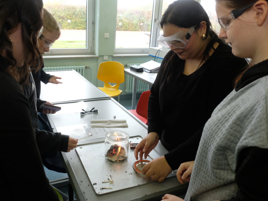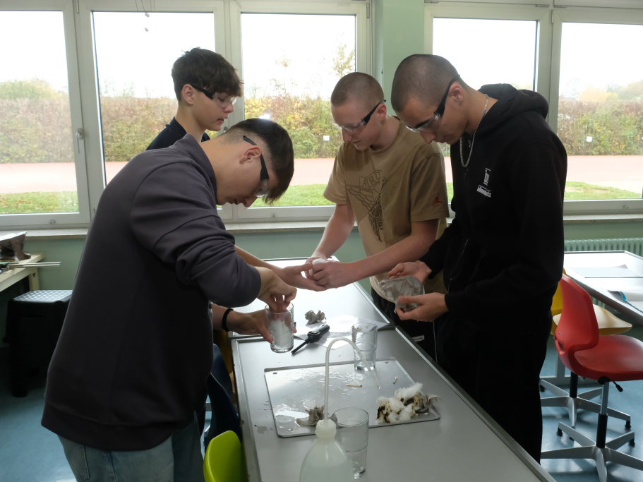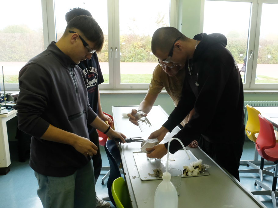 Um zu zeigen, wie die MINT-Fächer an der Schule gehandhabt werden, bekamen Pressevertreter die Möglichkeit,an einer Chemiestunde, die Manuela Broichmann gemeinsam mit der Klasse 9g gestaltete, teilzunehmen. Thema der Stunde waren die Veränderungen bei Unterdruck bzw. Überdruck. In kleinen Gruppen durften sich die Schüler an vier Stationen erproben: Sei es etwa, um die Frage zu klären: Wie funktioniert es, dass ein Einweck-Glas „dicht“ hält. Oder wie die Magdeburger Halbkugeln funktionieren, mit denen der Magdeburger Bürgermeister Otto Guericke etwa Mitte des 17. Jahrhunderts experimentierte, um die Wirkung des Luftdruckes zu demonstrieren. In einem weiteren Experiment konnten die Schüler die Auswirkung von Temperaturunterschieden auf Stoffe erforschen. In einem weiteren Experiment wurde ein Ei allein durch das Abkühlen der Luft in einer Flasche und der daraus folgenden Komprimierung und dem damit entstehenden Unterdruck durch die Öffnung der Flasche gezogen.