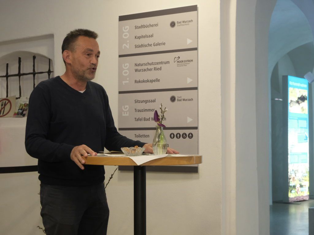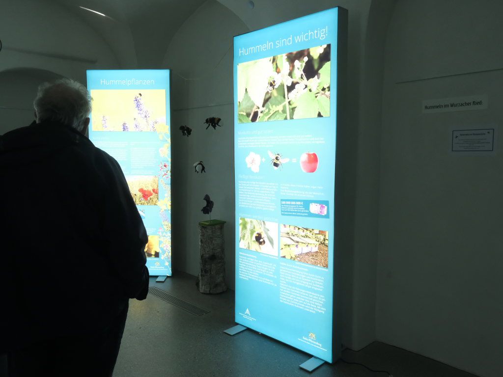 Bad Wurzach – Unter dem Titel „Muskulös und gut isoliert – Hummeln, die Superhelden unter den Insekten“ lädt das Naturschutzzentrum Wurzacher Ried Besucher zu der aktuellen Wechselausstellung im Gewölbegang ein, auf zehn großformatigen, beleuchteten Tafeln sich näher mit dem Leben dieser „Superhelden“ zu befassen. Aus privaten Gründen musste Michael Eick, der Leiter der Akademie für Natur- und Umweltschutz Baden-Württemberg, auf die Reise nach Bad Wurzach verzichten, so dass Dr. Siegfried Roth, der Leiter des Naturschutzzentrums, kurzfristig die fachliche Einführung übernehmen musste.