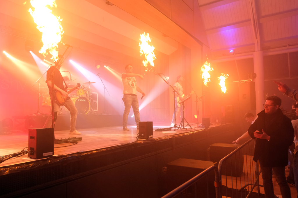 Eine Premiere – wie die Party selbst – war auch die – natürlich bei den Kollegen von der Feuerwehr und dem Ordnungsamt angemeldete – Feuershow bei einigen Stücken. Danach blieb noch alles ruhig, kein Blaulicht zuckte im Umfeld des Torfstechers und des wie ausgestorben daliegenden und von einer Securitymannschaft bewachten Weihnachtsmarktes durch die Nacht. Die tauchte erst nach dem Ende der Party in Person von Kommandant Rolf Butscher auf, dann nämlich, als die Jungs und Helfer von marshy soil ihr Equipment abbauten und dabei die Nebelmaschine einen Rauchmelder „irritierte“.