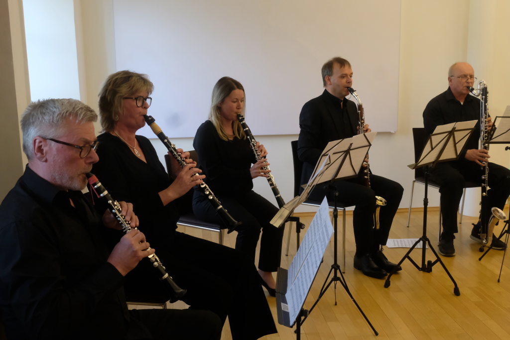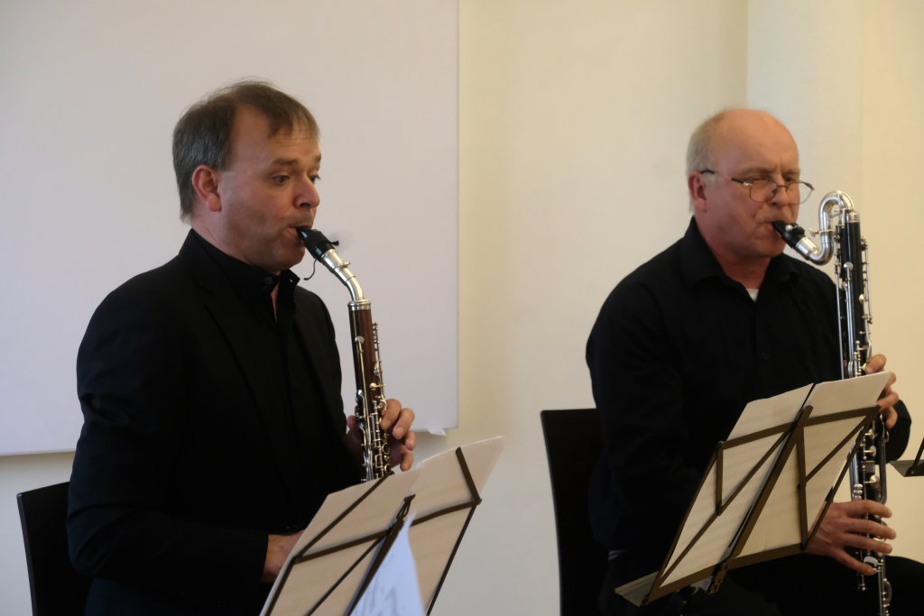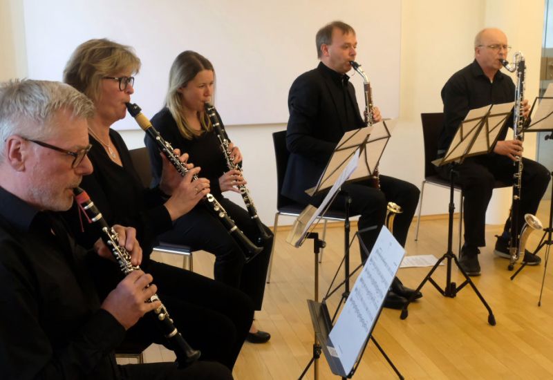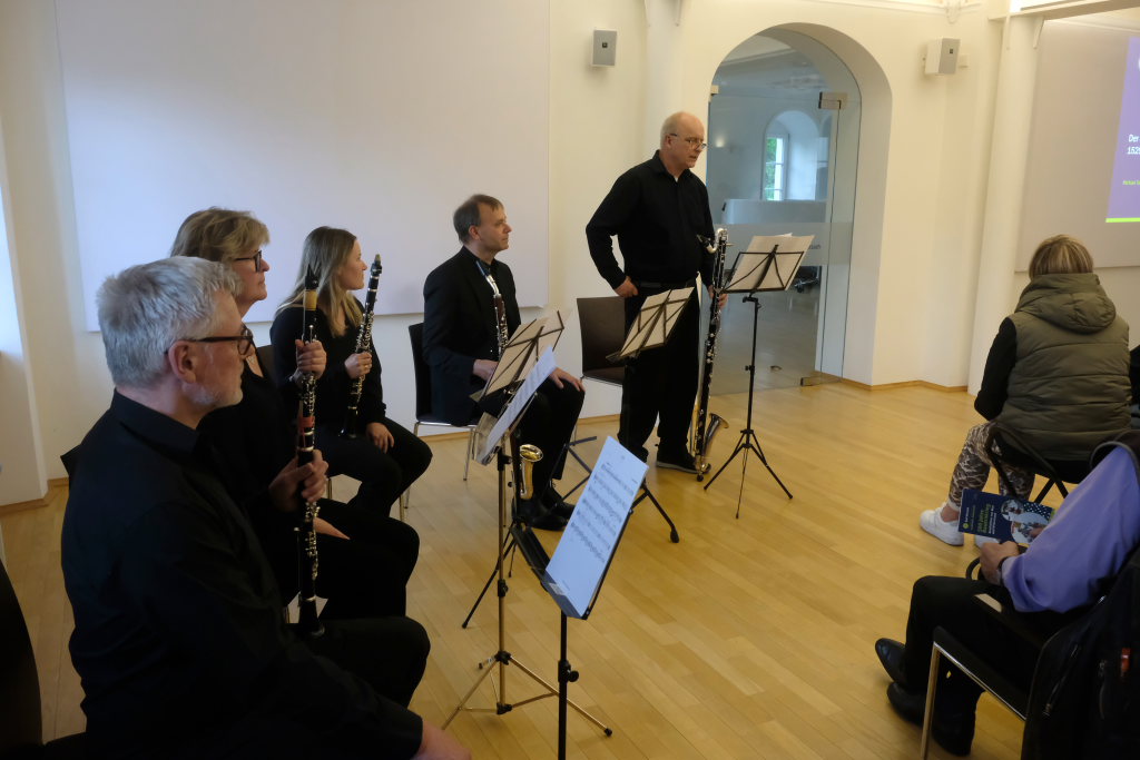 Bad Wurzach – Ein besonderes Zuckerl hatten Stadtarchivar Michael Wild und die Damen der Bad Wurzach-Info für die Besucher des zweiten Vortragstermins „Wenn Nachbarn kämpfen“ über die Schlacht beim Leprosenhaus 1525 im Sitzungssaal von Maria Rosengarten am 22. Mai parat: Georg Stankalla, Klarinetten-Lehrer an der Jugendmusikschule Bad Wurzach, spielte zum Auftakt mit einem Klarinetten-Quintett seine Komposition „Wurzach 1525“ über eben diese Bauernkriegsschlacht am Leprosenberg vor exakt 500 Jahren.