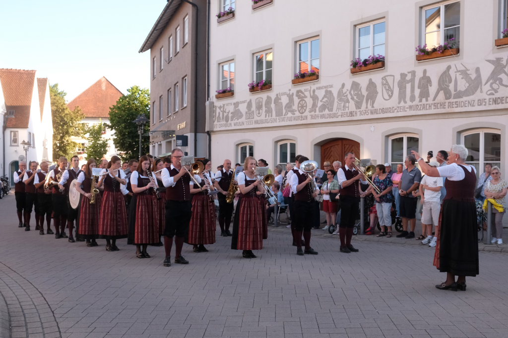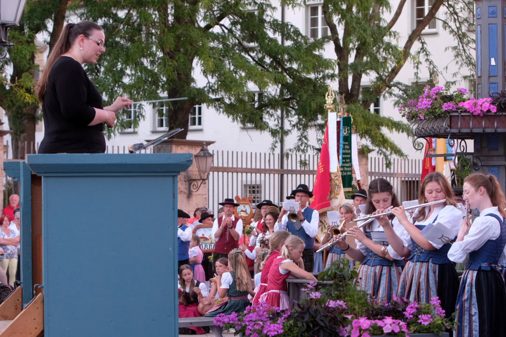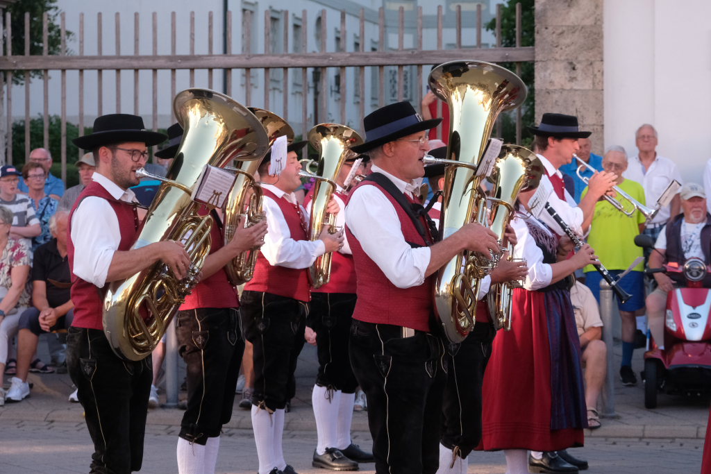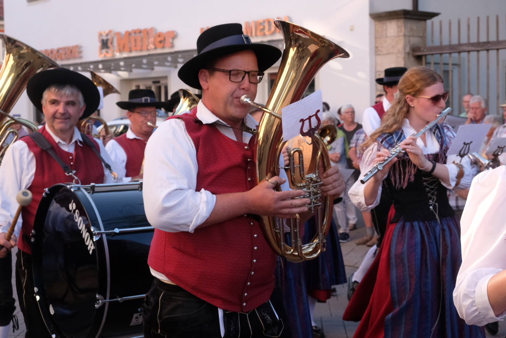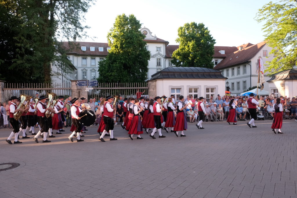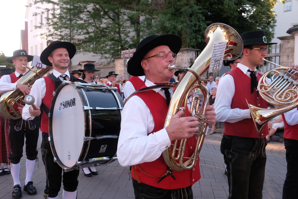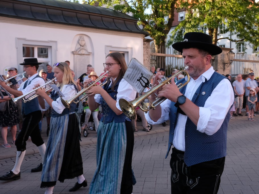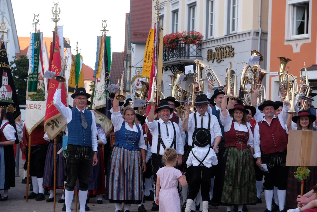 Der Musikverein Arnach, der vor wenigen Wochen sein 175-jähriges Jubiläum gefeiert hatte, spielte mit seinem Dirigenten Berthold Hiemer auf dem Weg vom Amtshaus zum Marienbrunnen „Mein Heimatland“ von Sepp Neumayr und beschloss damit den Aufmarsch der zehn Musikkapellen.