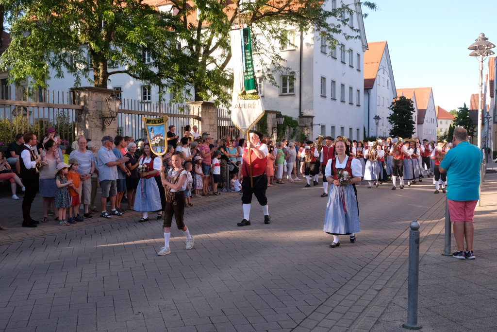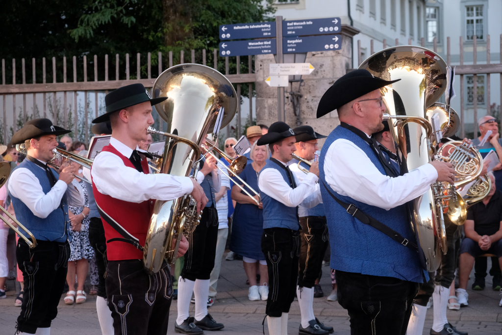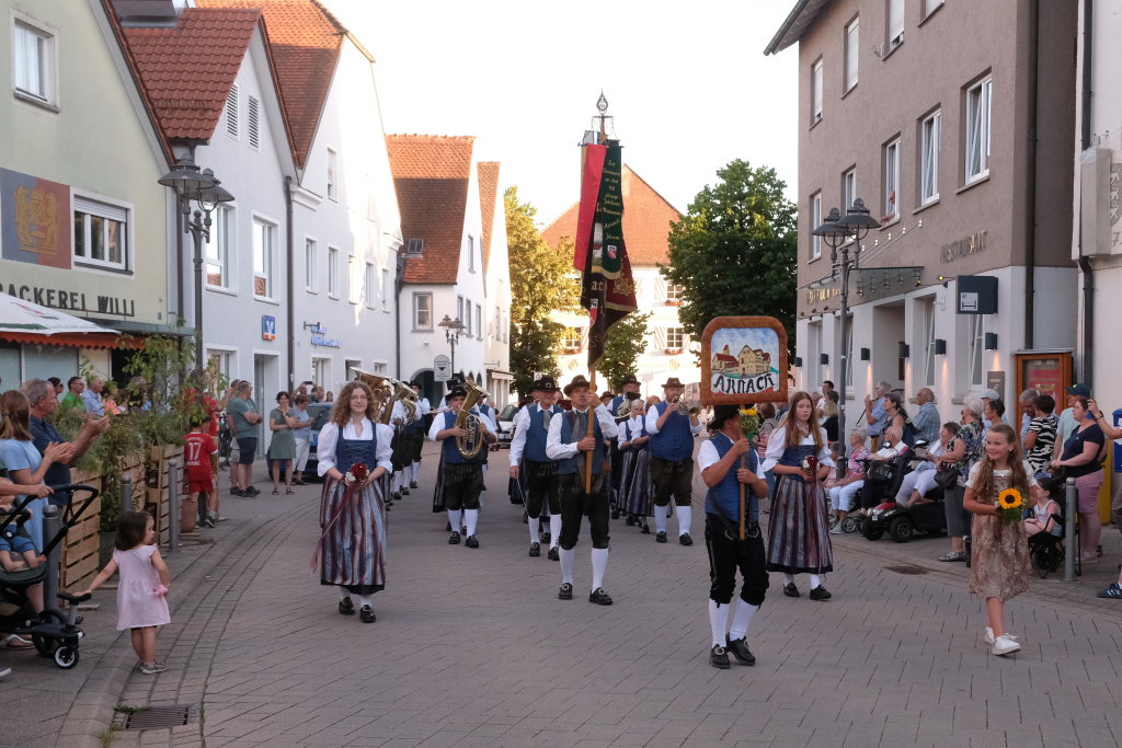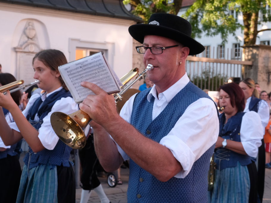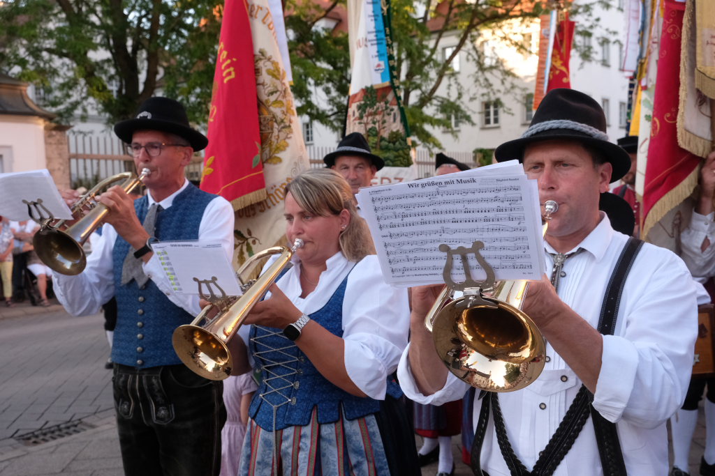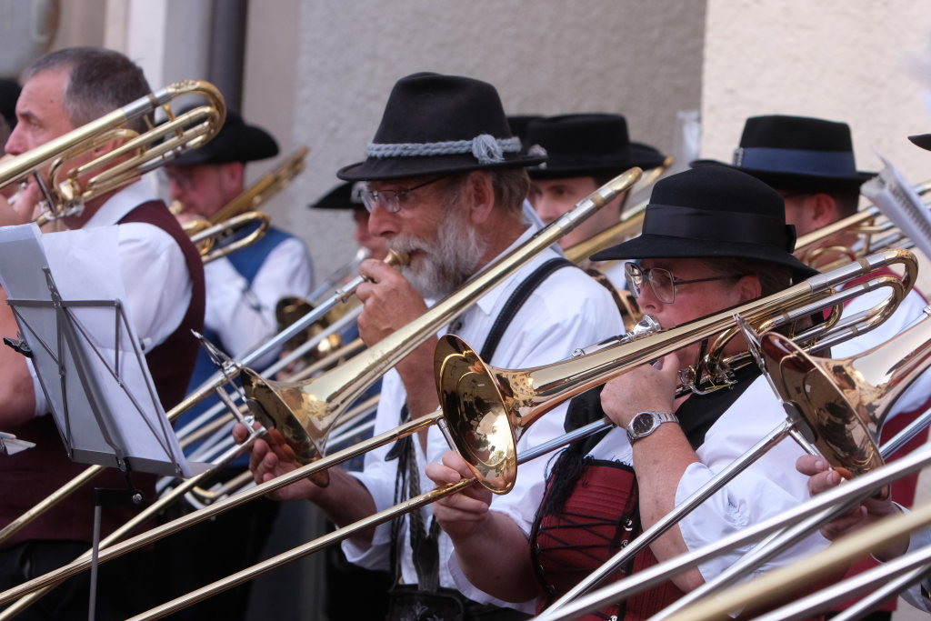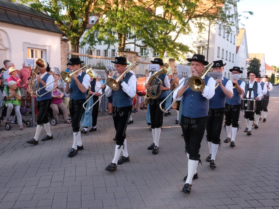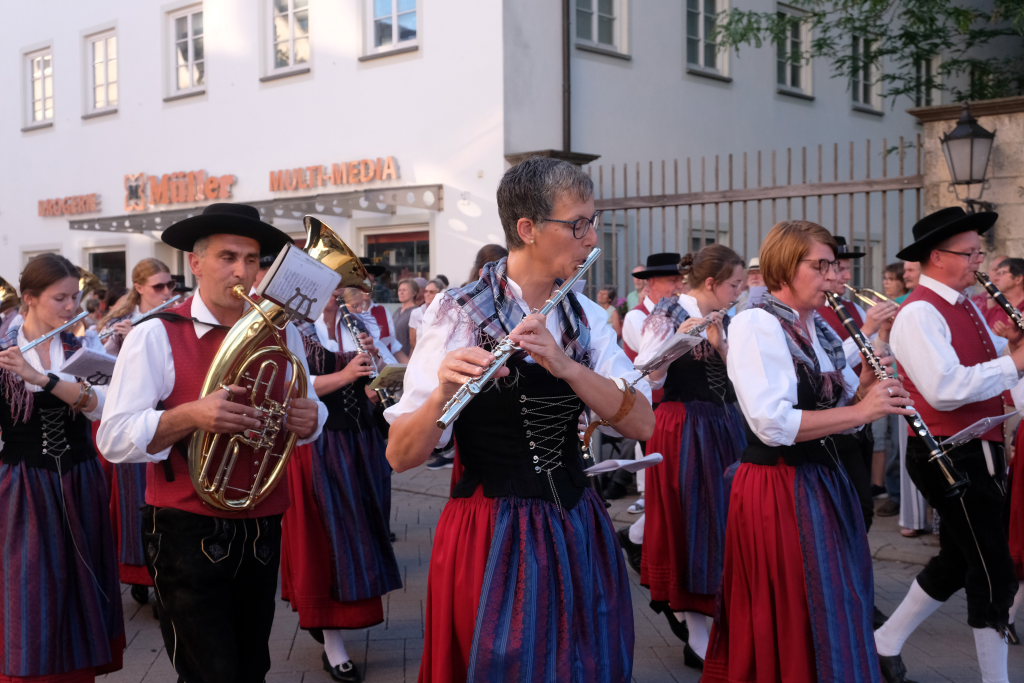 Der Musikverein Arnach, der vor wenigen Wochen sein 175-jähriges Jubiläum gefeiert hatte, spielte mit seinem Dirigenten Berthold Hiemer auf dem Weg vom Amtshaus zum Marienbrunnen „Mein Heimatland“ von Sepp Neumayr und beschloss damit den Aufmarsch der zehn Musikkapellen.