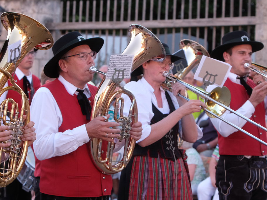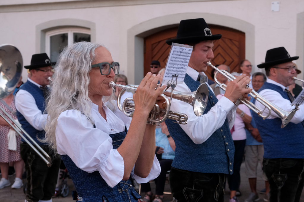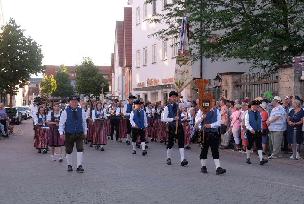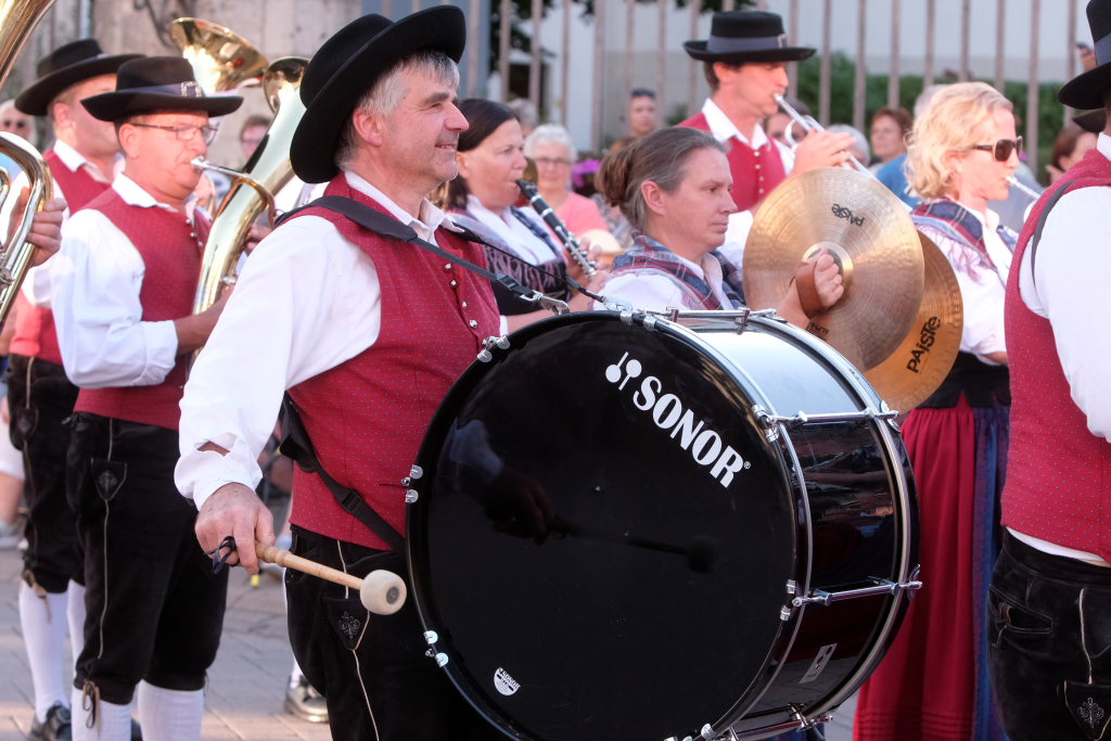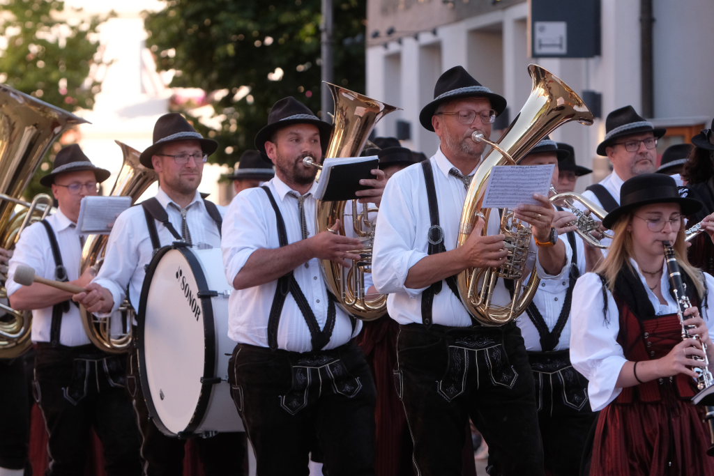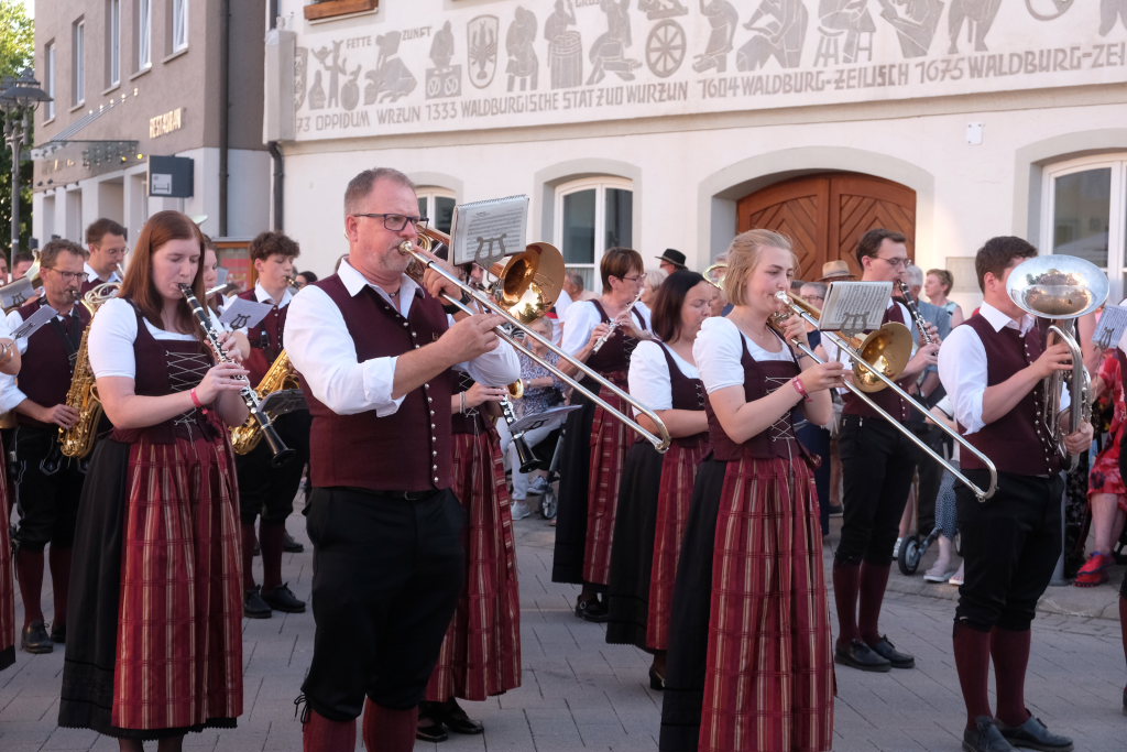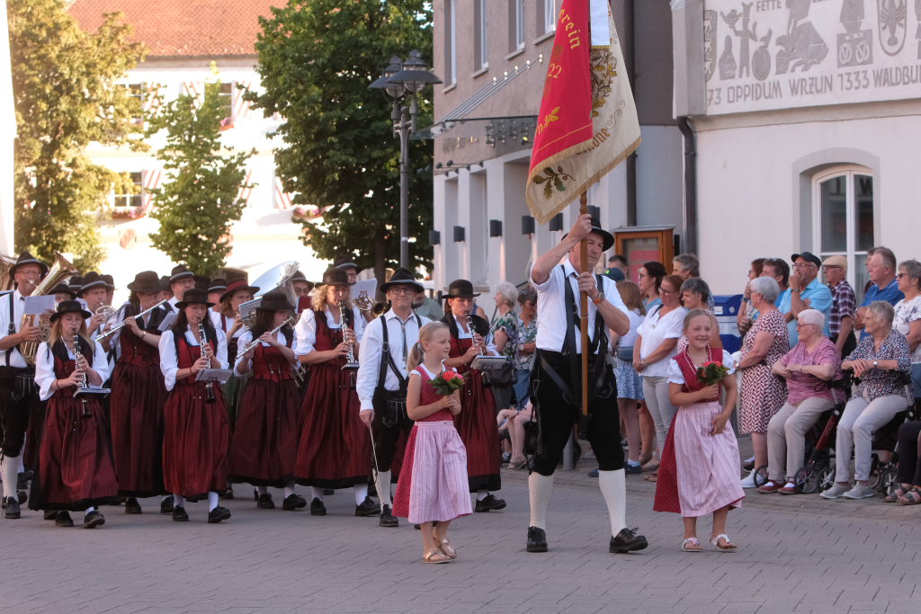 Der Musikverein Arnach, der vor wenigen Wochen sein 175-jähriges Jubiläum gefeiert hatte, spielte mit seinem Dirigenten Berthold Hiemer auf dem Weg vom Amtshaus zum Marienbrunnen „Mein Heimatland“ von Sepp Neumayr und beschloss damit den Aufmarsch der zehn Musikkapellen.
