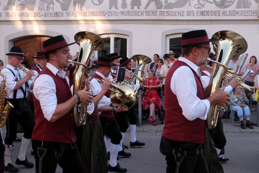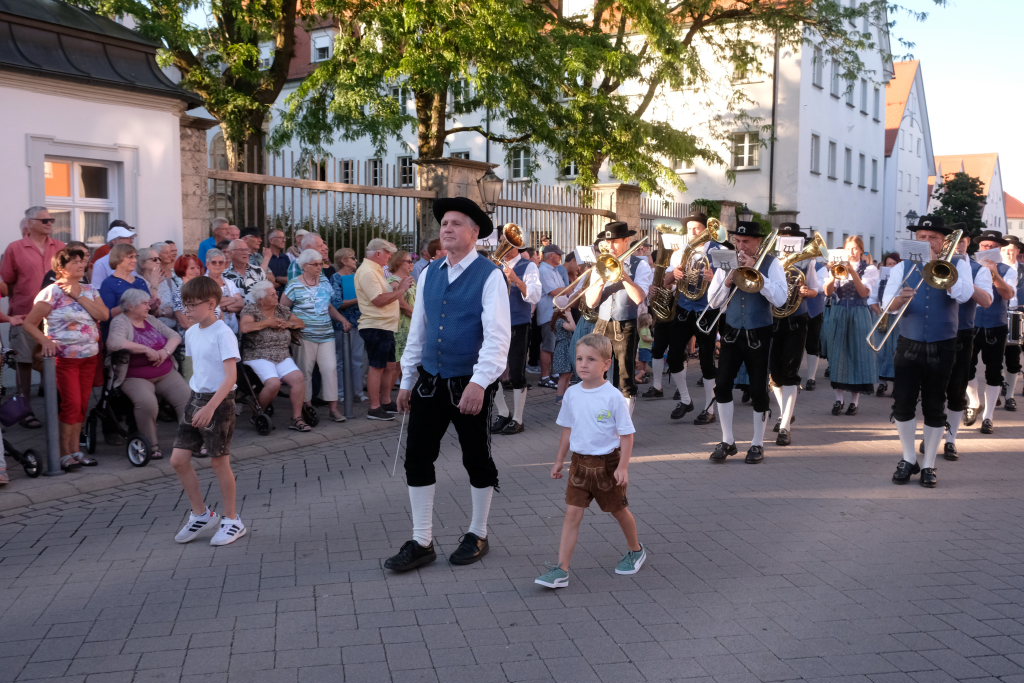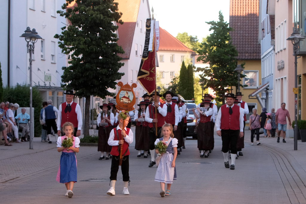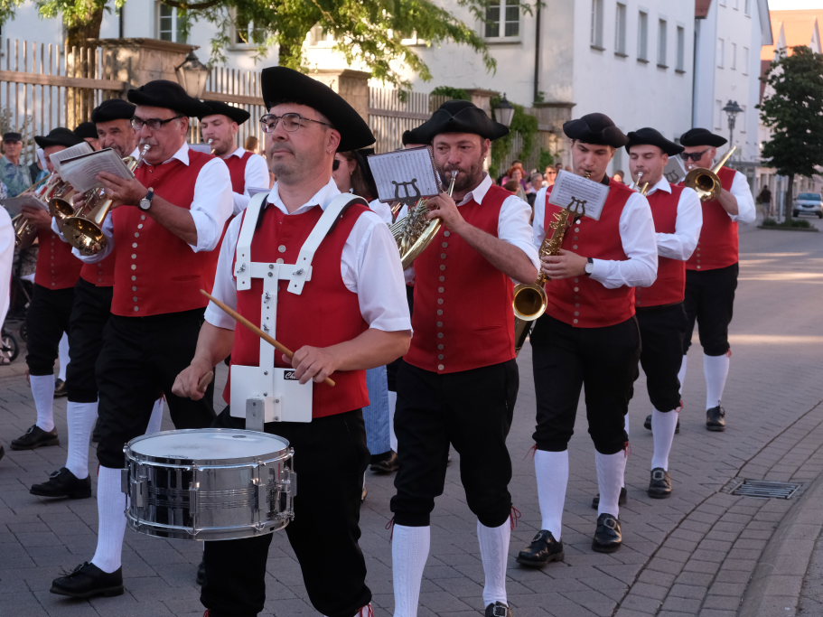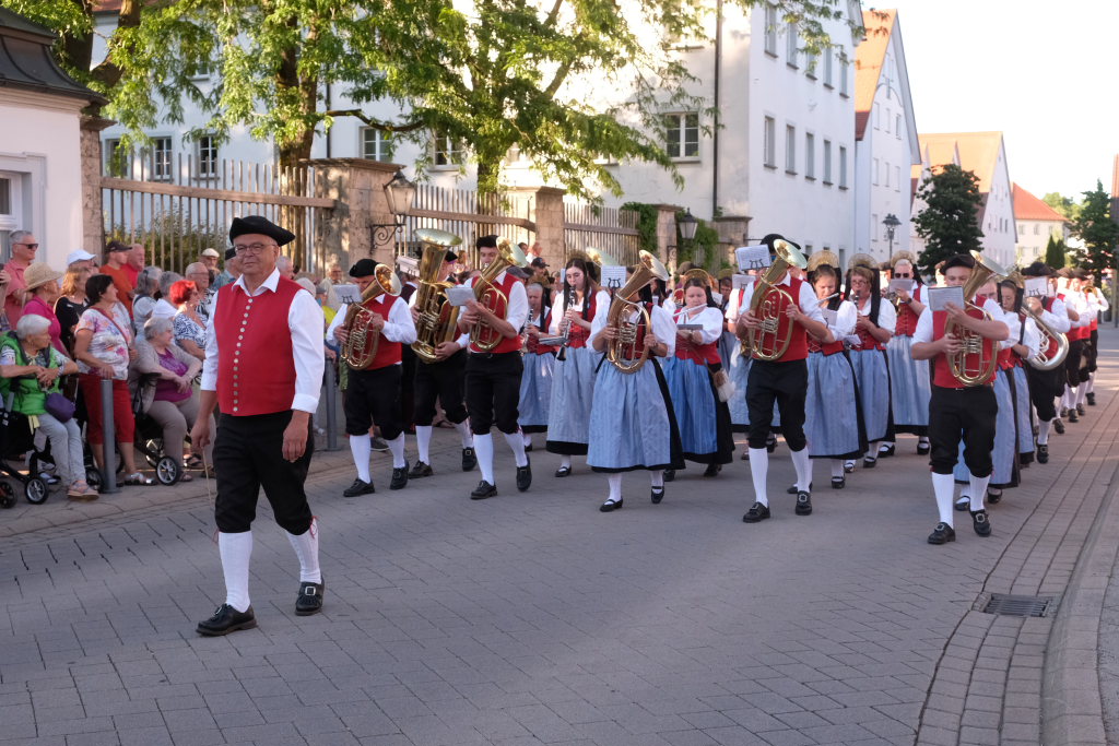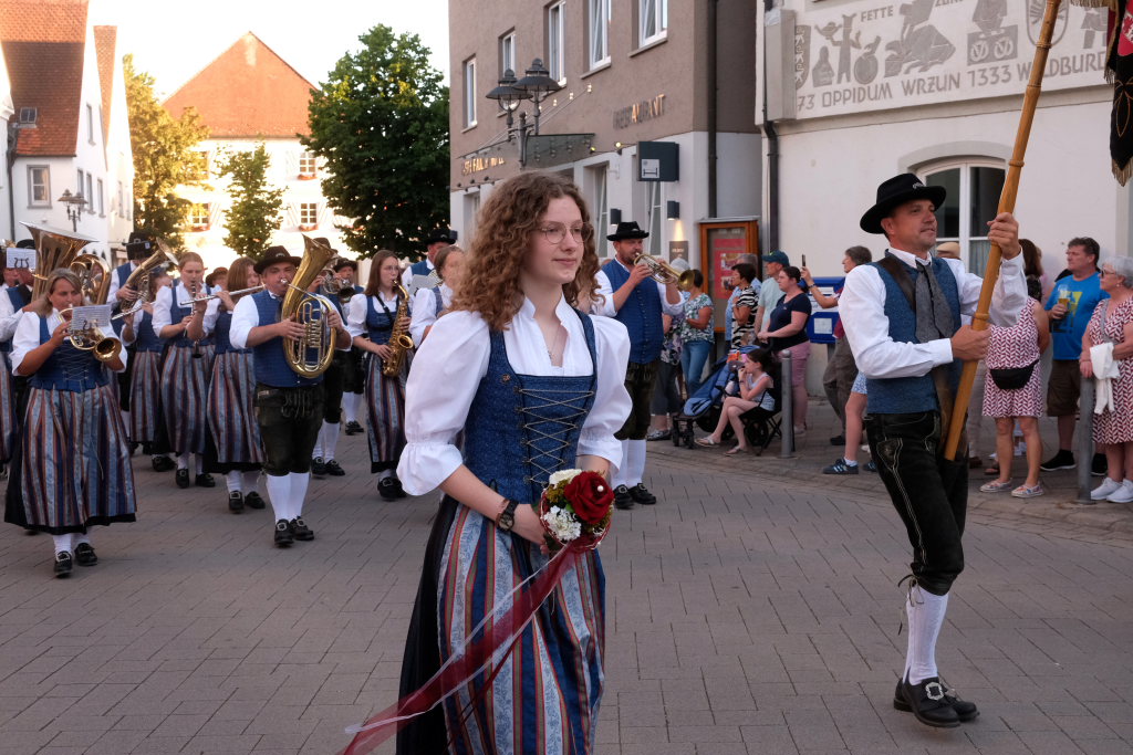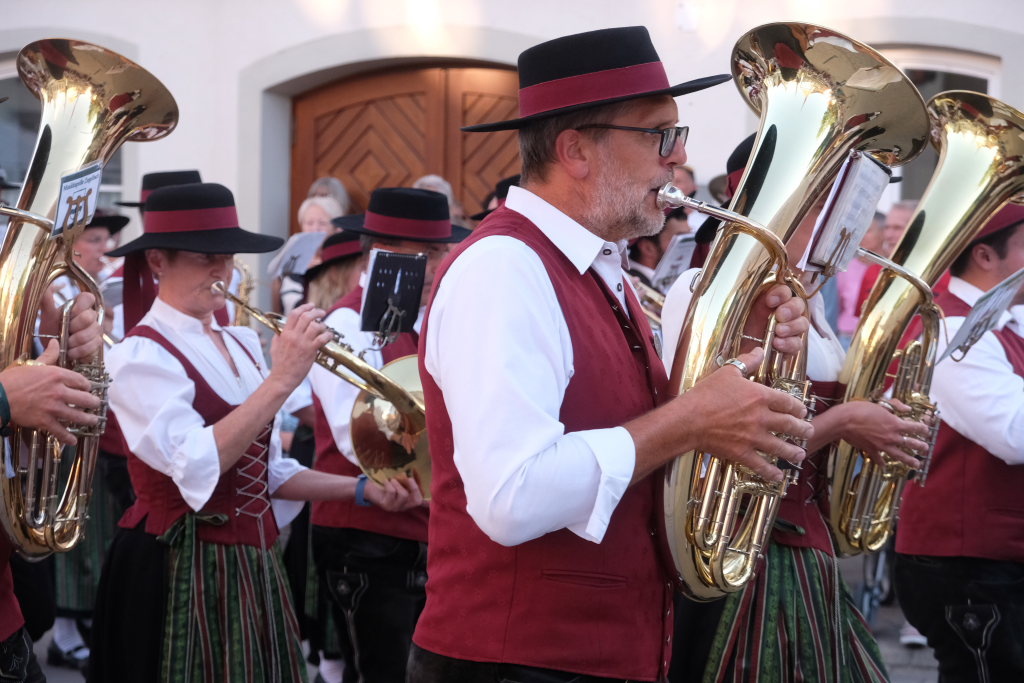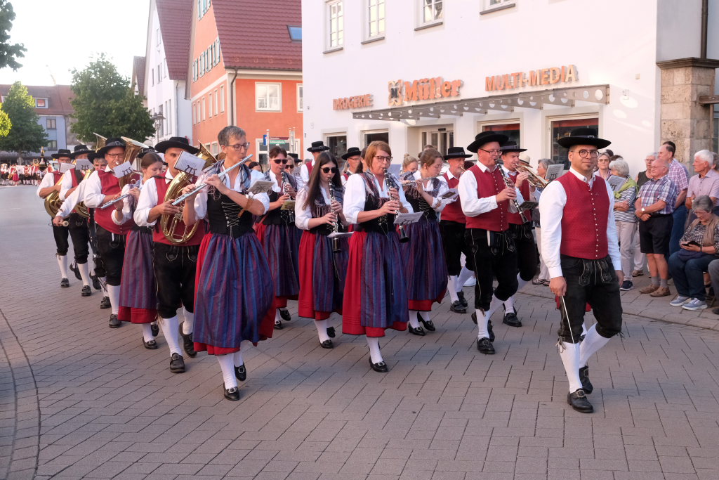 Der Musikverein Arnach, der vor wenigen Wochen sein 175-jähriges Jubiläum gefeiert hatte, spielte mit seinem Dirigenten Berthold Hiemer auf dem Weg vom Amtshaus zum Marienbrunnen „Mein Heimatland“ von Sepp Neumayr und beschloss damit den Aufmarsch der zehn Musikkapellen.