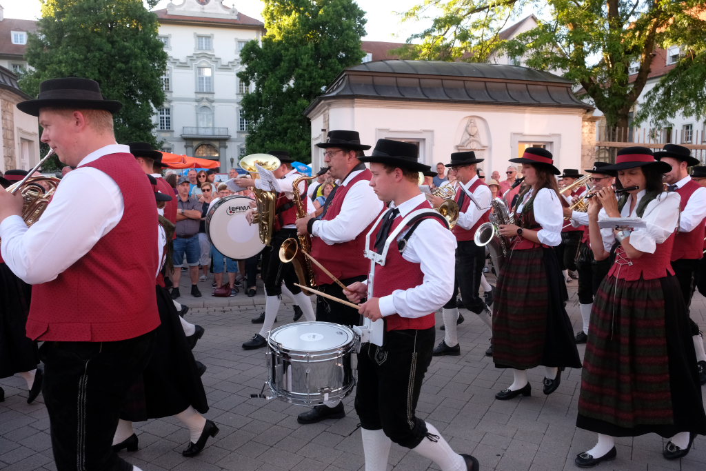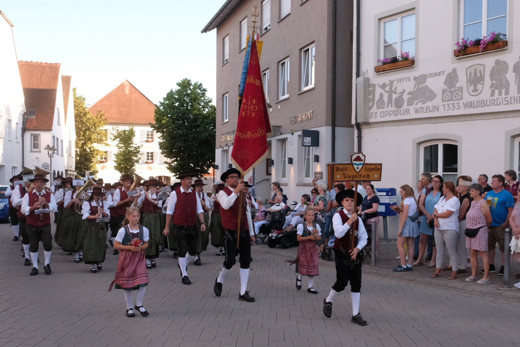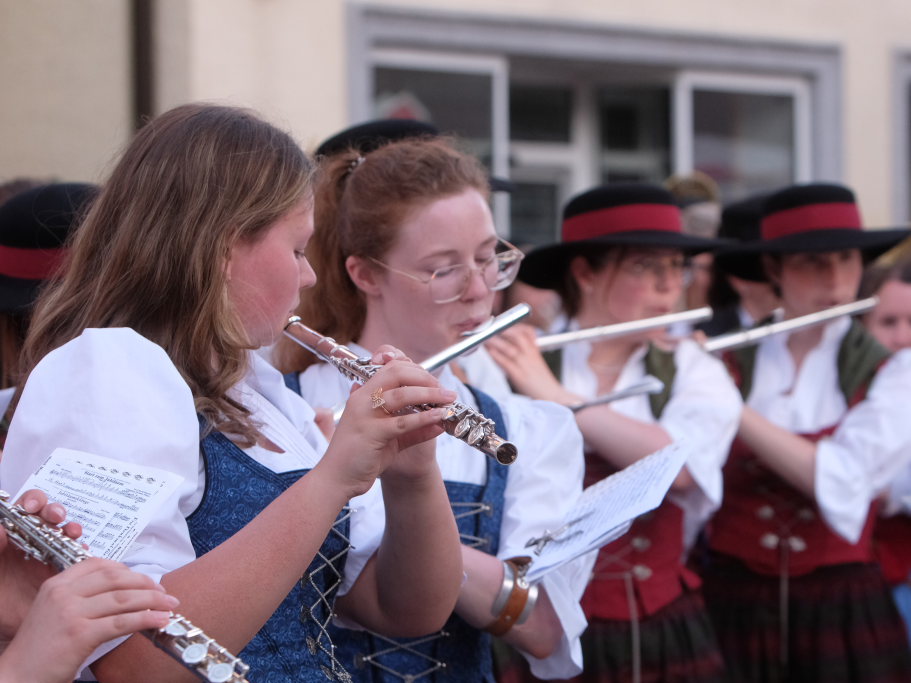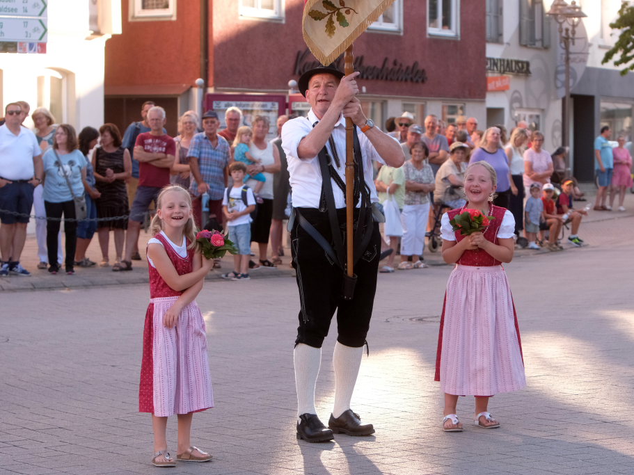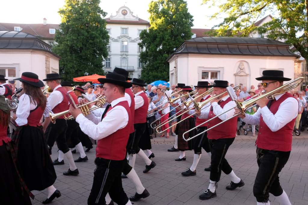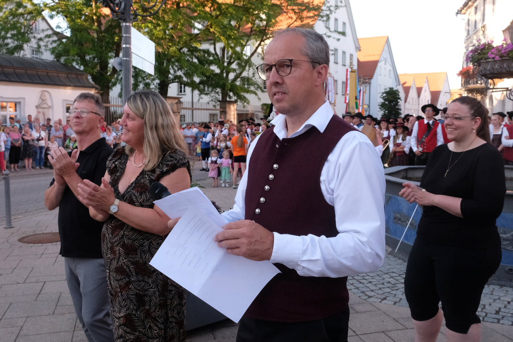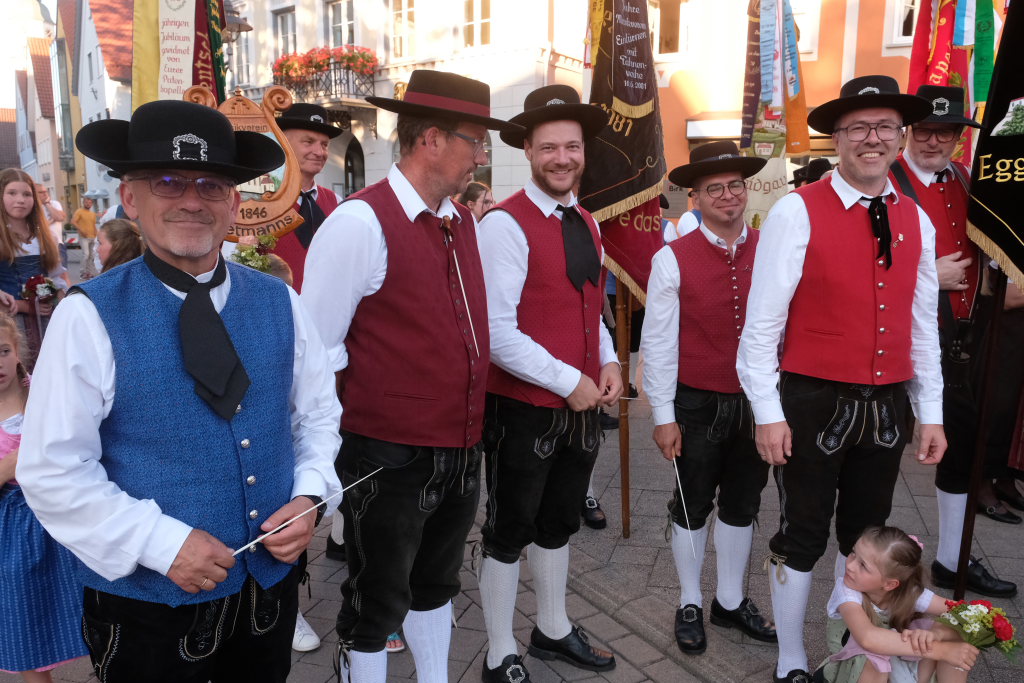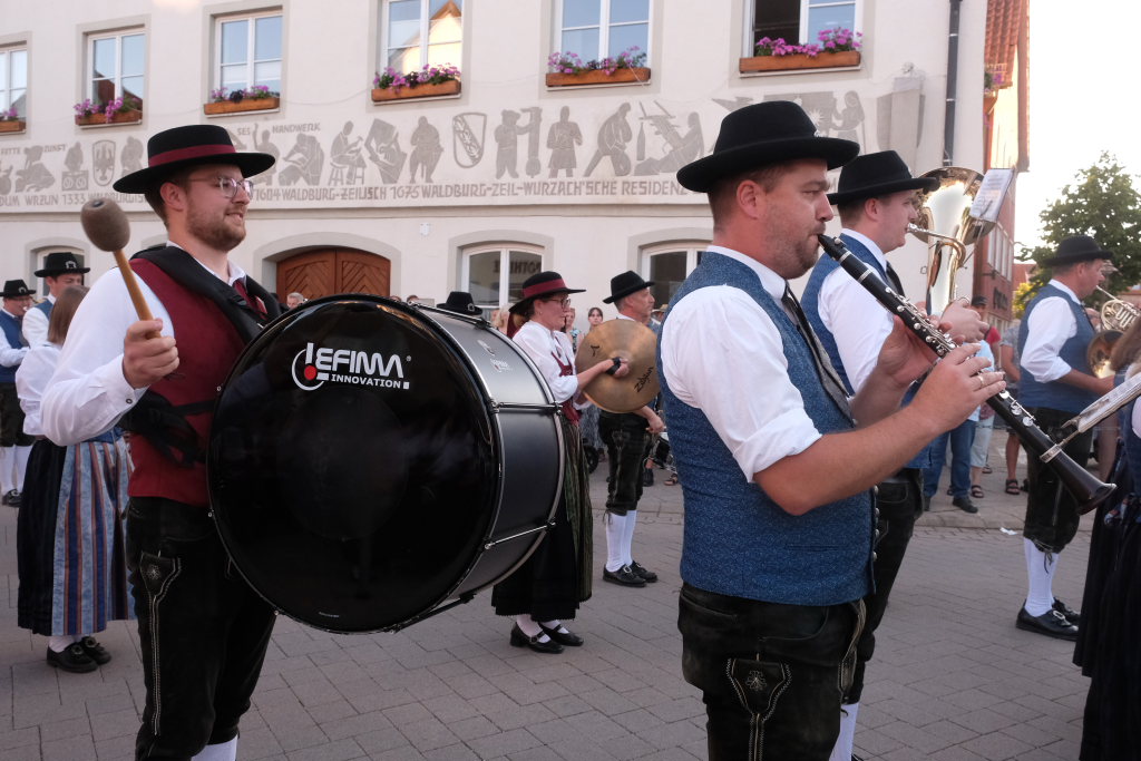 Der Musikverein Arnach, der vor wenigen Wochen sein 175-jähriges Jubiläum gefeiert hatte, spielte mit seinem Dirigenten Berthold Hiemer auf dem Weg vom Amtshaus zum Marienbrunnen „Mein Heimatland“ von Sepp Neumayr und beschloss damit den Aufmarsch der zehn Musikkapellen.