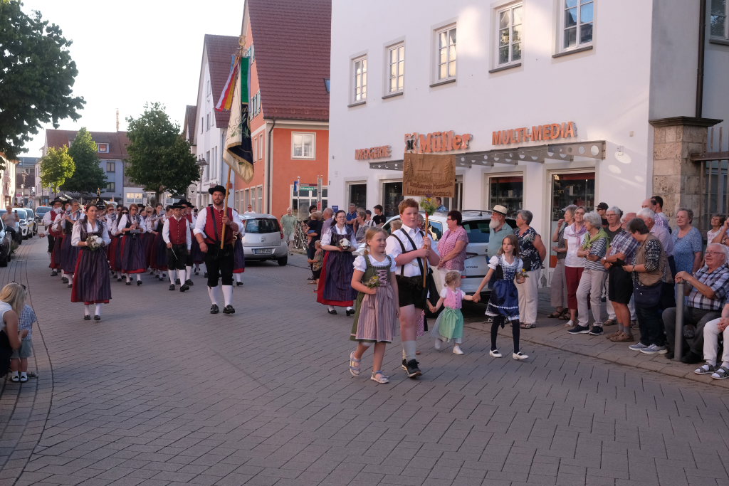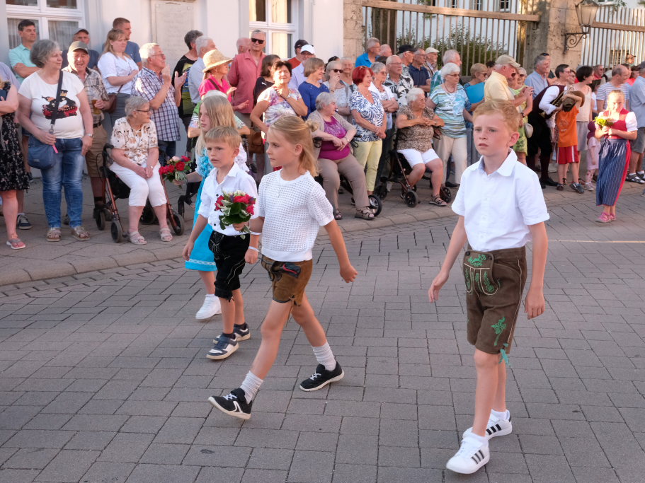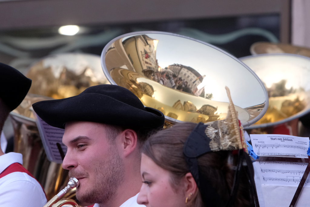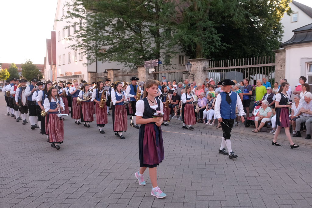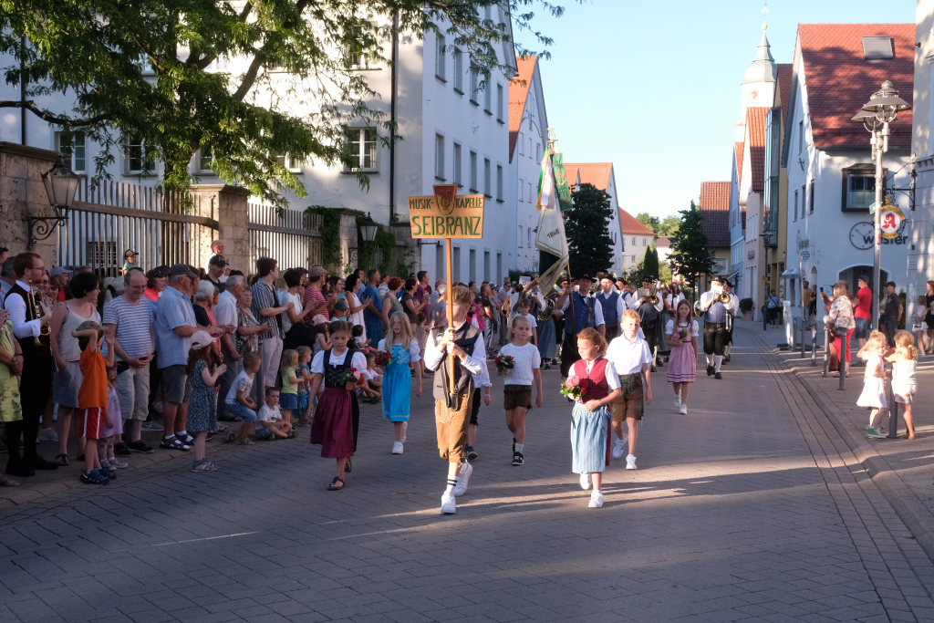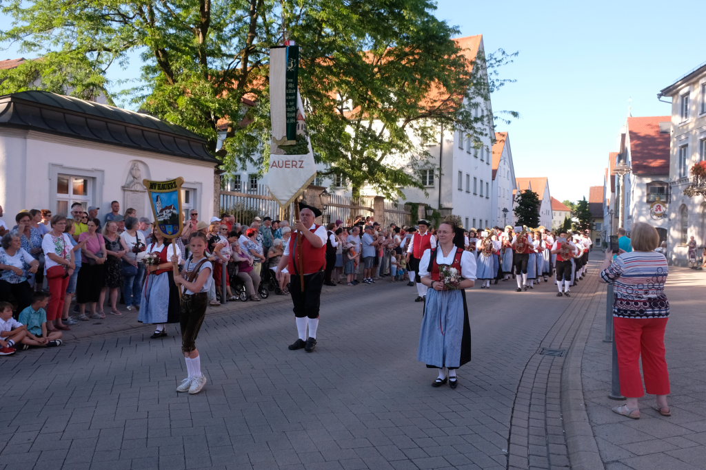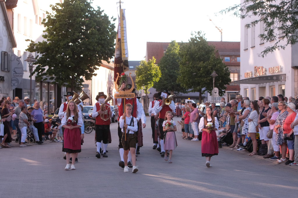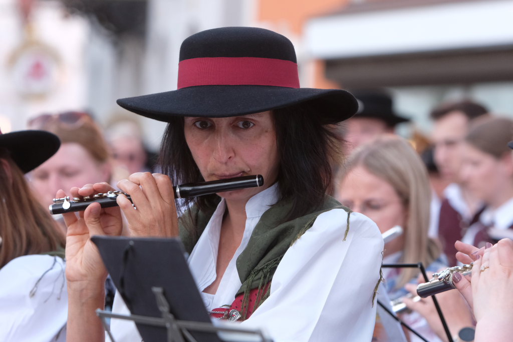 Der Musikverein Arnach, der vor wenigen Wochen sein 175-jähriges Jubiläum gefeiert hatte, spielte mit seinem Dirigenten Berthold Hiemer auf dem Weg vom Amtshaus zum Marienbrunnen „Mein Heimatland“ von Sepp Neumayr und beschloss damit den Aufmarsch der zehn Musikkapellen.