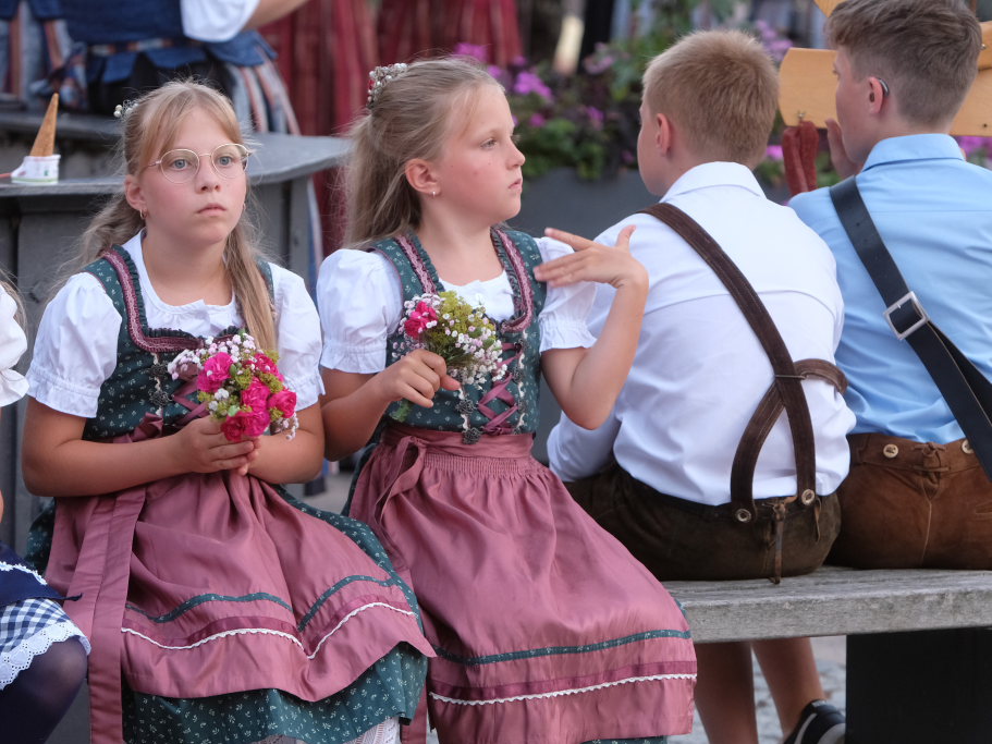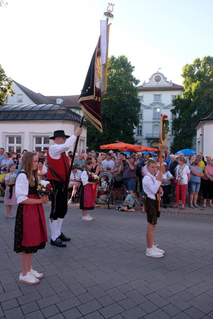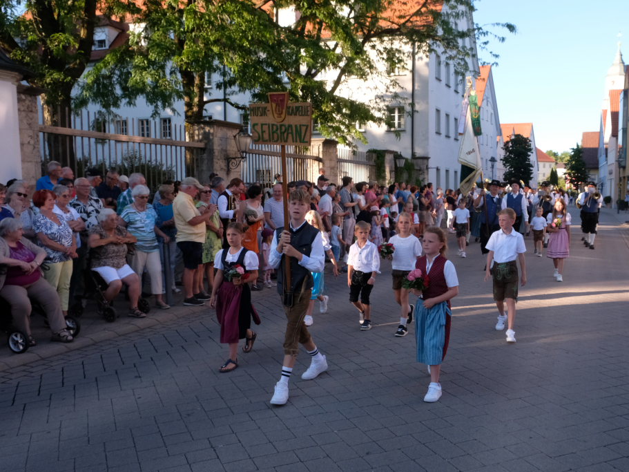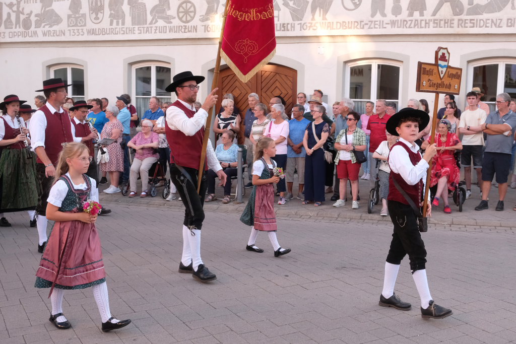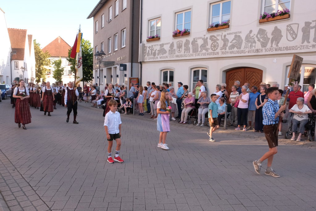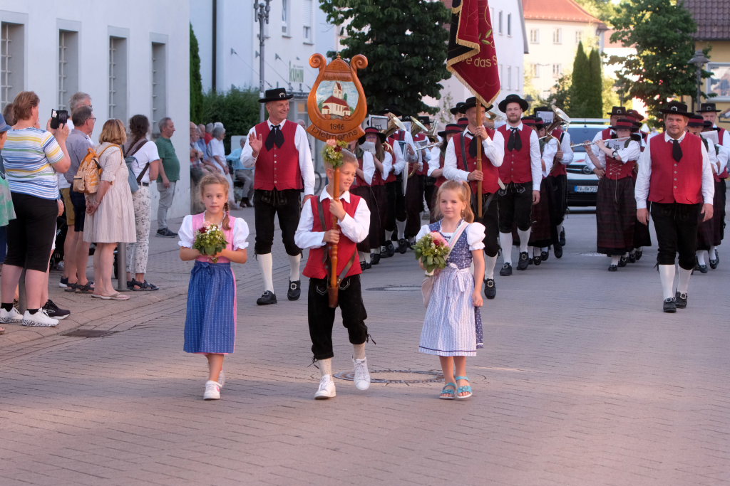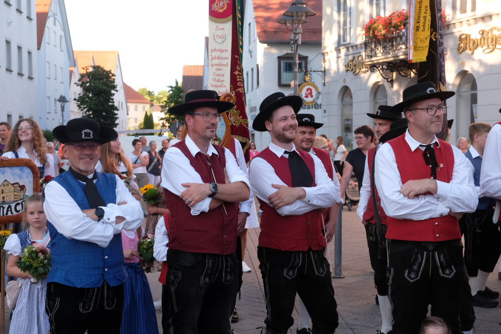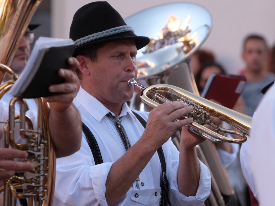 Der Musikverein Arnach, der vor wenigen Wochen sein 175-jähriges Jubiläum gefeiert hatte, spielte mit seinem Dirigenten Berthold Hiemer auf dem Weg vom Amtshaus zum Marienbrunnen „Mein Heimatland“ von Sepp Neumayr und beschloss damit den Aufmarsch der zehn Musikkapellen.