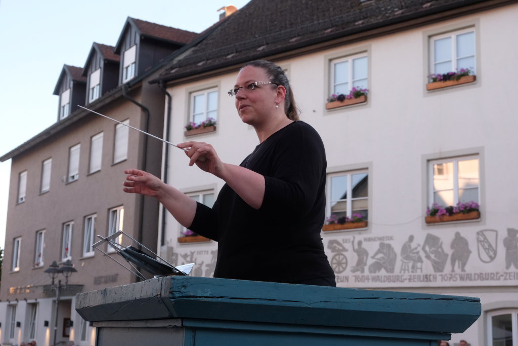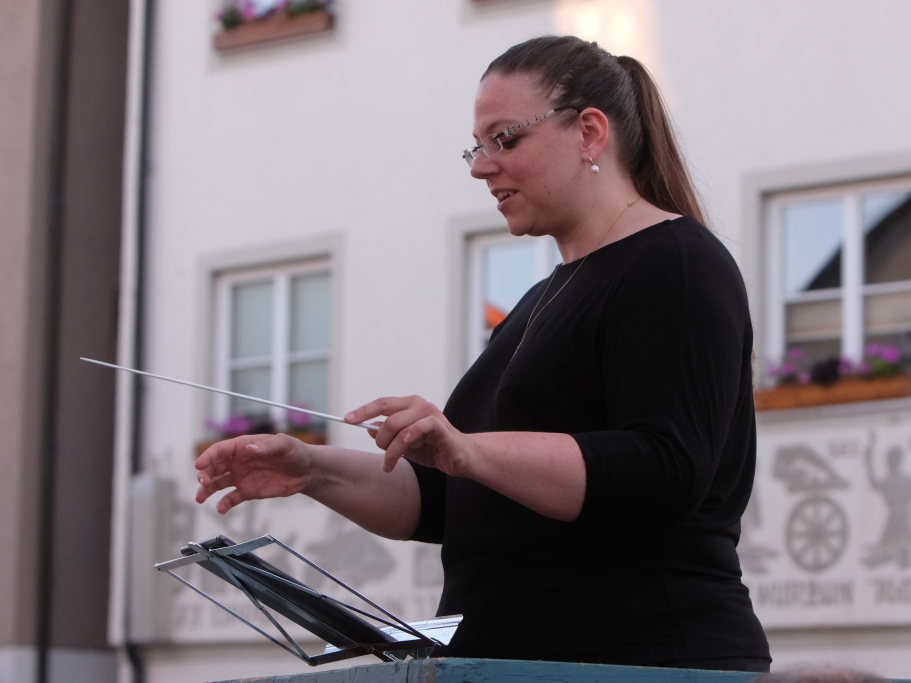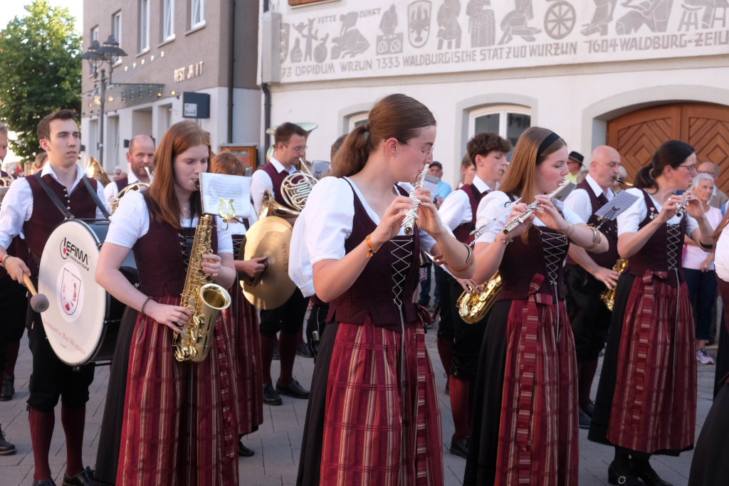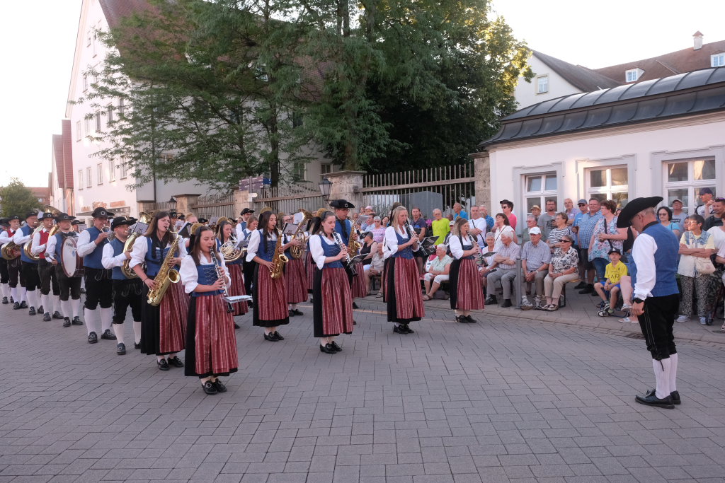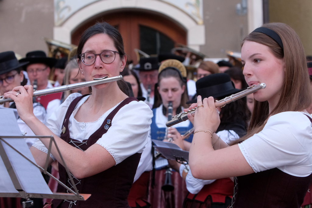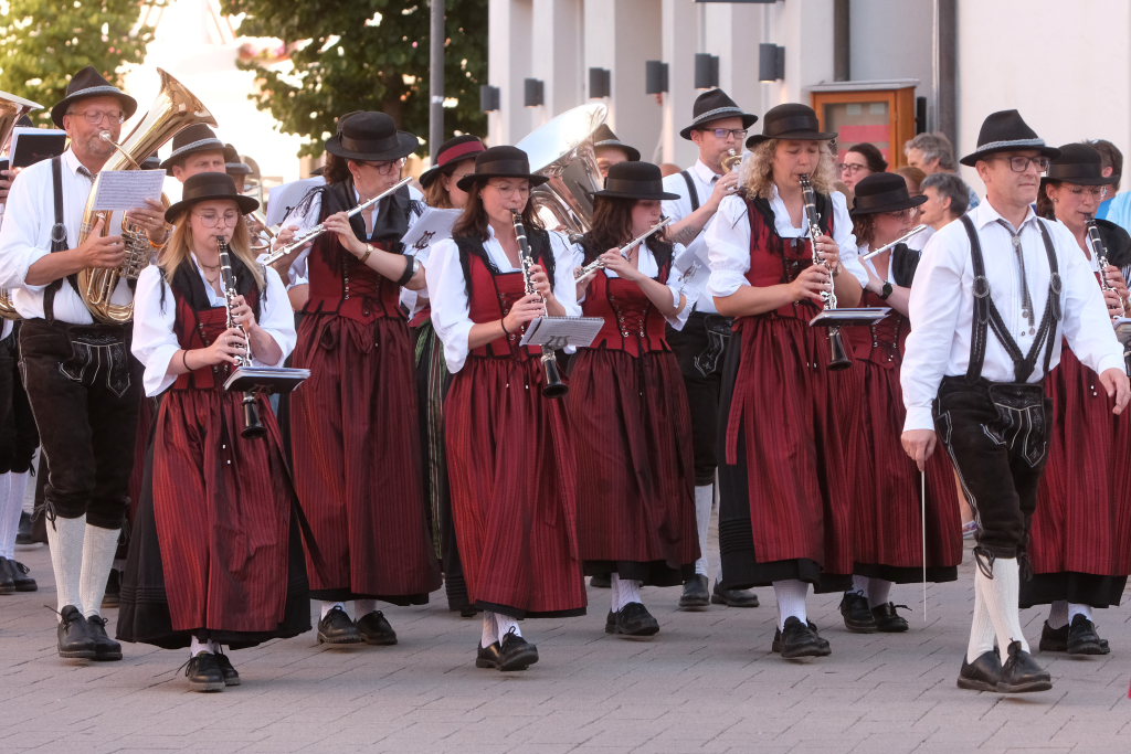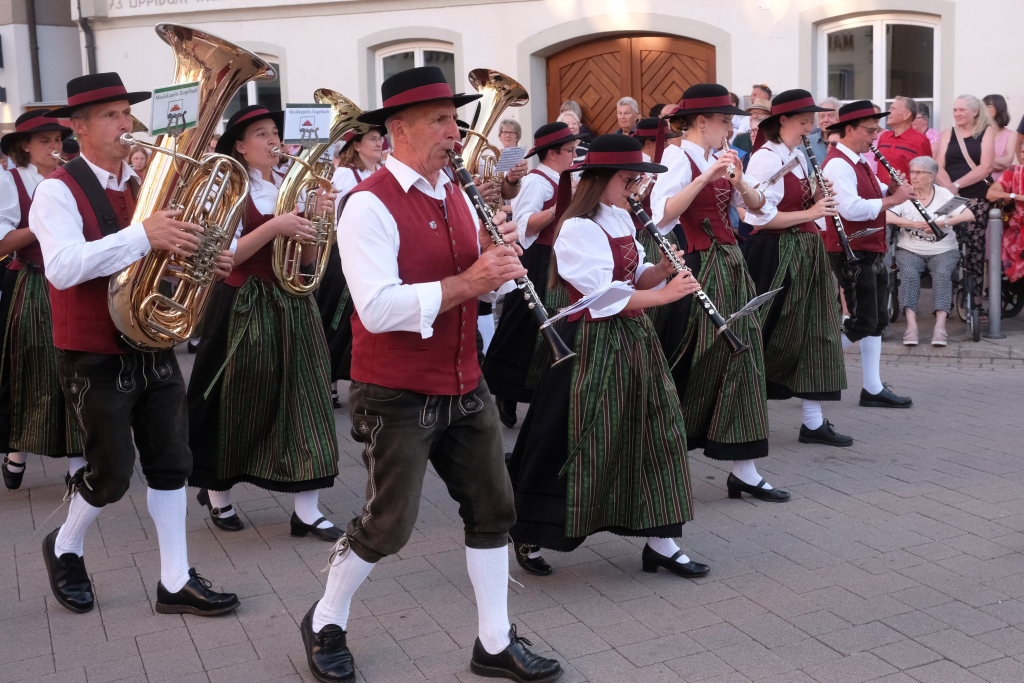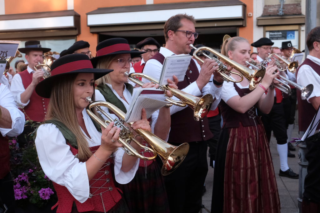 Bad Wurzach – Das Serenadenkonzert, zu dem sich alle Musikkapellen der Bad Wurzacher Gemeinden nach einem Sternmarsch zu einem Gesamtchor formieren, konnte endlich einmal wieder bei bestem Sommerwetter von Organisationsleiter Wolfgang Grösser organisiert werden, ohne dauernd auf die Wetter-App schielen zu müssen. Traditionell dirigiert den Gesamtchor die Leiterin der Jugendmusikschule, also heuer erstmals die neu im Amt befindliche Eva-Maria Oberleiter. Petra Springer, ihre Vorgängerin in dieser Funktion, führte die Stadtkapelle an.