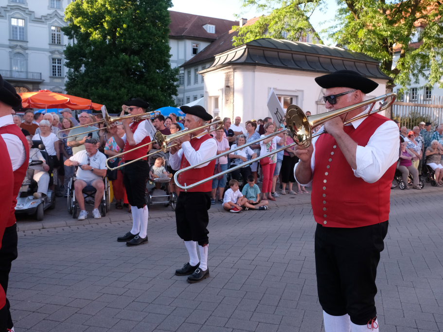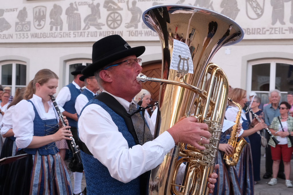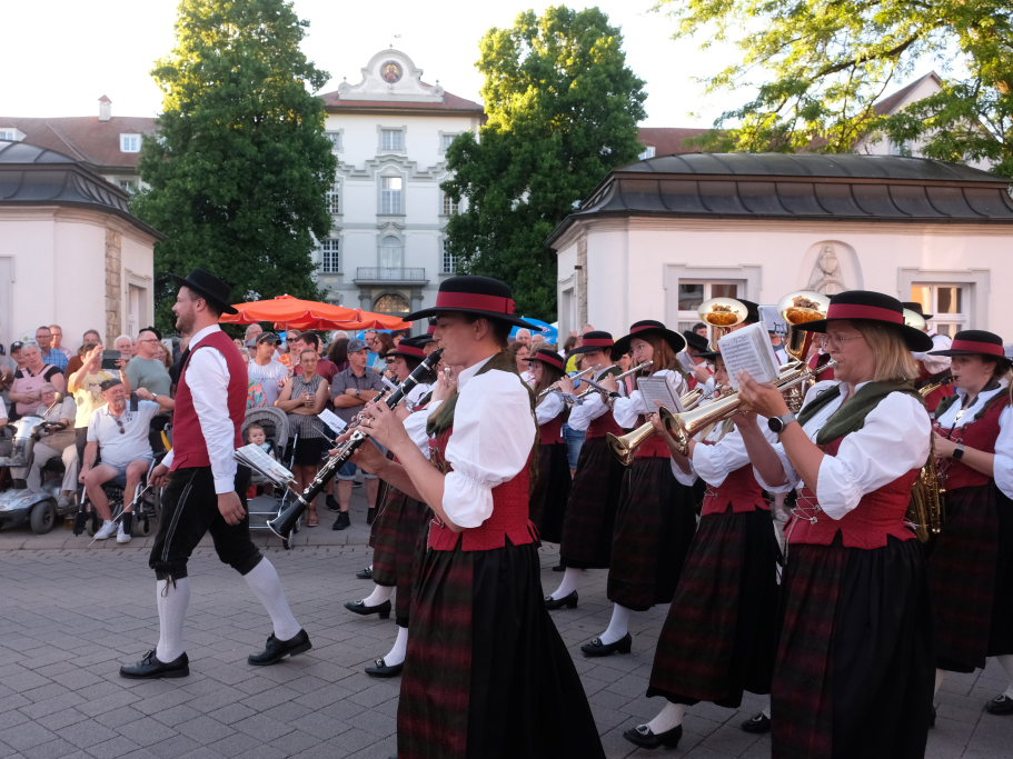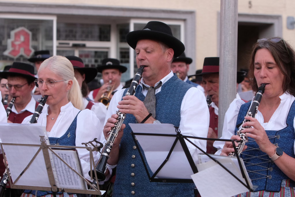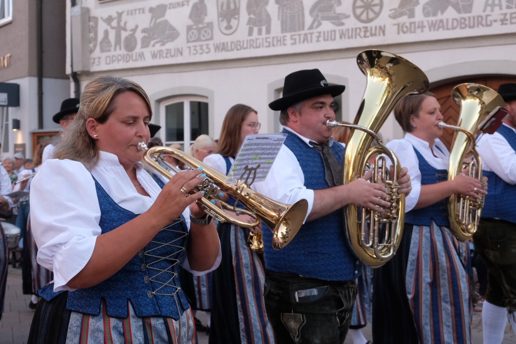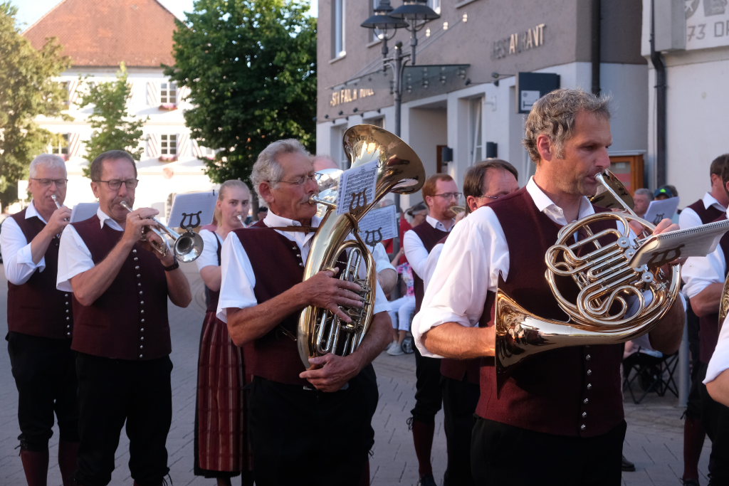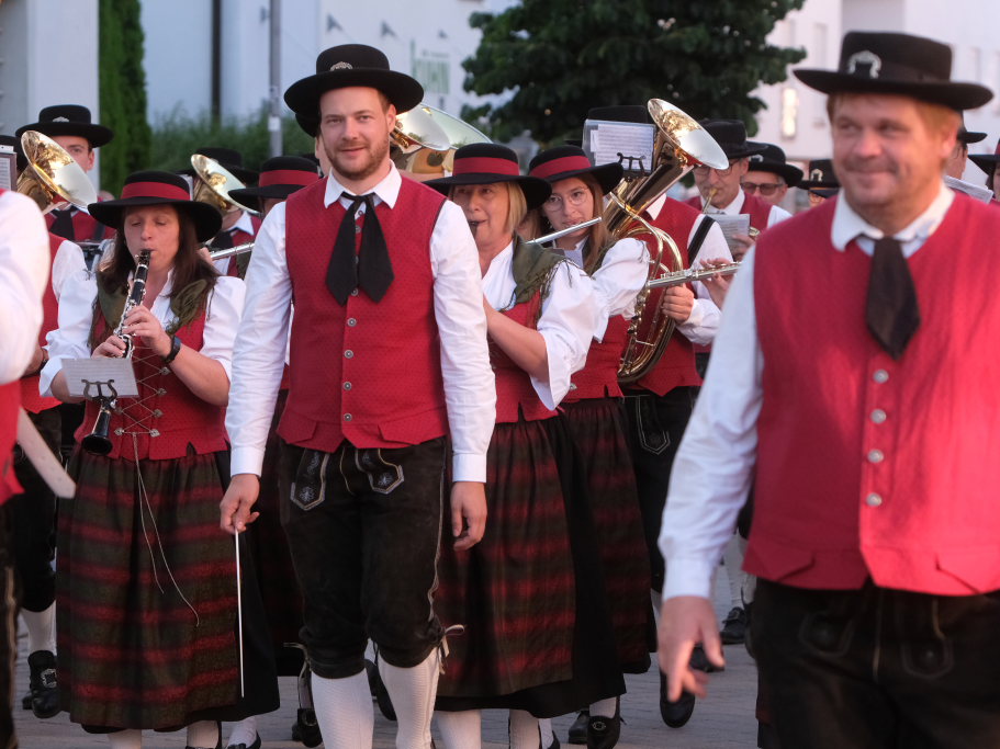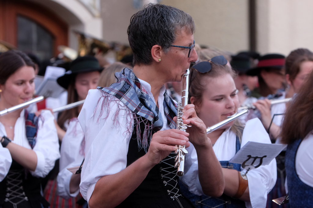 Bad Wurzach – Das Serenadenkonzert, zu dem sich alle Musikkapellen der Bad Wurzacher Gemeinden nach einem Sternmarsch zu einem Gesamtchor formieren, konnte endlich einmal wieder bei bestem Sommerwetter von Organisationsleiter Wolfgang Grösser organisiert werden, ohne dauernd auf die Wetter-App schielen zu müssen. Traditionell dirigiert den Gesamtchor die Leiterin der Jugendmusikschule, also heuer erstmals die neu im Amt befindliche Eva-Maria Oberleiter. Petra Springer, ihre Vorgängerin in dieser Funktion, führte die Stadtkapelle an.