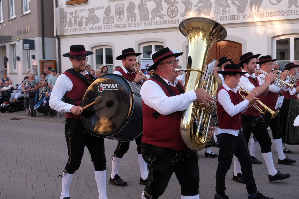 Die Stadtkapelle Bad Wurzach unter eben dieser Petra Springer eröffnete traditionsgemäß vom Amtshaus kommend den Sternenmarsch. Dabei spielte sie den Konzertmarsch Saint Triphon von Artur Ney. Rund um den Marienbrunnen, Rathaus und Schloss wurden sie schon von Vierer-Reihen von Zuhörern und -Sehern begrüßt.