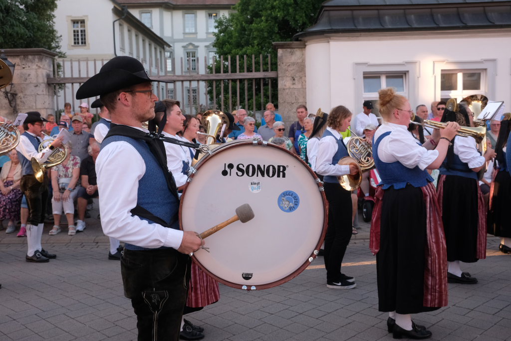 Im „geschützten“ Schlosshof jedenfalls bewiesen die zahlreich noch dagebliebenen Musiker sehr ausdauerndes „Sitzfleisch“ …