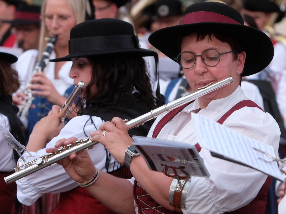 Alle Kapellen mit ihren etwa 350 Musikern traten mit kompletter Musikfestumzugs-Ausstattung – Fahne, Fahnenbegleitung, Namenstafel und Blumenkinder – an und boten damit einen beeindruckenden Anblick. Während die einzelnen Register sich formierten, bestieg Eva-Maria Oberleiter das Podium, um den Gesamtchor anzuleiten.