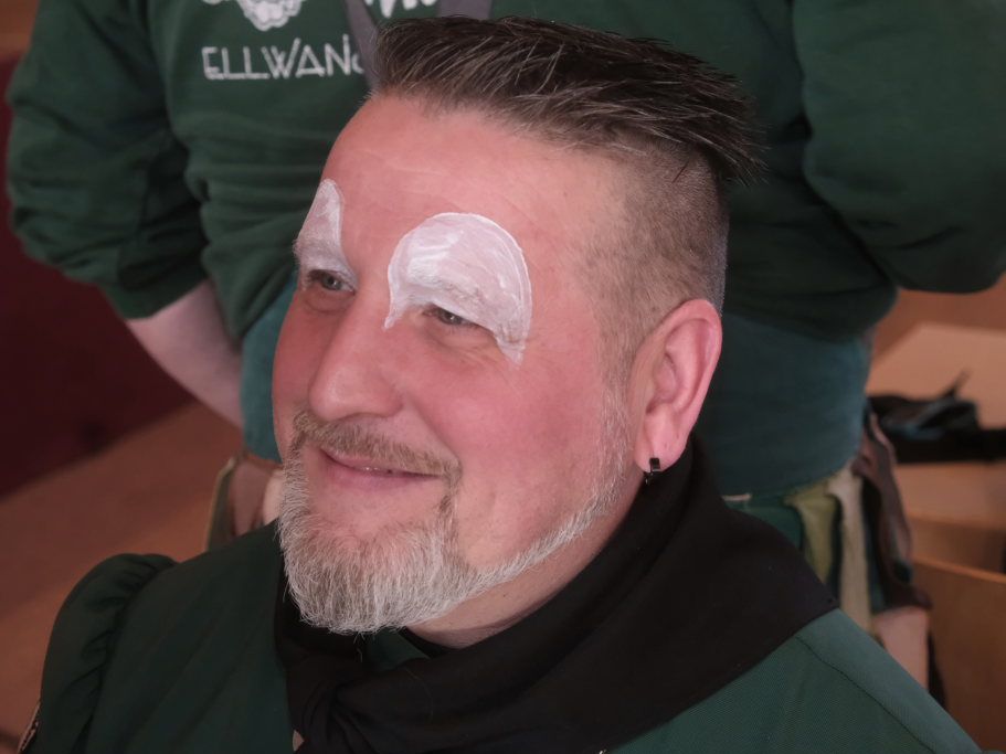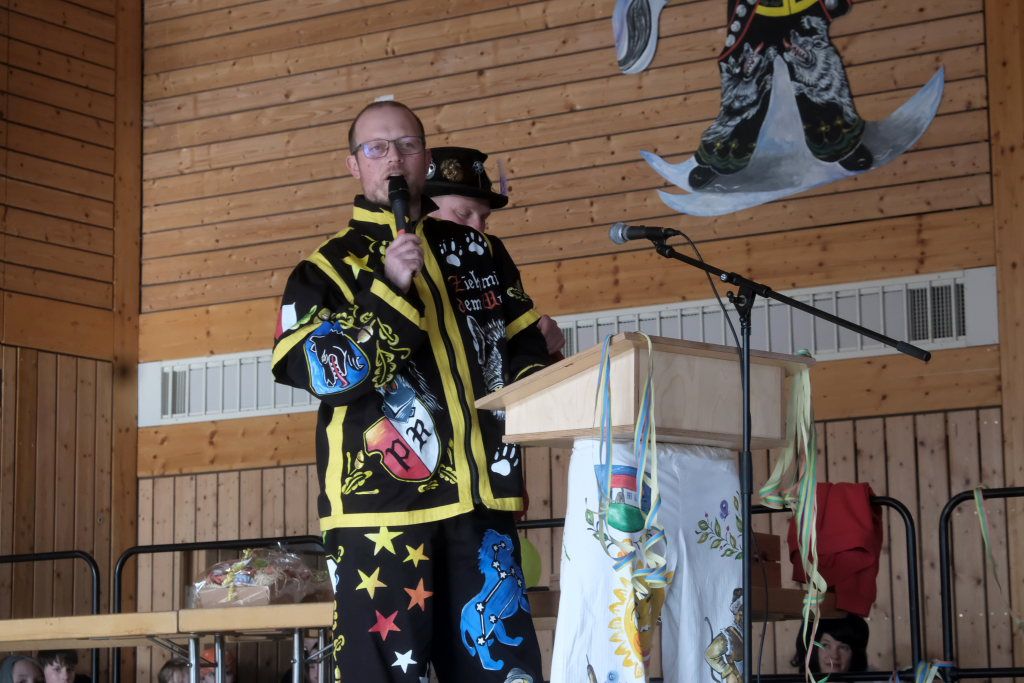 Die erste schwerere Prüfung erlegte „der Schwede“, Zunftmeister der Vogter Heufresser, dem Haidgauer Zunftmeister Daniel Wassner auf. Der dienstlich nicht an Dresscode-gemäßes Outfit gewohnte Zunftmeister (außer in der Fasnet!) sollte innerhalb weniger Minuten gleich mehrere Krawatten binden. Dabei konnte er natürlich sehr zum Gaudium des Publikums nur scheitern, zumal sich schon die erste – in Rot – die sich farblich mit der roten Weste der Haidgauer biss und am Hals von Wassner eher einer Schlinge, die sich nach und nach zuzieht, glich.