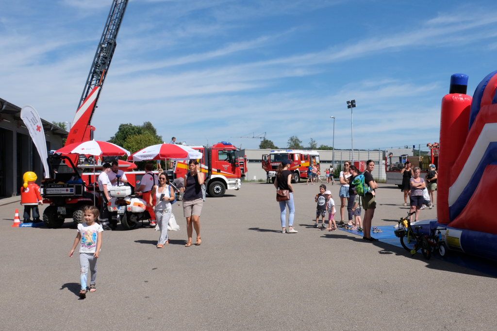 Viel Mühe hatte sich die Feuerwehr gegeben, um den Kindern ein paar schöne Stunden anbieten zu können. Für die kleinsten Blaulicht-Fans gab es viel Spaß in der Feuerwehr-Hüpfburg, die etwas Größeren konnten sich schon einmal auf ihre zukünftigen Aufgaben als Spritzenmeister vorbereiten. Die Jugendfeuerwehr sorgte für kalte und warme Getränke, aber auch für Abkühlung mit einem großen Sortiment an Eis. Natürlich war für die Jugendfeuerwehr die Gelegenheit günstig, an diesem Tag im Vorgriff auf das allseits beliebte Quietsche-Entenrennen am Stadtfest im Vorverkauf bereits die ersten der gelben Entchen zu verkaufen. Später dann waren auch die Fahrzeuge der Wehr, die am Vorabend noch bei einer großen Übung im Einsatz waren, von großem Interesse.