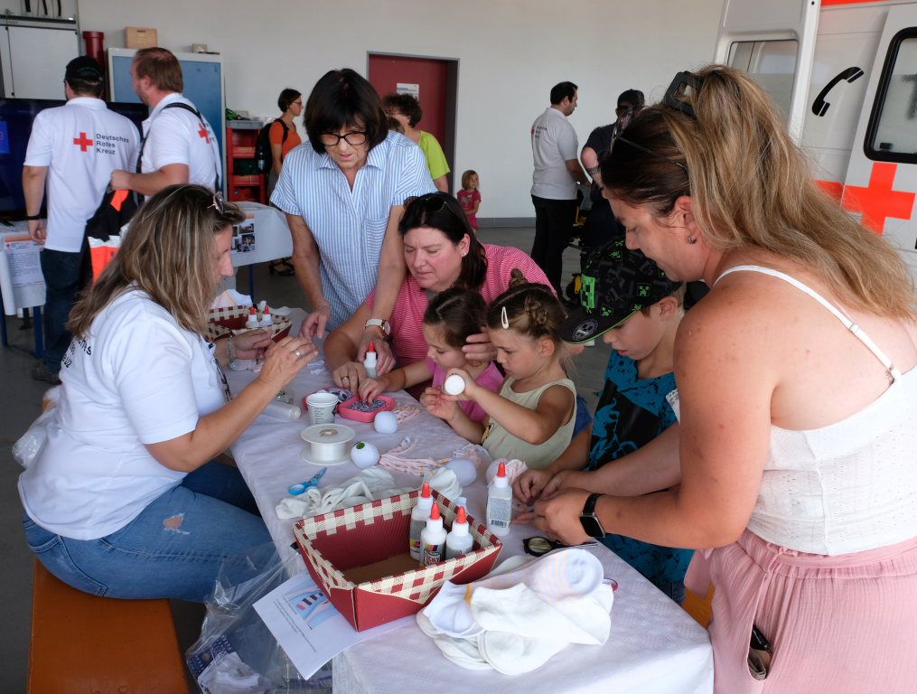 Stark umlagert waren immer die Stände des DRK. Hier konnte man sich schminken lassen, ein Tattoo auf den Arm malen lassen oder wie einige der Jugendlichen des JRK und der Feuerwehr am Vorabend, sich Verletzungen und Wunden auf die Haut schminken lassen. Der große Renner am Basteltisch war jedoch ein Oktopus, eine Krake, die mit schönen Schmucksteinen verziert zum Kuscheltier werden konnte.