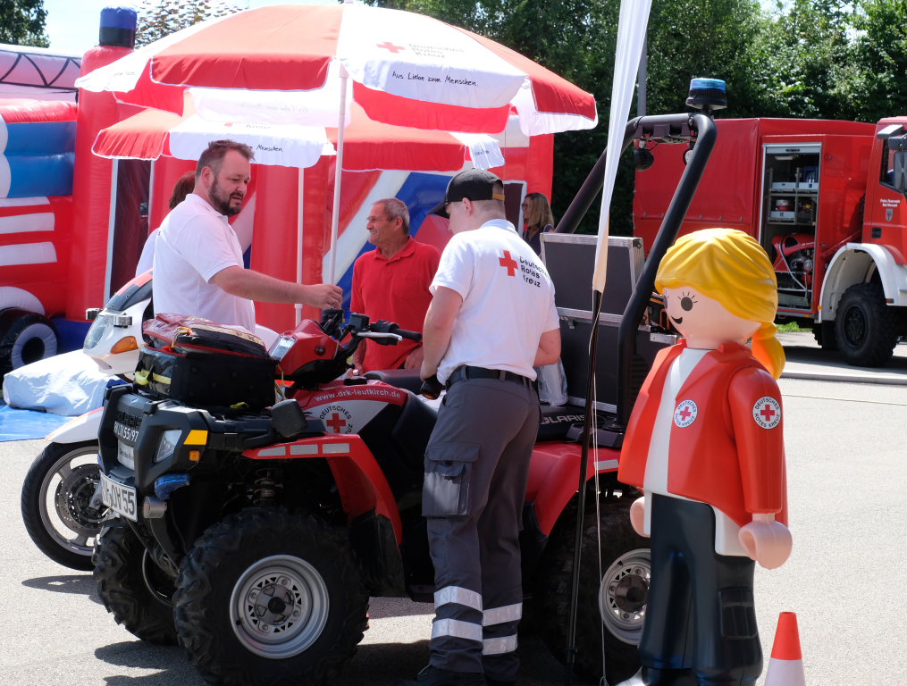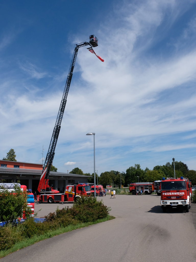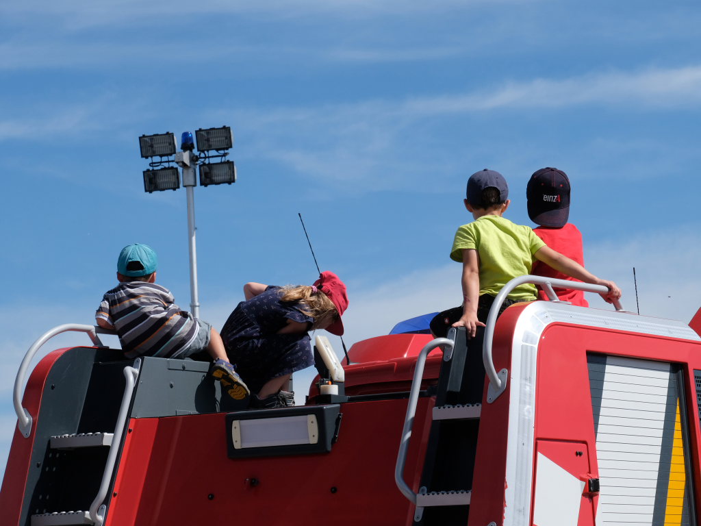 Der absolute Hit war natürlich die Drehleiter, auch wenn eine „Besteigung“ der Leiter wie in früheren Jahren aus Sicherheitsgründen nicht mehr möglich war. Dafür konnten die Kinder dem Fahrzeug selbst aufs Dach steigen und die Aussicht auf diesem bei der für die Kleinen schon bedeutende Höhe genießen.