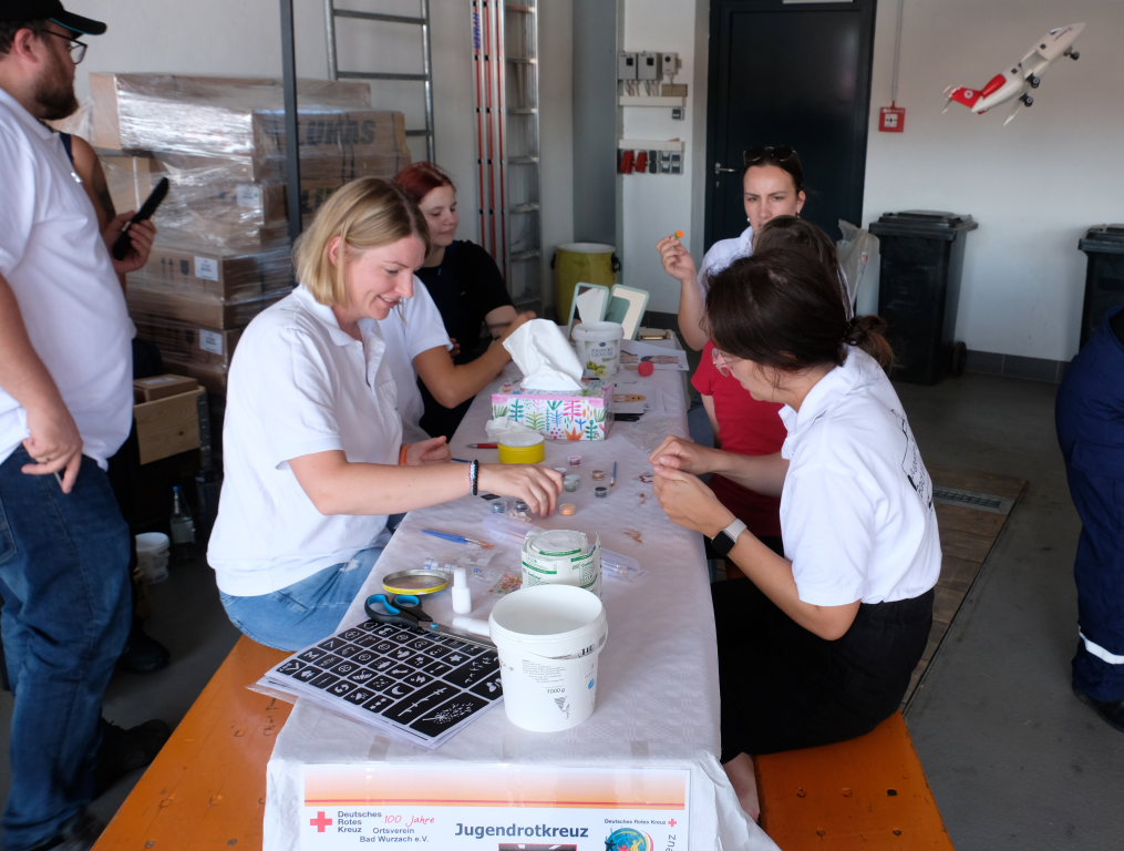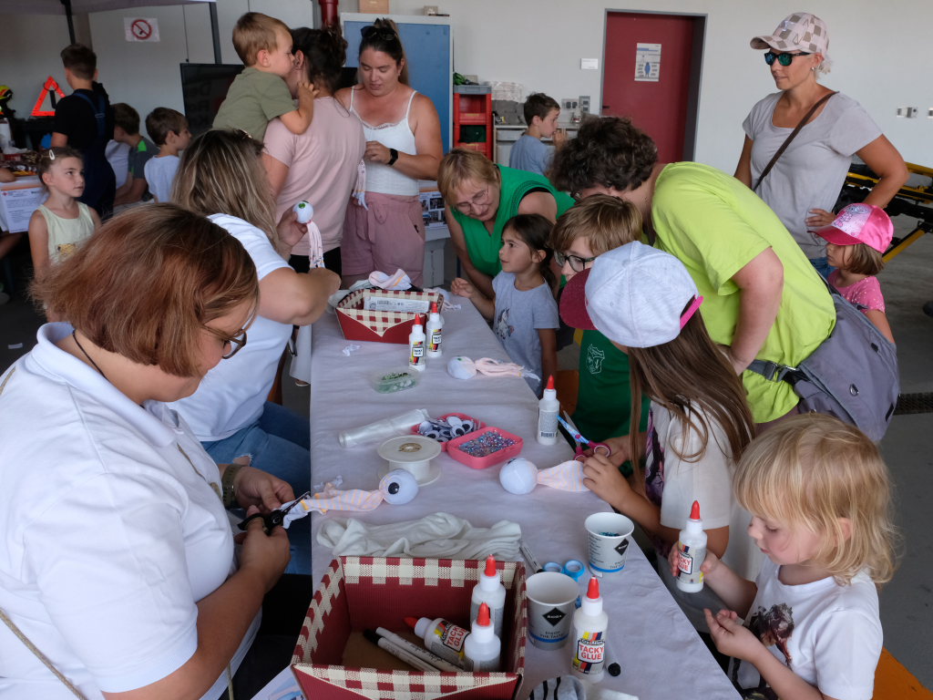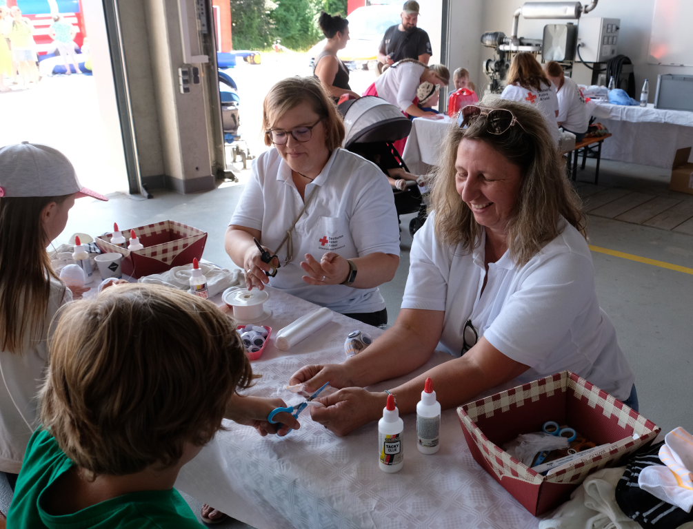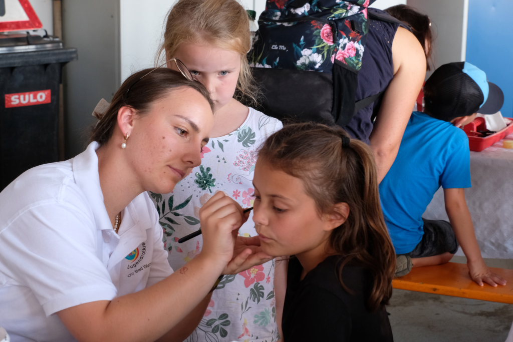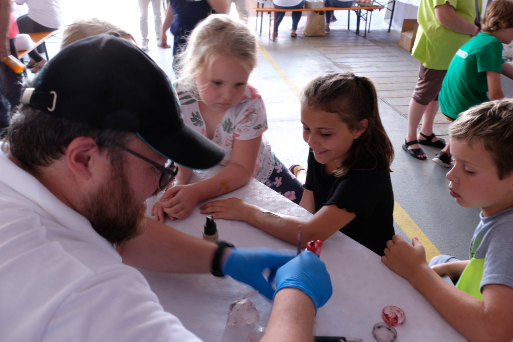 Stark umlagert waren immer die Stände des DRK. Hier konnte man sich schminken lassen, ein Tattoo auf den Arm malen lassen oder wie einige der Jugendlichen des JRK und der Feuerwehr am Vorabend, sich Verletzungen und Wunden auf die Haut schminken lassen. Der große Renner am Basteltisch war jedoch ein Oktopus, eine Krake, die mit schönen Schmucksteinen verziert zum Kuscheltier werden konnte.