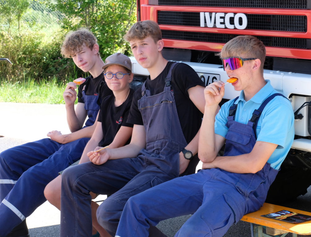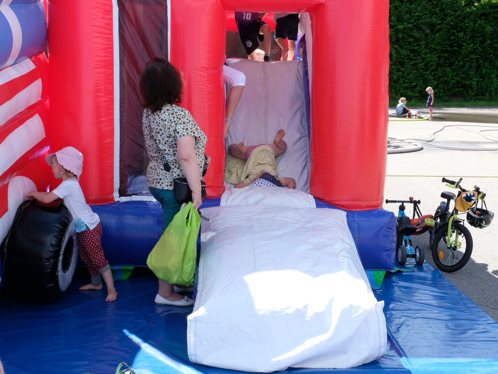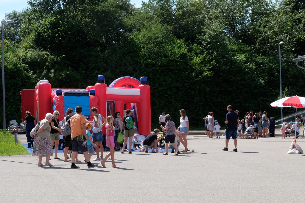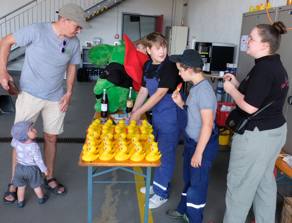 Viel Mühe hatte sich die Feuerwehr gegeben, um den Kindern ein paar schöne Stunden anbieten zu können. Für die kleinsten Blaulicht-Fans gab es viel Spaß in der Feuerwehr-Hüpfburg, die etwas Größeren konnten sich schon einmal auf ihre zukünftigen Aufgaben als Spritzenmeister vorbereiten. Die Jugendfeuerwehr sorgte für kalte und warme Getränke, aber auch für Abkühlung mit einem großen Sortiment an Eis. Natürlich war für die Jugendfeuerwehr die Gelegenheit günstig, an diesem Tag im Vorgriff auf das allseits beliebte Quietsche-Entenrennen am Stadtfest im Vorverkauf bereits die ersten der gelben Entchen zu verkaufen. Später dann waren auch die Fahrzeuge der Wehr, die am Vorabend noch bei einer großen Übung im Einsatz waren, von großem Interesse.