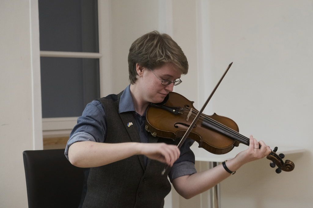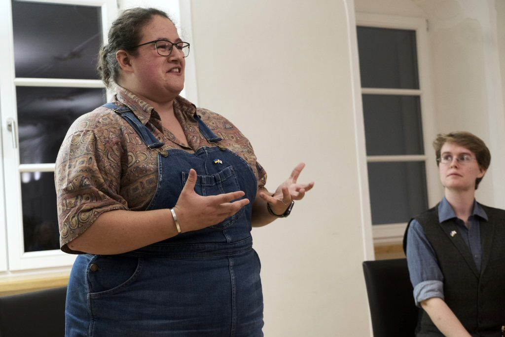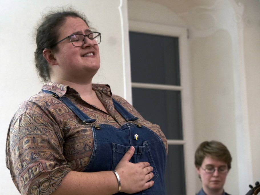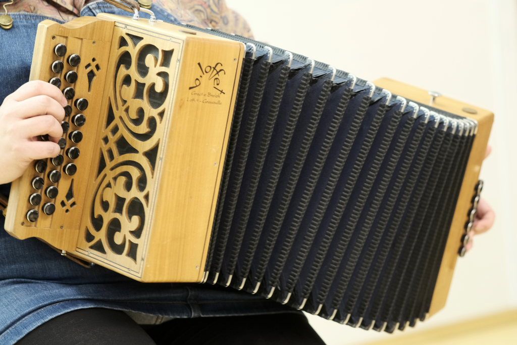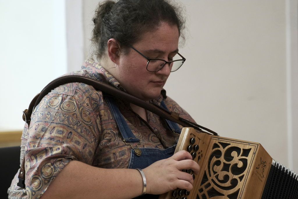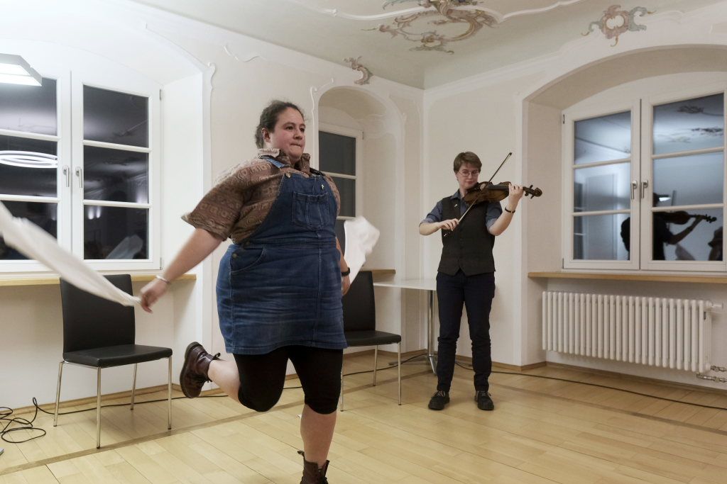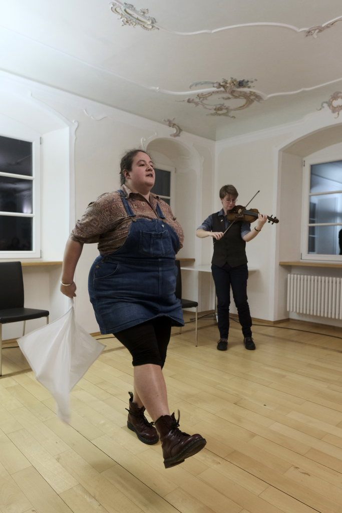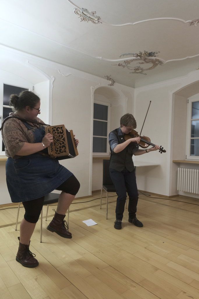 Ob mit Sologesang von Anne Blin-Bolt ohne Instrumentalbegleitung, ob bei einem reinem Instrumental mit Melodeon und Geige, die Beiden zeigten bei jedem Stück, mit wieviel Herzblut sie ihrer Profession nachgehen. Und das nicht nur instrumental. Annie Blin-Bolt ließ auch bei einem Tanz das Parkett des Kapitelsaals erzittern. „Der Morris-Dance ist ein traditioneller englischer Tanz, der seit dem 16. Jahrhundert getanzt wird”, erklärte Annie Blin-Bolt nach dem Konzert. „Ich habe einen Morris-Tanz vorgeführt, bei dem Taschentücher und Glöckchen Teil der Performance sind.“ Der Tanz heiße „To Town with a Pushang“, der von den BELLES AND BROOMSTICKS-Morris-Dancers im Jahre 2020 auf Guernsey kreiert wurde. Diese Art Tanz konnten Interessierte von den beiden Musikerinnen, die auf Einladung des Biberach Partnerschaftsvereines in der Gegend weilten, am nächsten Tag bei einem Workshop im Gemeindehaus von St. Martin in Biberach lernen, erklärte eine Vertreterin des dortigen Partnerschaftsvereines.