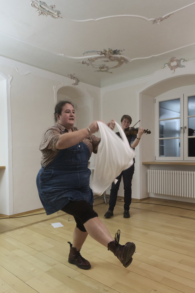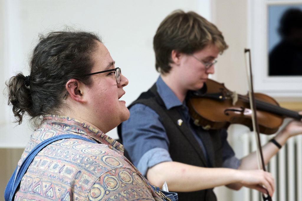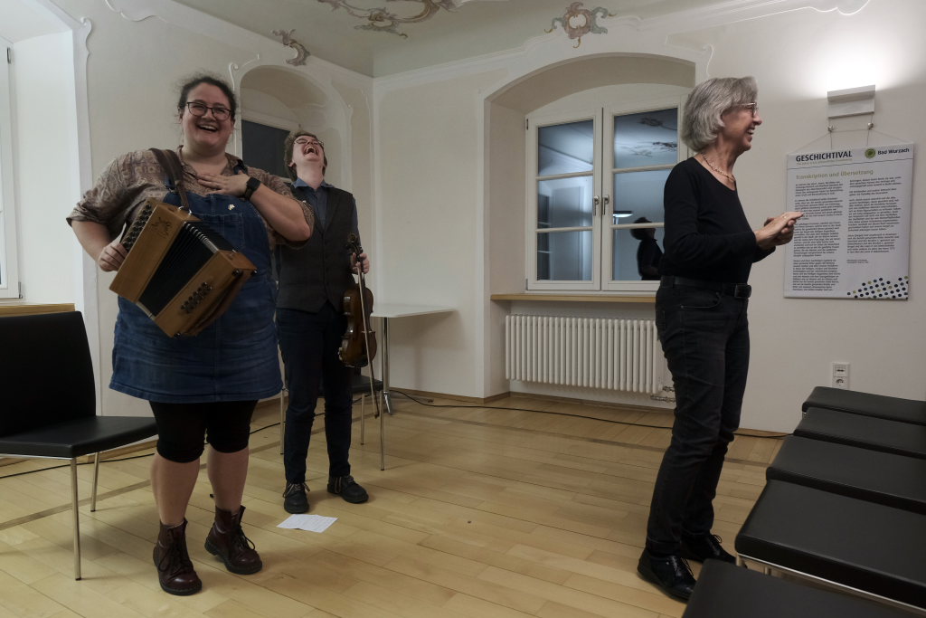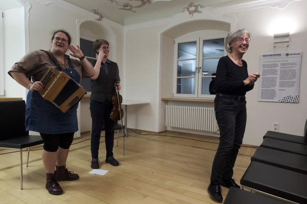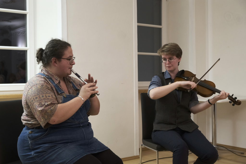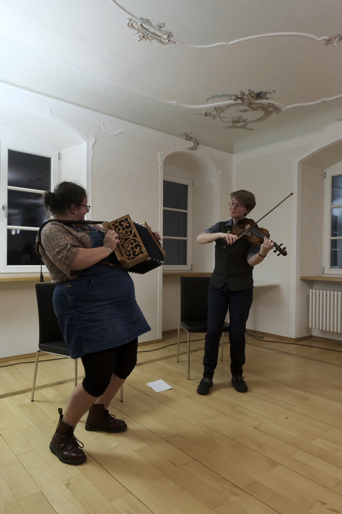 Ob mit Sologesang von Anne Blin-Bolt ohne Instrumentalbegleitung, ob bei einem reinem Instrumental mit Melodeon und Geige, die Beiden zeigten bei jedem Stück, mit wieviel Herzblut sie ihrer Profession nachgehen. Und das nicht nur instrumental. Annie Blin-Bolt ließ auch bei einem Tanz das Parkett des Kapitelsaals erzittern. „Der Morris-Dance ist ein traditioneller englischer Tanz, der seit dem 16. Jahrhundert getanzt wird”, erklärte Annie Blin-Bolt nach dem Konzert. „Ich habe einen Morris-Tanz vorgeführt, bei dem Taschentücher und Glöckchen Teil der Performance sind.“ Der Tanz heiße „To Town with a Pushang“, der von den BELLES AND BROOMSTICKS-Morris-Dancers im Jahre 2020 auf Guernsey kreiert wurde. Diese Art Tanz konnten Interessierte von den beiden Musikerinnen, die auf Einladung des Biberach Partnerschaftsvereines in der Gegend weilten, am nächsten Tag bei einem Workshop im Gemeindehaus von St. Martin in Biberach lernen, erklärte eine Vertreterin des dortigen Partnerschaftsvereines.